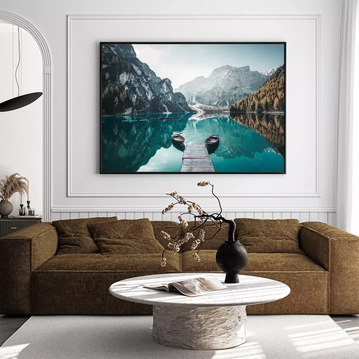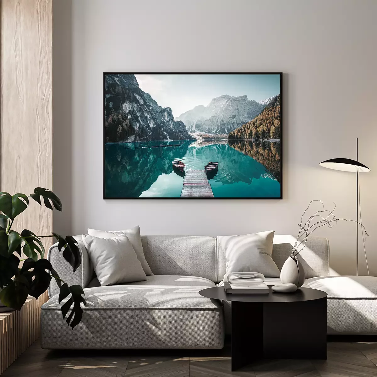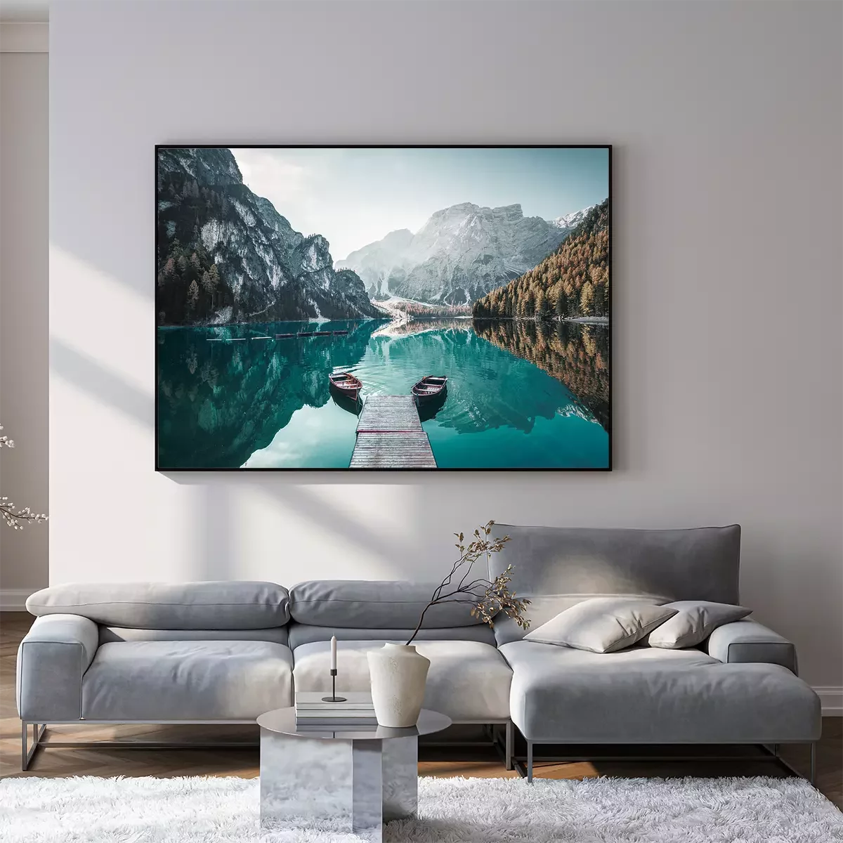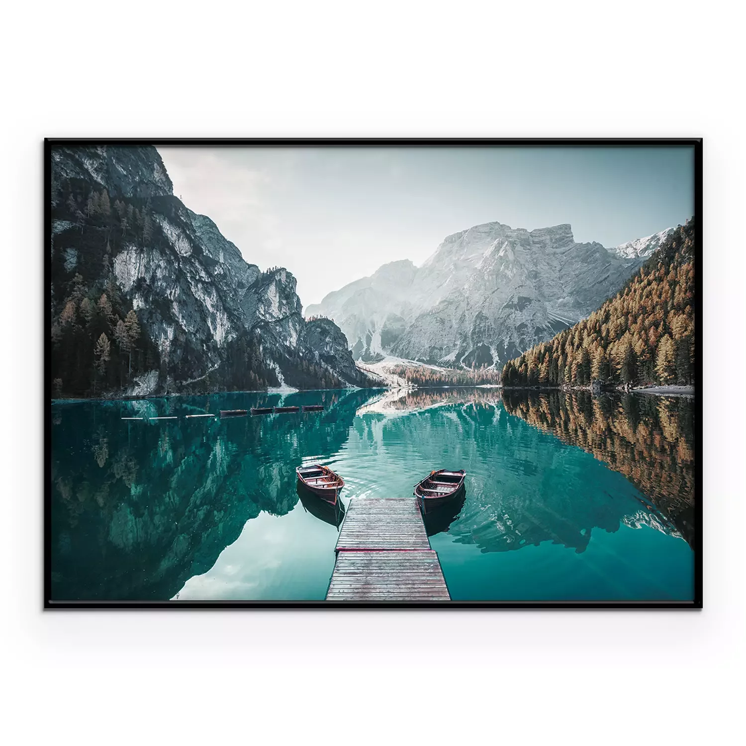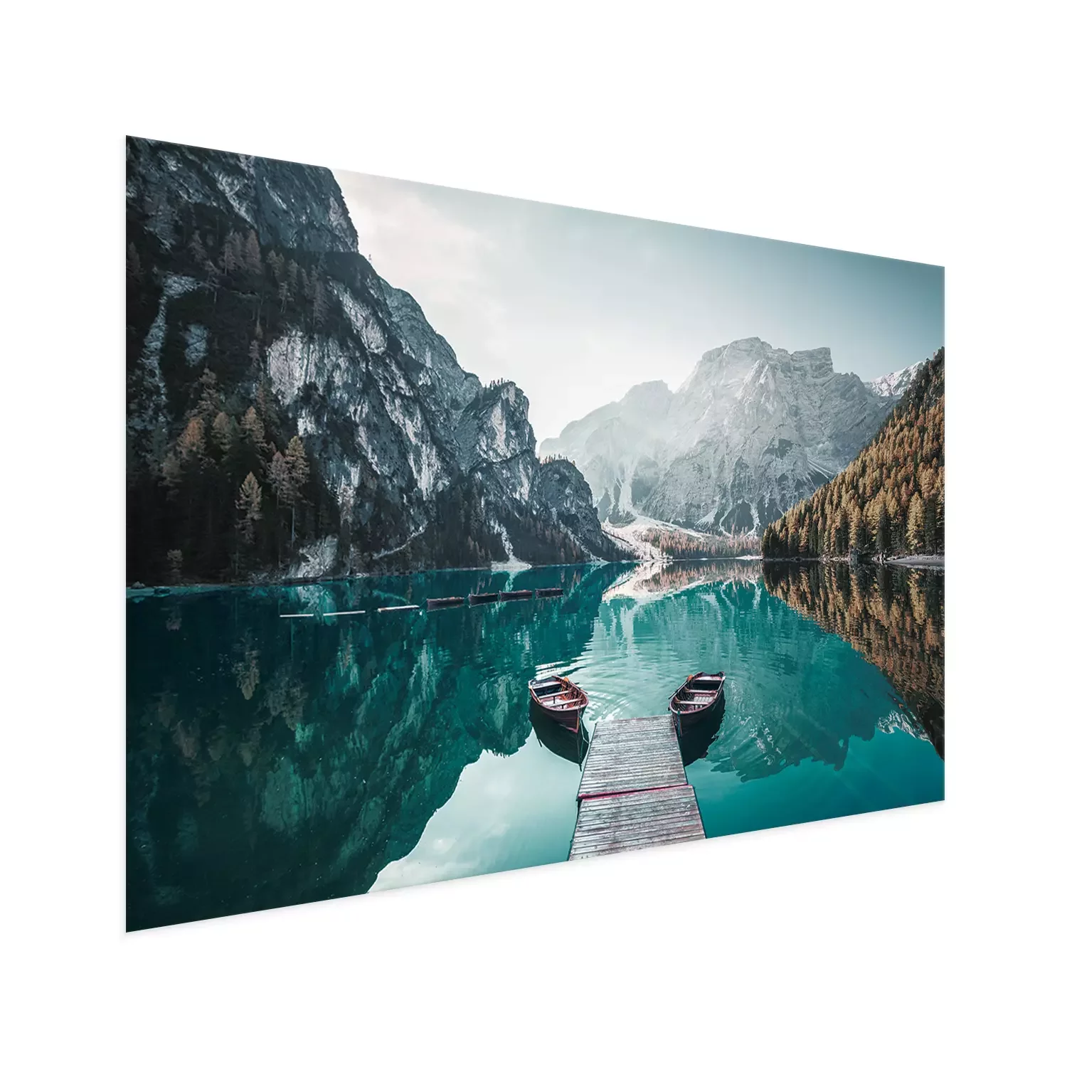 Poster: Holzboote und Steg auf einem Bergsee