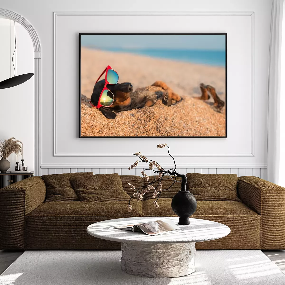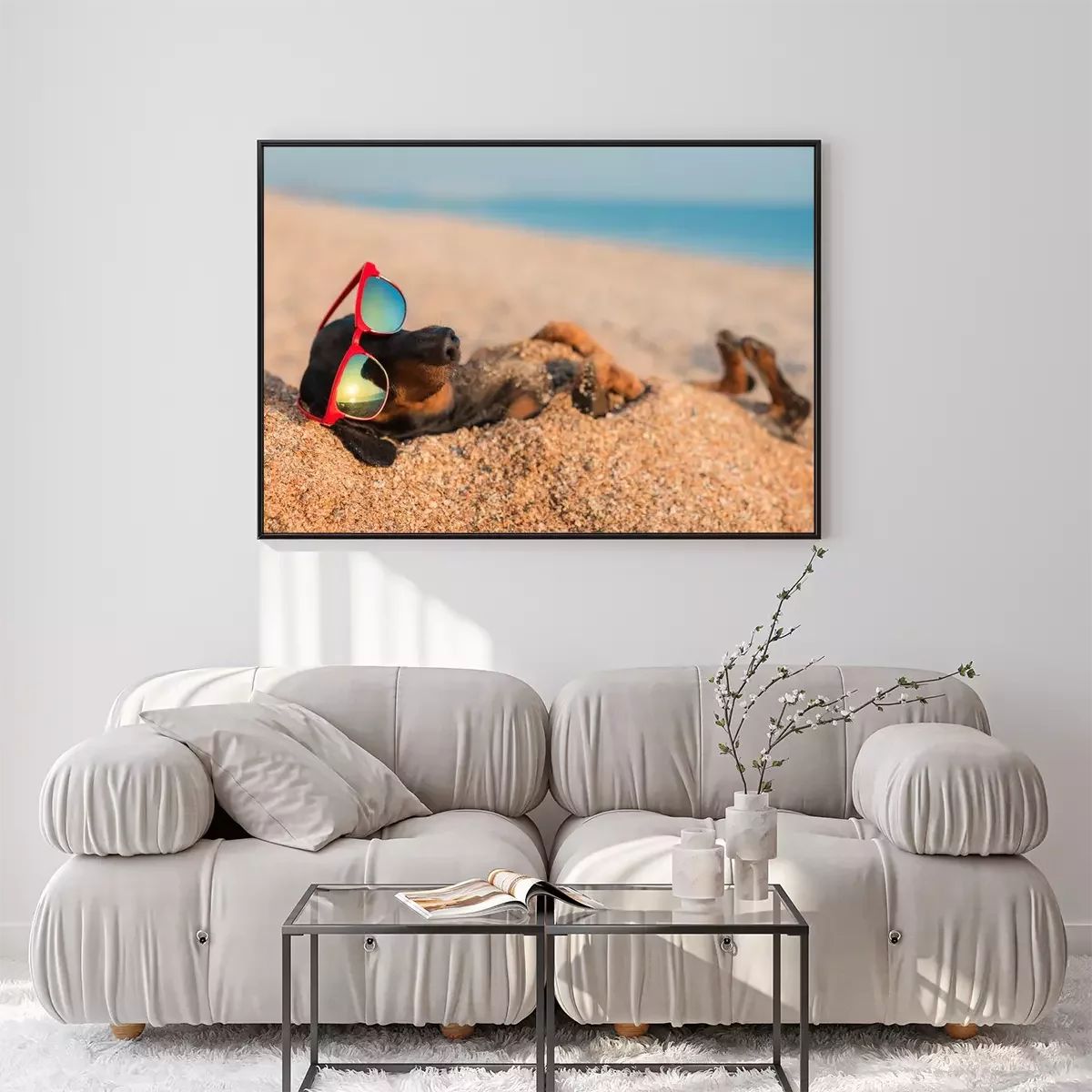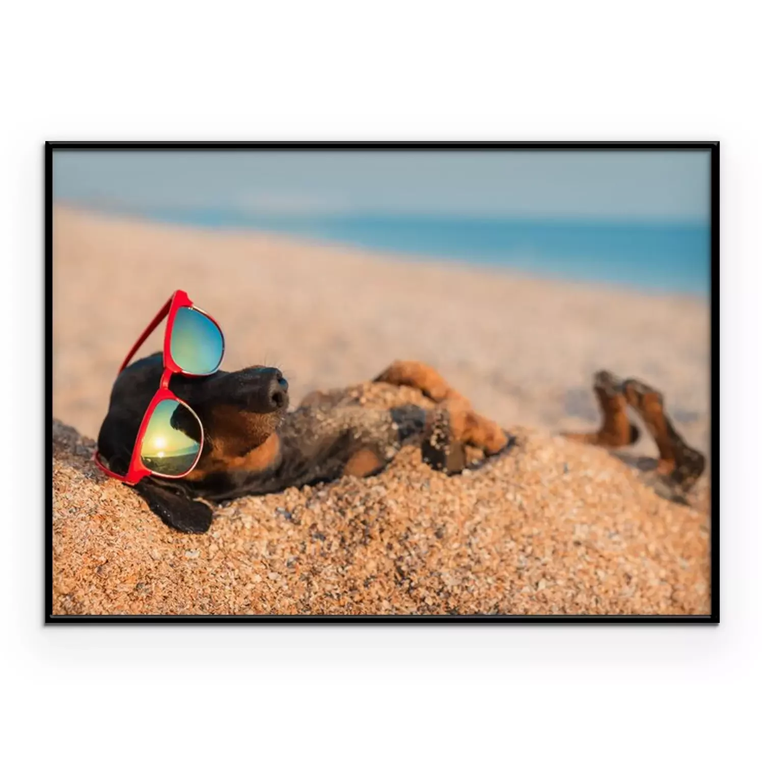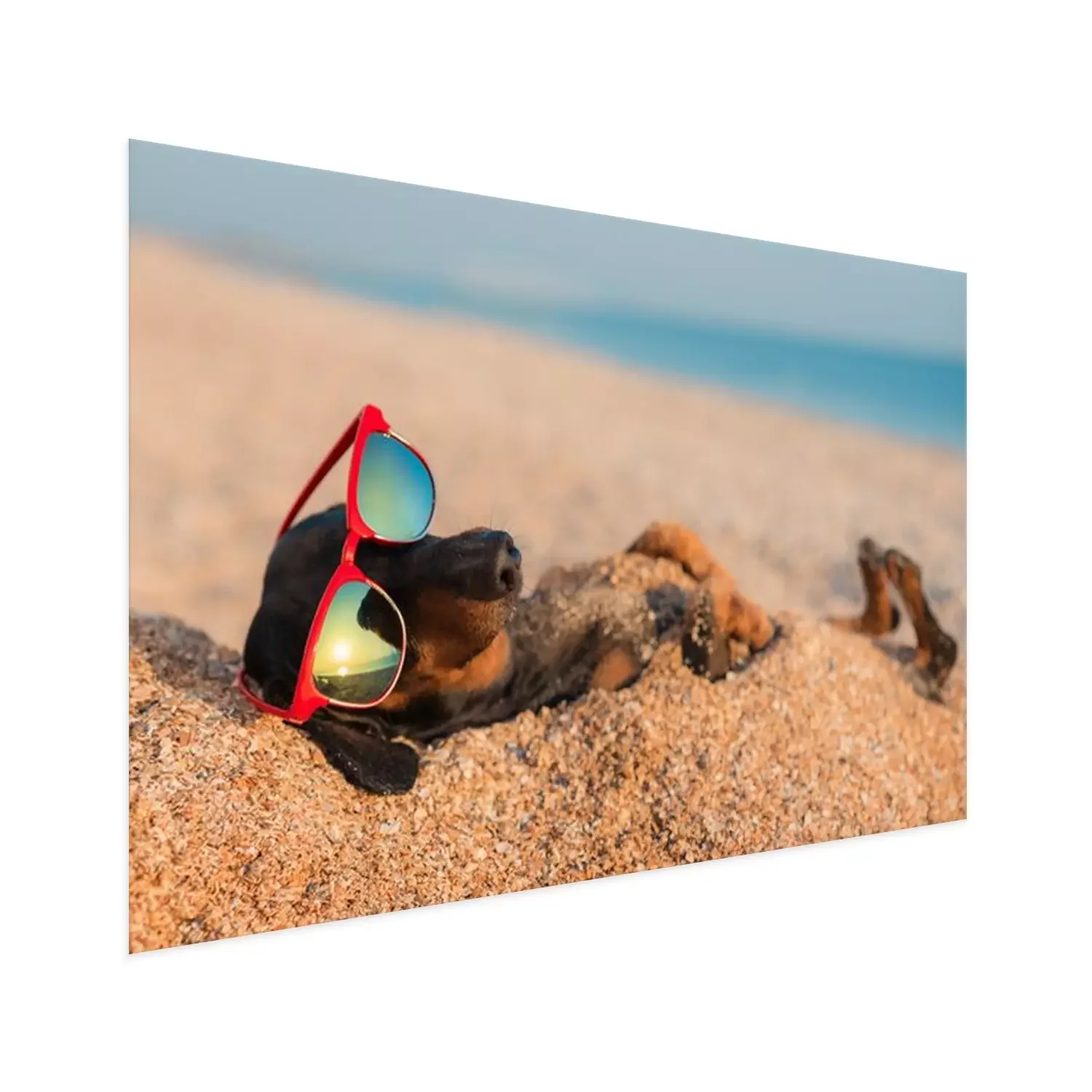 Poster: Hund mit Brille im Sand vergraben