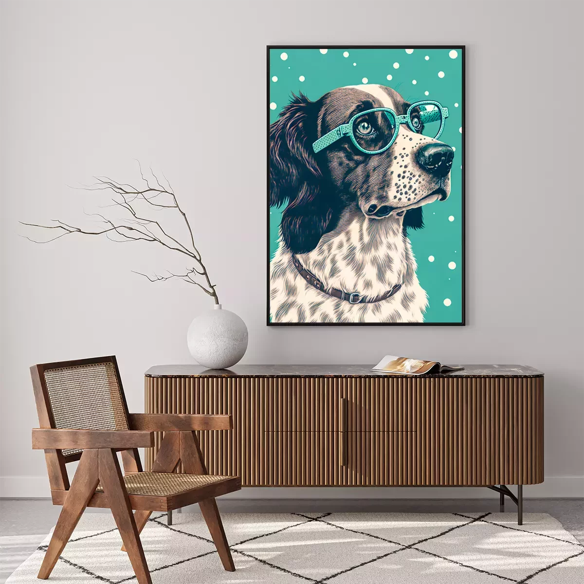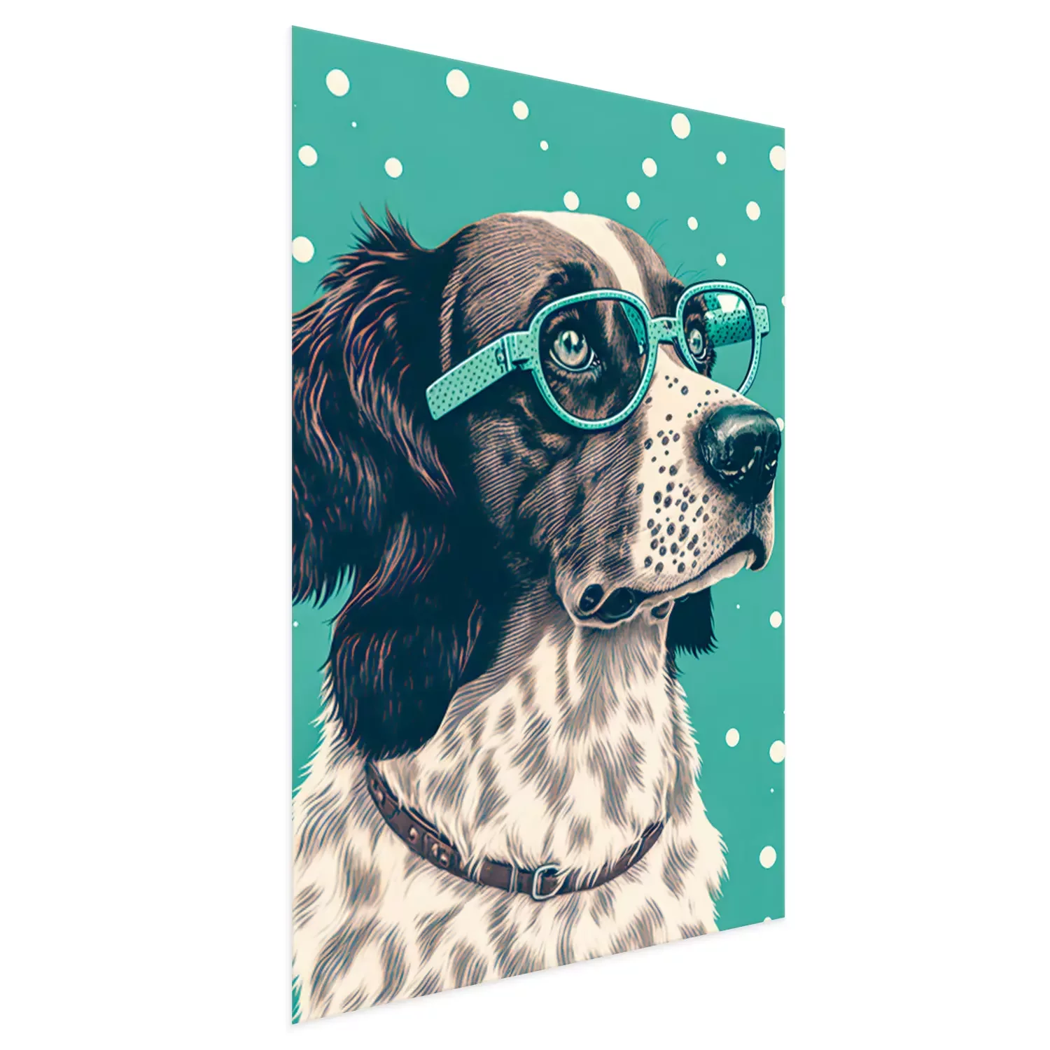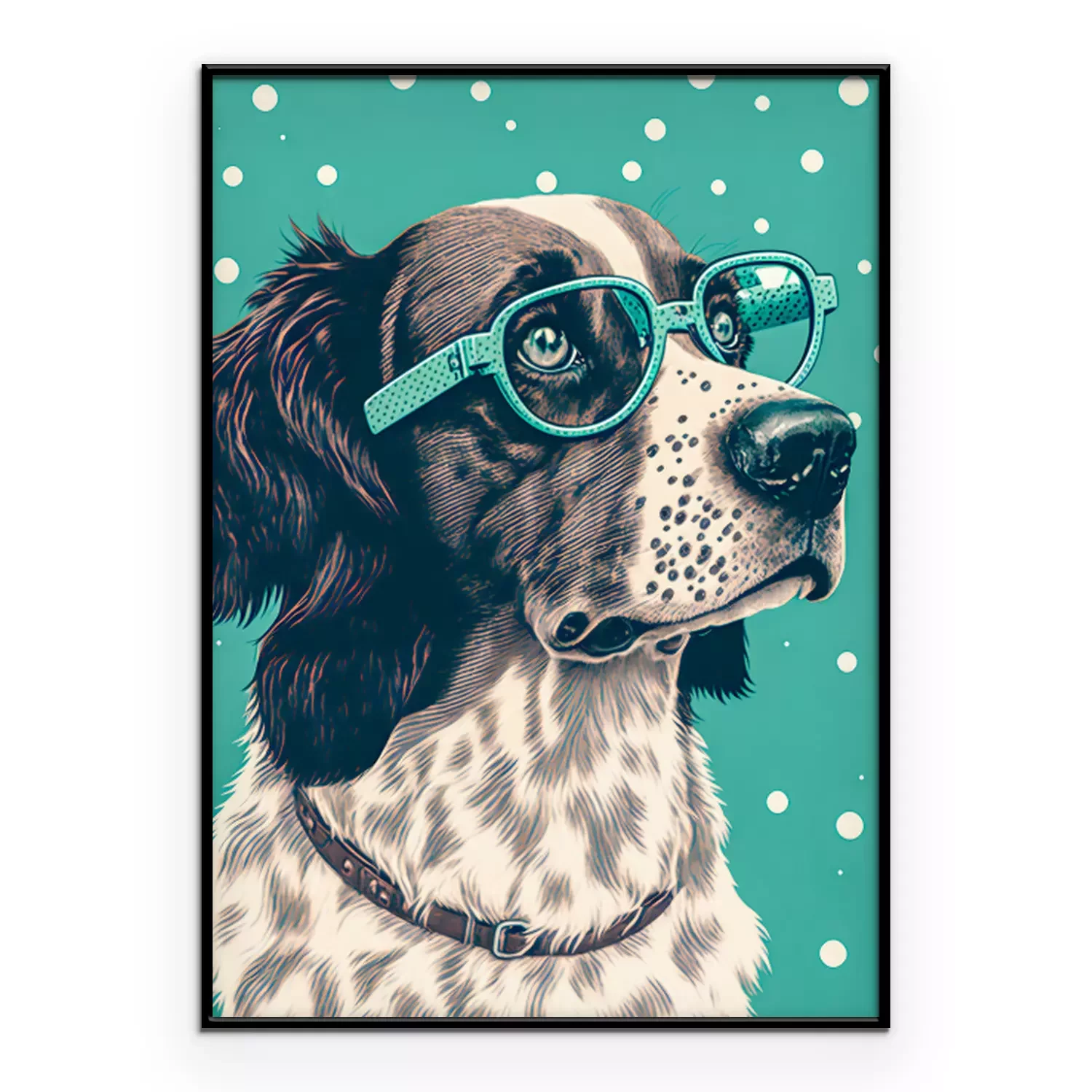 Wer ist der beste Freund des Menschen? Natürlich der Hund! Ein Poster mit einem entzückenden Vierbeiner ist die ideale Lösung für alle Tierliebhaber. Obwohl es den Anschein haben könnte, dass Hundeposter in erster Linie zur Dekoration eines Kinder- oder Jugendzimmers dienen, da die Motive oft recht kindlich sind, ist dies hier nicht der Fall. Wir haben uns zwar für cartoonartige Poster Hunde entschieden. Der Hund ist auf der Illustration dargestellt, aber das bedeutet nicht, dass es sich um eine kindliche Dekoration handelt. Das Design zeichnet sich durch einen Retro-Look aus – durch das realistische Porträt und den Tupfenhintergrund – genau das macht Poster mit Hunden zu einer äußerst vielseitigen Option. Ein Hund in dieser Ausführung präsentiert sich hervorragend in einem Wohnzimmer, das im Vintage-Stil eingerichtet ist und Möbel enthält, die von der Epoche Mid-century modern inspiriert worden sind. Gleichzeitig ist dies auch ein idealer Vorschlag für eine moderne Gestaltung in Grau- oder Brauntönen. Ein großer Vorteil unserer Hundeposter ist die Farbgebung. Auf der einen Seite ist das Design gedämpft, auf der anderen Seite verleiht das Mintgrün dem Ganzen Ausdruck und Charakter, wodurch die Darstellung die Aufmerksamkeit auf sich zieht. Bei der Dekoration von Innenräumen sollte man nicht zu ernst vorgehen, denn so können interessante Ergebnisse erzielt werden – und unsere Poster Hunde sind ein großartiges Beispiel dafür. Hunde sind für viele von uns Familienmitglieder, und ein cartoonartiges Porträt an der Wand unterstreicht die Liebe zu diesen Tieren. Die Dekoration schmückt also nicht nur die Wand, sondern ist auch ein Detail, das zeigt, was uns wichtig ist. Hundeposter sehen auch in Jugendzimmern hervorragend aus. Der Comic-Charakter des Designs macht es zu einem Vorschlag, der viele junge Hundeliebhaber anspricht. Das gleiche Design kann auch im Kinderzimmer verwendet werden, denn auch die Kleinen werden diese Art von Postern lieben. Das lustige Porträt eines Hundes mit dick gerahmter Brille zaubert ein Lächeln ins Gesicht des Kindes. Wenn Ihr kleiner Sprössling ein Hundeliebhaber ist, beschränken Sie sich nicht auf eine Wanddekoration, sondern wählen Sie drei Hund Poster aus. Hunde in Form von lustigen Illustrationen können ein Triptychon über dem Schreibtisch bilden, an dem das Kind zeichnet und Hausaufgaben macht, oder über dem Bettchen, wenn es nicht gerne schlafen geht und sich in der Gesellschaft von Hunden wohler fühlt.