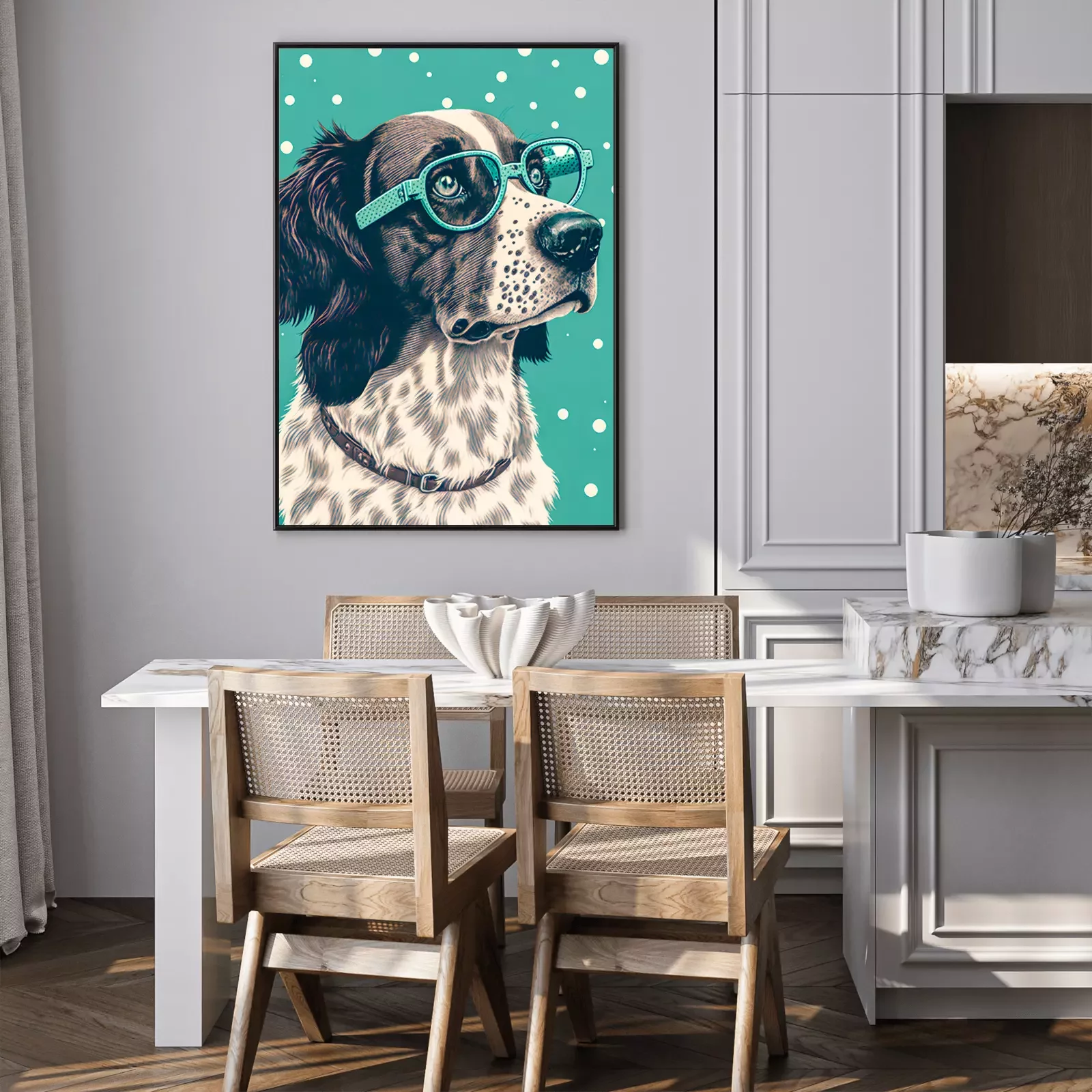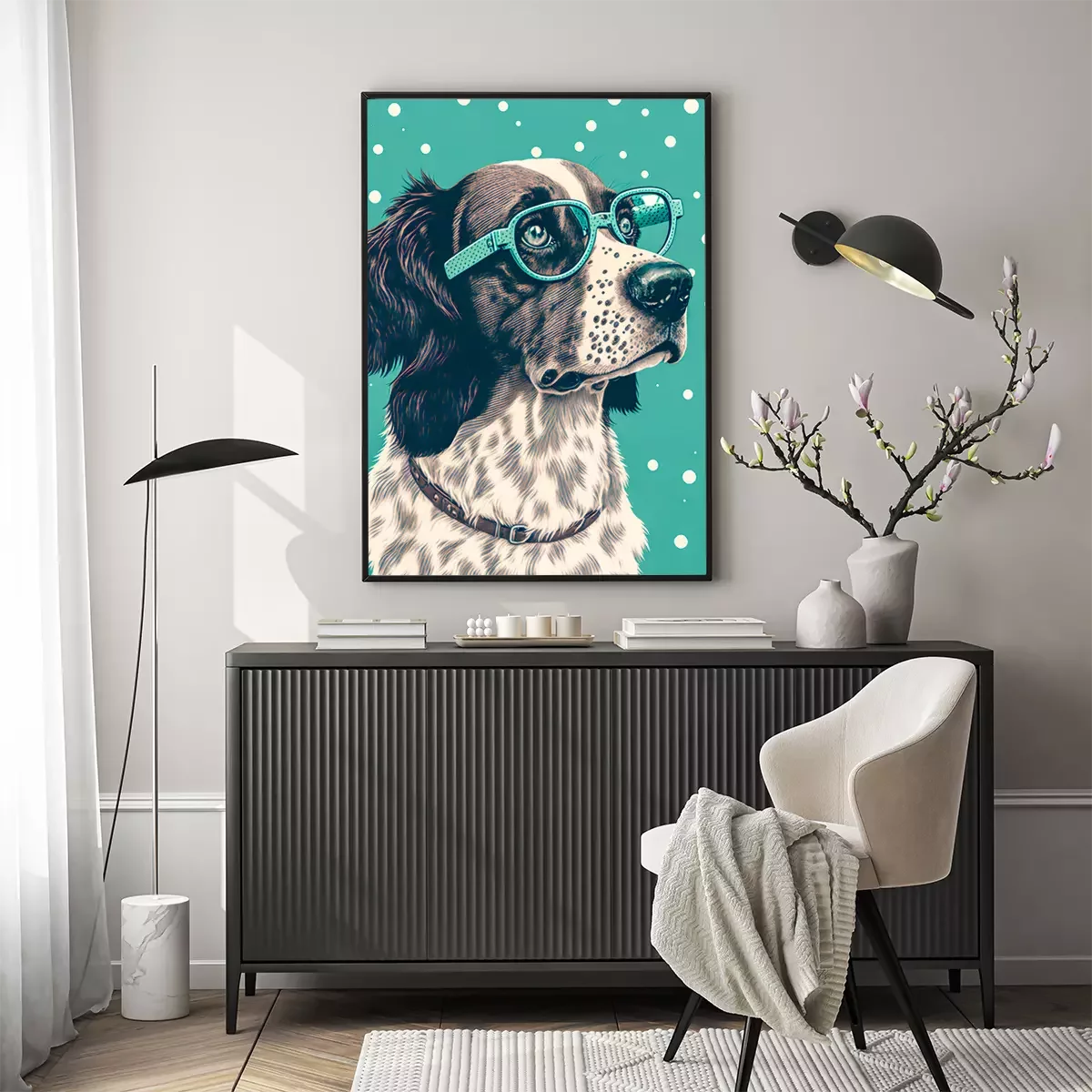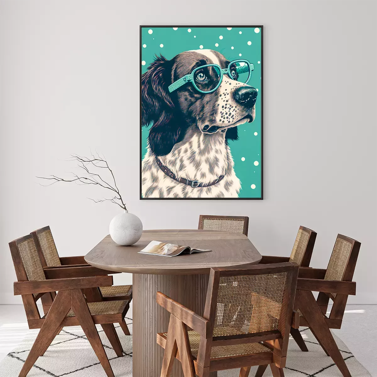 Wer ist der beste Freund des Menschen? Natürlich der Hund! Ein Poster mit einem entzückenden Vierbeiner ist die ideale Lösung für alle Tierliebhaber. Obwohl es den Anschein haben könnte, dass Hundeposter in erster Linie zur Dekoration eines Kinder- oder Jugendzimmers dienen, da die Motive oft recht kindlich sind, ist dies hier nicht der Fall. Wir haben uns zwar für cartoonartige Poster Hunde entschieden. Der Hund ist auf der Illustration dargestellt, aber das bedeutet nicht, dass es sich um eine kindliche Dekoration handelt. Das Design zeichnet sich durch einen Retro-Look aus – durch das realistische Porträt und den Tupfenhintergrund – genau das macht Poster mit Hunden zu einer äußerst vielseitigen Option. Ein Hund in dieser Ausführung präsentiert sich hervorragend in einem Wohnzimmer, das im Vintage-Stil eingerichtet ist und Möbel enthält, die von der Epoche Mid-century modern inspiriert worden sind. Gleichzeitig ist dies auch ein idealer Vorschlag für eine moderne Gestaltung in Grau- oder Brauntönen. Ein großer Vorteil unserer Hundeposter ist die Farbgebung. Auf der einen Seite ist das Design gedämpft, auf der anderen Seite verleiht das Mintgrün dem Ganzen Ausdruck und Charakter, wodurch die Darstellung die Aufmerksamkeit auf sich zieht. Bei der Dekoration von Innenräumen sollte man nicht zu ernst vorgehen, denn so können interessante Ergebnisse erzielt werden – und unsere Poster Hunde sind ein großartiges Beispiel dafür. Hunde sind für viele von uns Familienmitglieder, und ein cartoonartiges Porträt an der Wand unterstreicht die Liebe zu diesen Tieren. Die Dekoration schmückt also nicht nur die Wand, sondern ist auch ein Detail, das zeigt, was uns wichtig ist. Hundeposter sehen auch in Jugendzimmern hervorragend aus. Der Comic-Charakter des Designs macht es zu einem Vorschlag, der viele junge Hundeliebhaber anspricht. Das gleiche Design kann auch im Kinderzimmer verwendet werden, denn auch die Kleinen werden diese Art von Postern lieben. Das lustige Porträt eines Hundes mit dick gerahmter Brille zaubert ein Lächeln ins Gesicht des Kindes. Wenn Ihr kleiner Sprössling ein Hundeliebhaber ist, beschränken Sie sich nicht auf eine Wanddekoration, sondern wählen Sie drei Hund Poster aus. Hunde in Form von lustigen Illustrationen können ein Triptychon über dem Schreibtisch bilden, an dem das Kind zeichnet und Hausaufgaben macht, oder über dem Bettchen, wenn es nicht gerne schlafen geht und sich in der Gesellschaft von Hunden wohler fühlt.