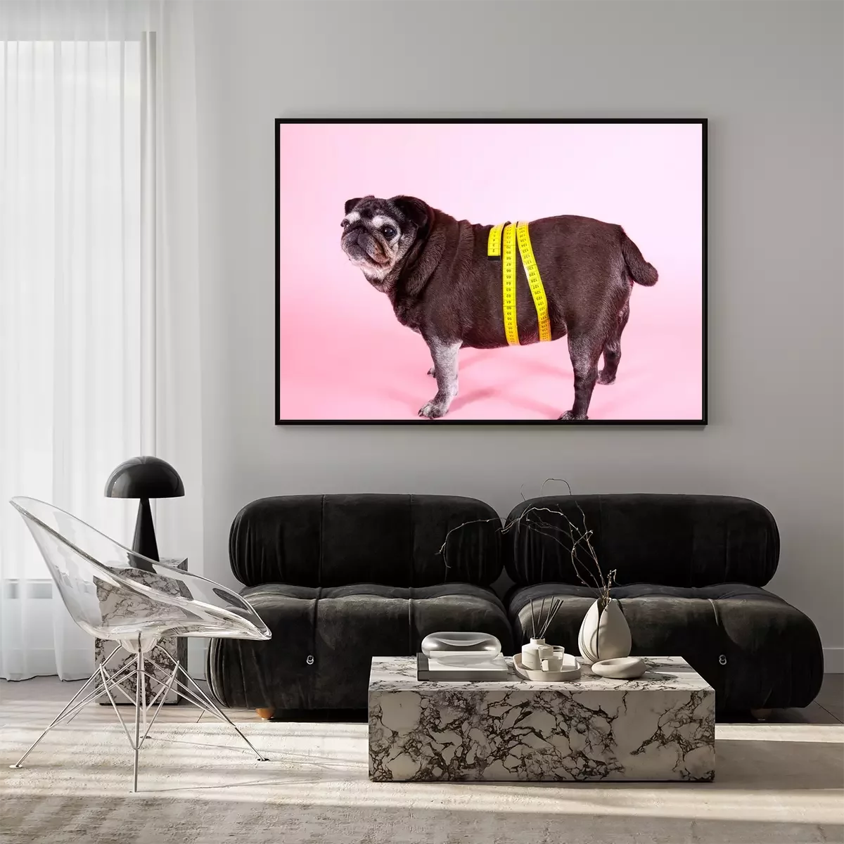 Poster: Hund Mops mit Schneidermaß