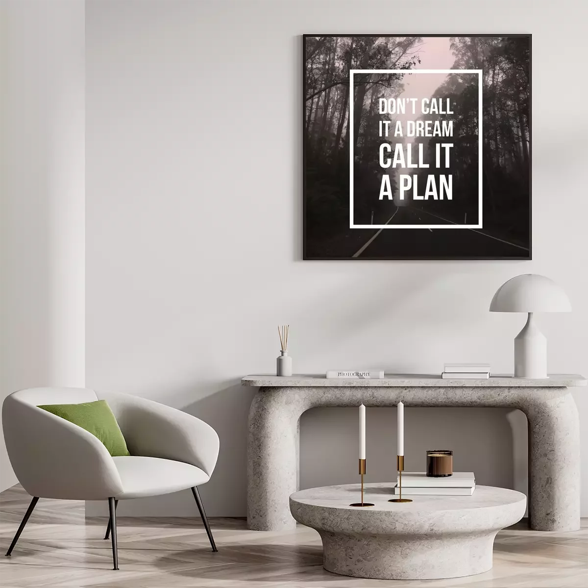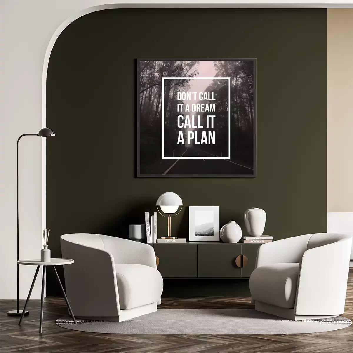 Poster: Inspirierender Satz auf dem Hintergrund eines Waldweges