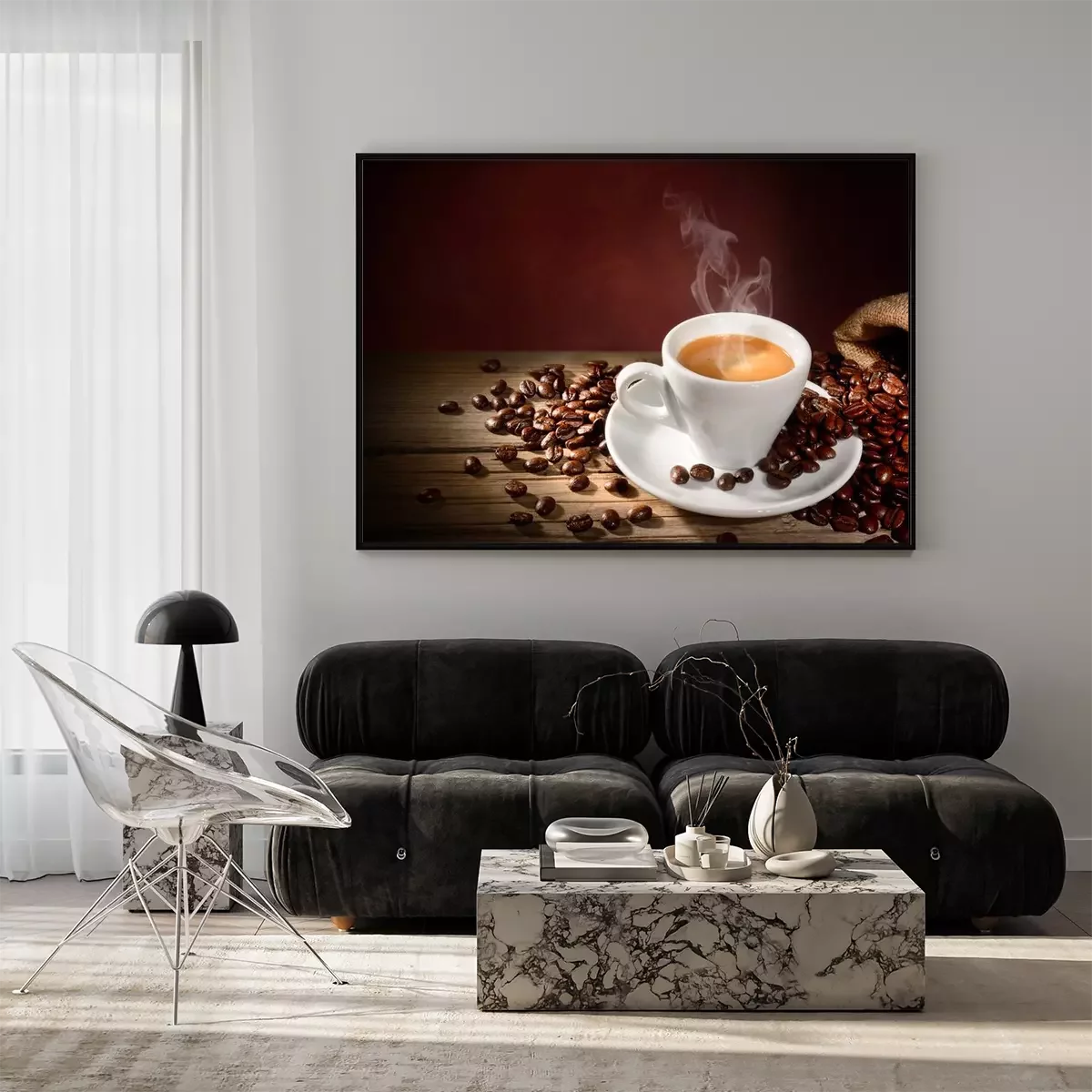 Eine Tasse Espresso und ein Jutesack mit Kaffeebohnen