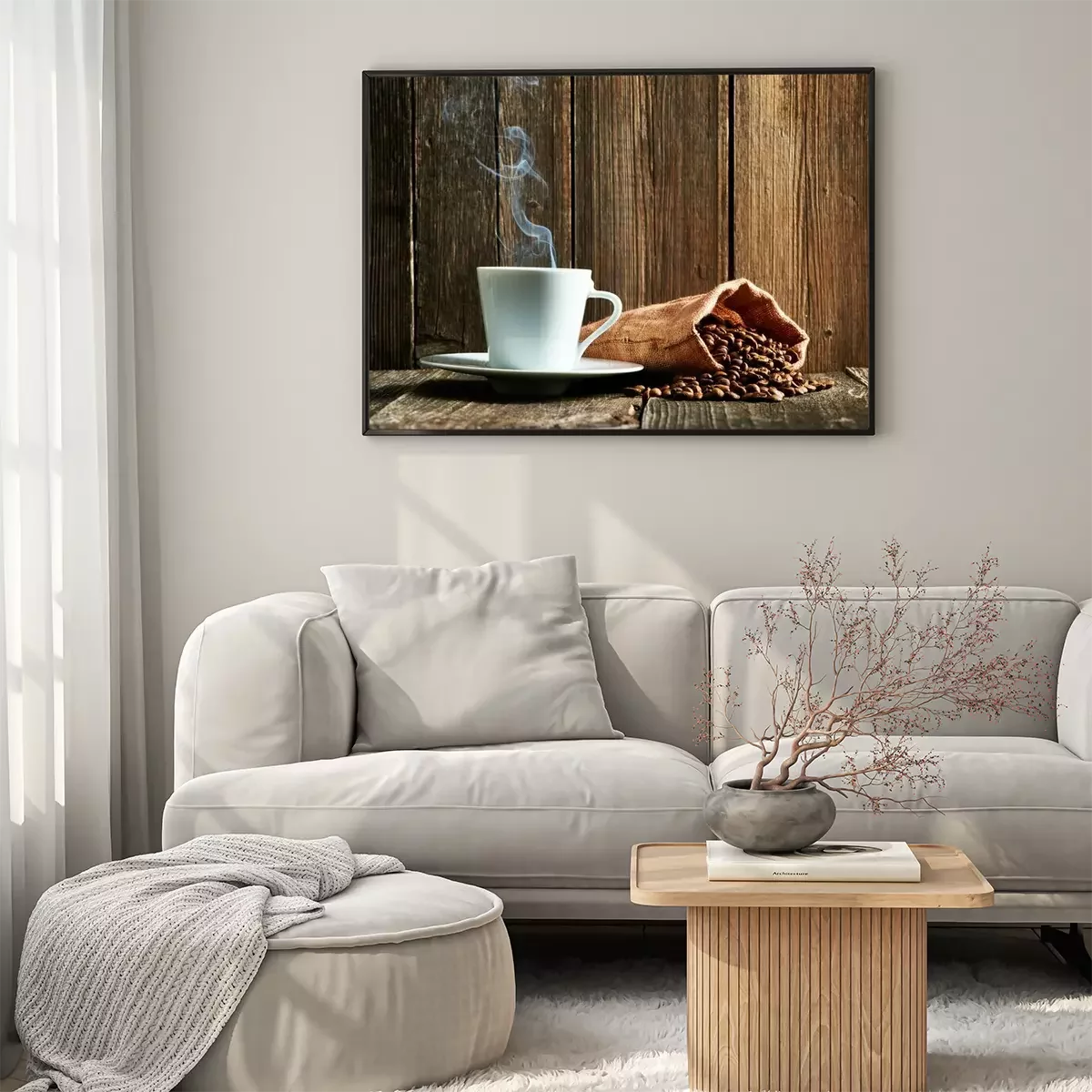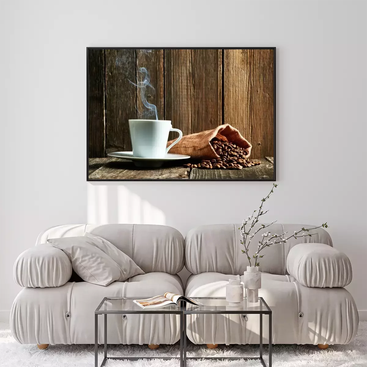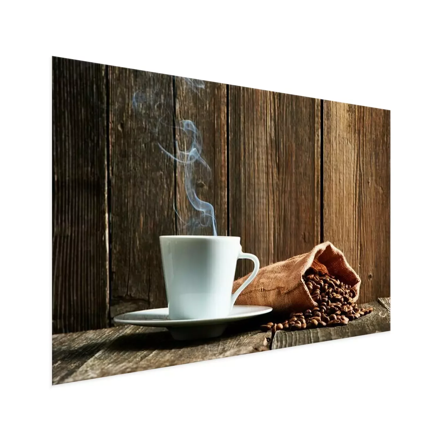 Poster: Kaffeetasse neben einem Sack mit Bohnen