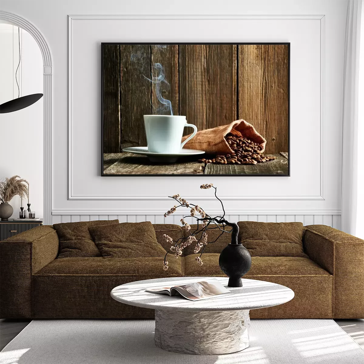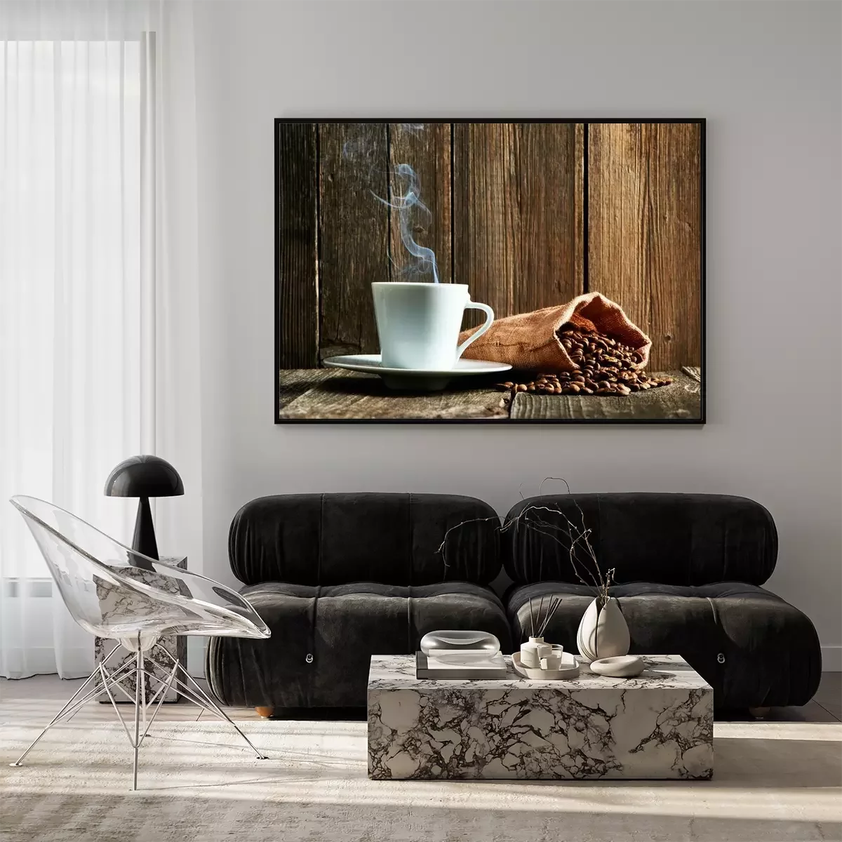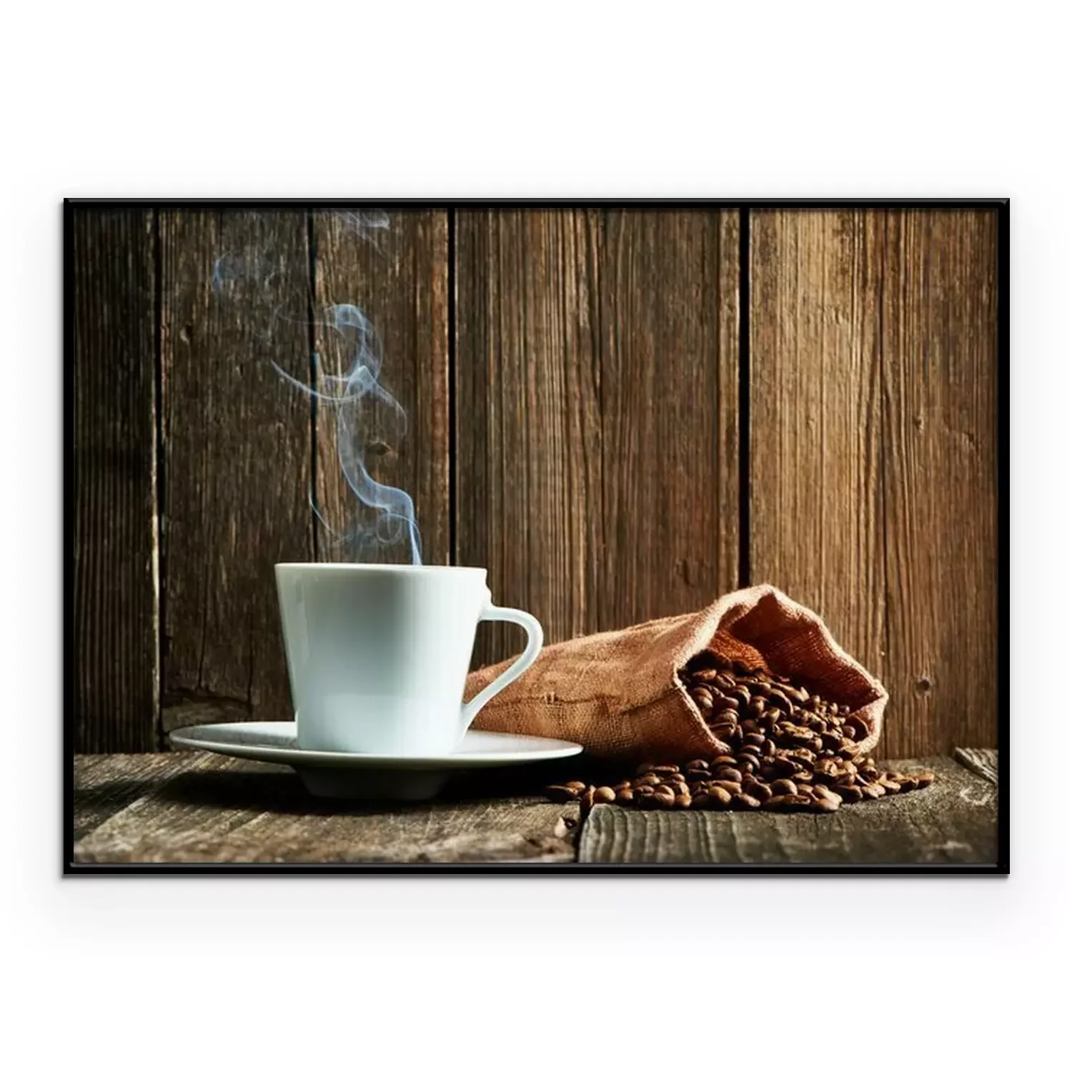 Poster: Kaffeetasse neben einem Sack mit Bohnen