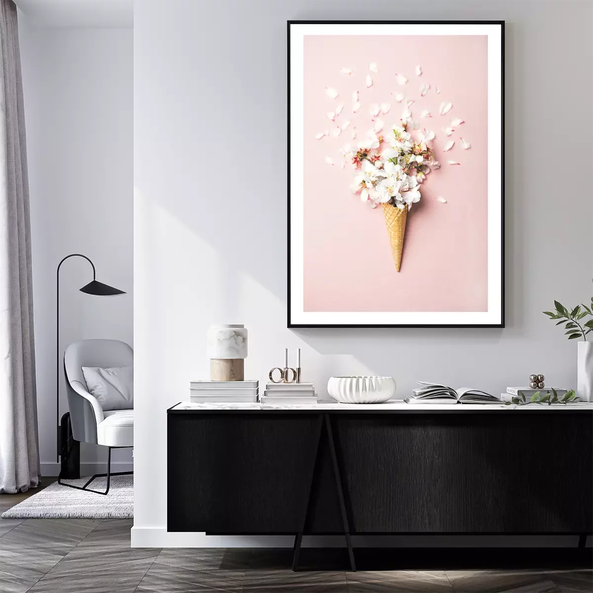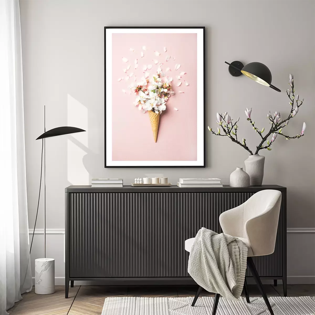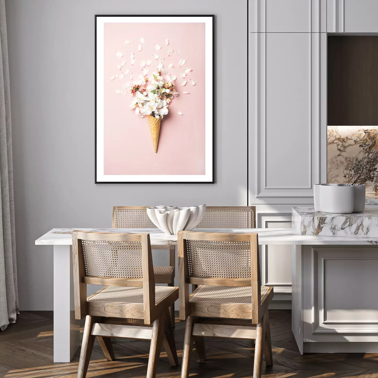 Poster: Kirschblüten in einer Waffeltüte auf rosa Hintergrund