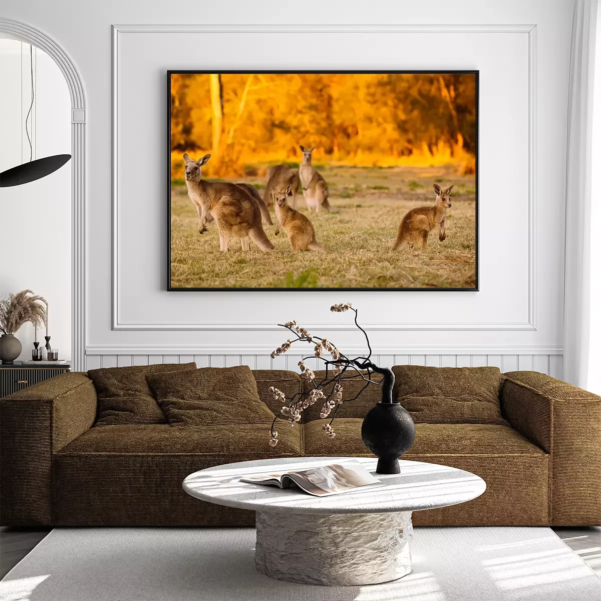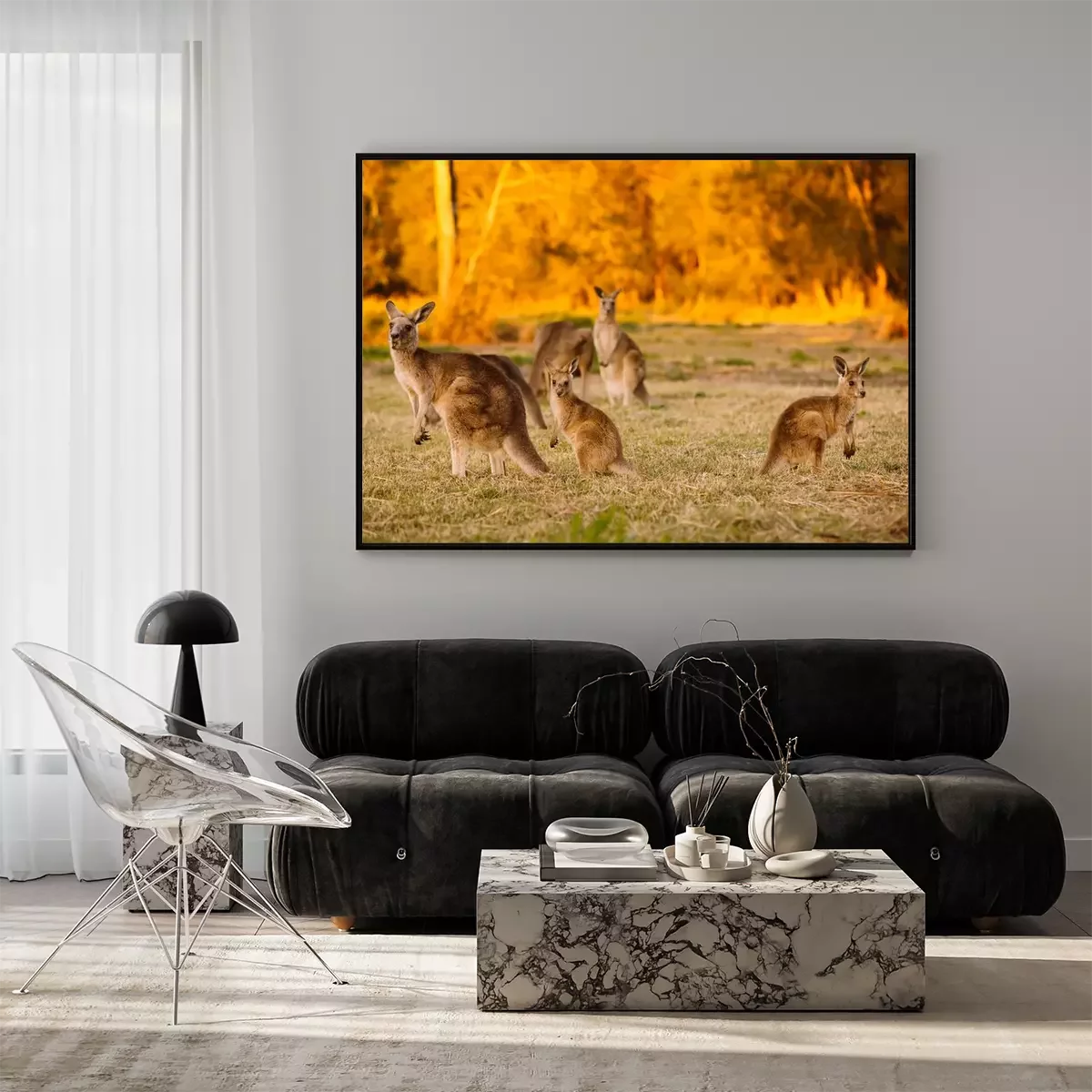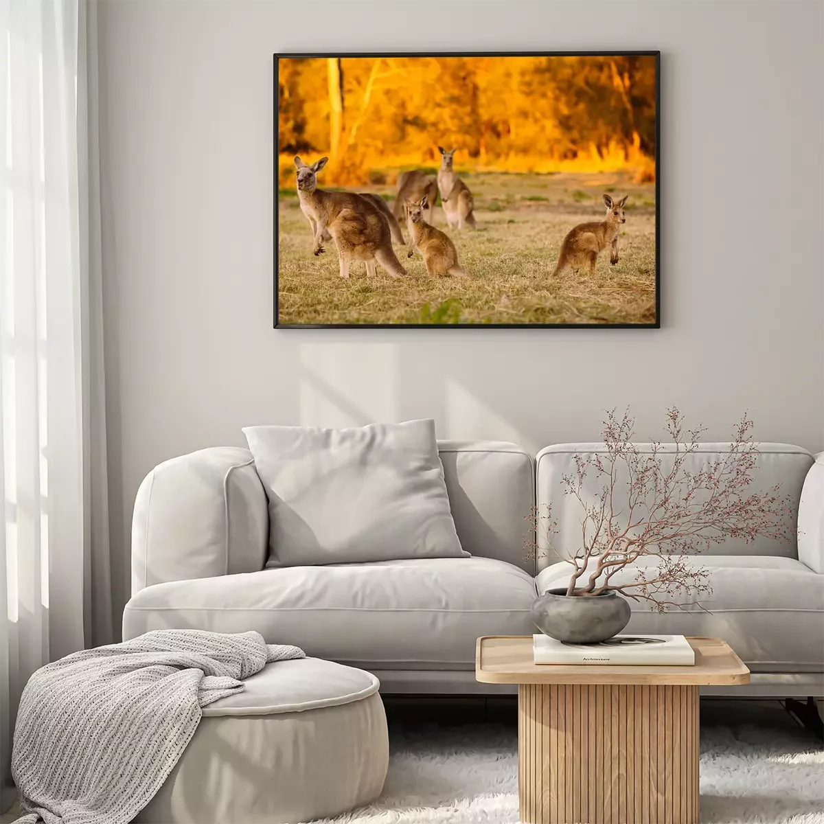 Poster: Kleine Herde von Kängurus im Hintergrund der Bäume