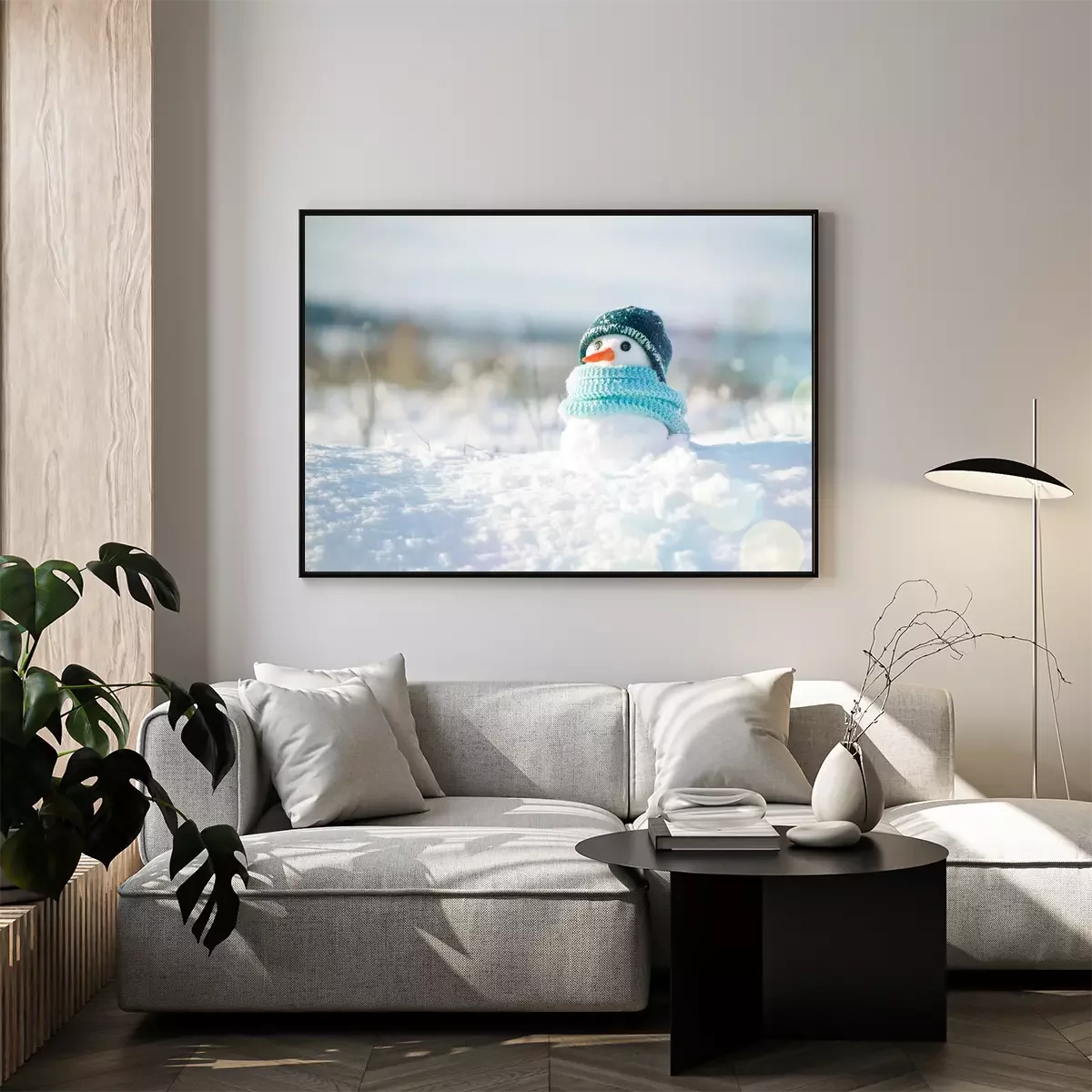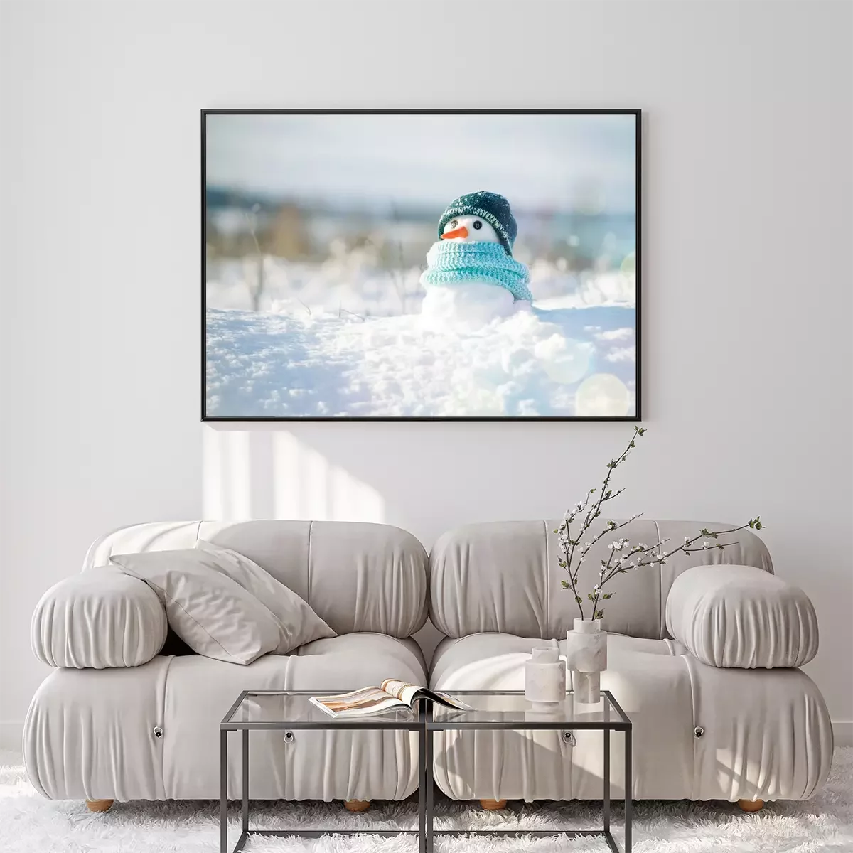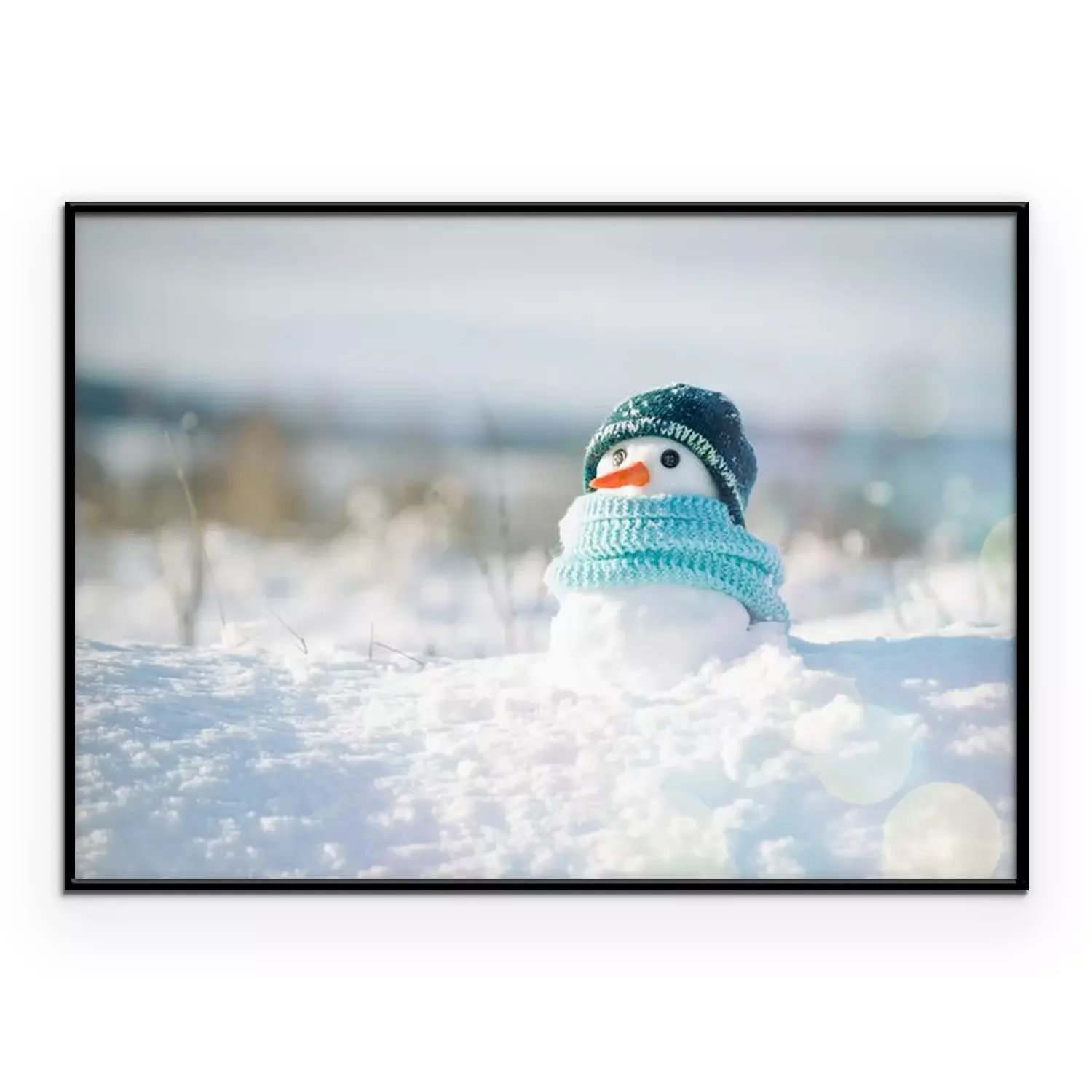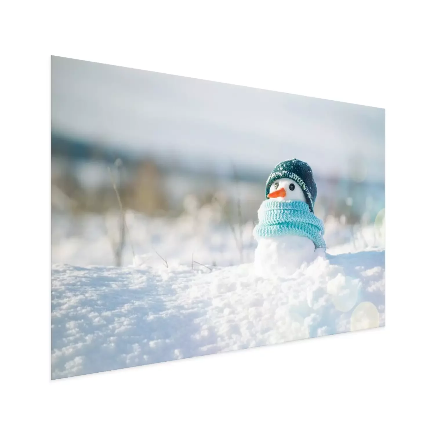 Poster: Kleiner Schneemann mit Schal und Mütze