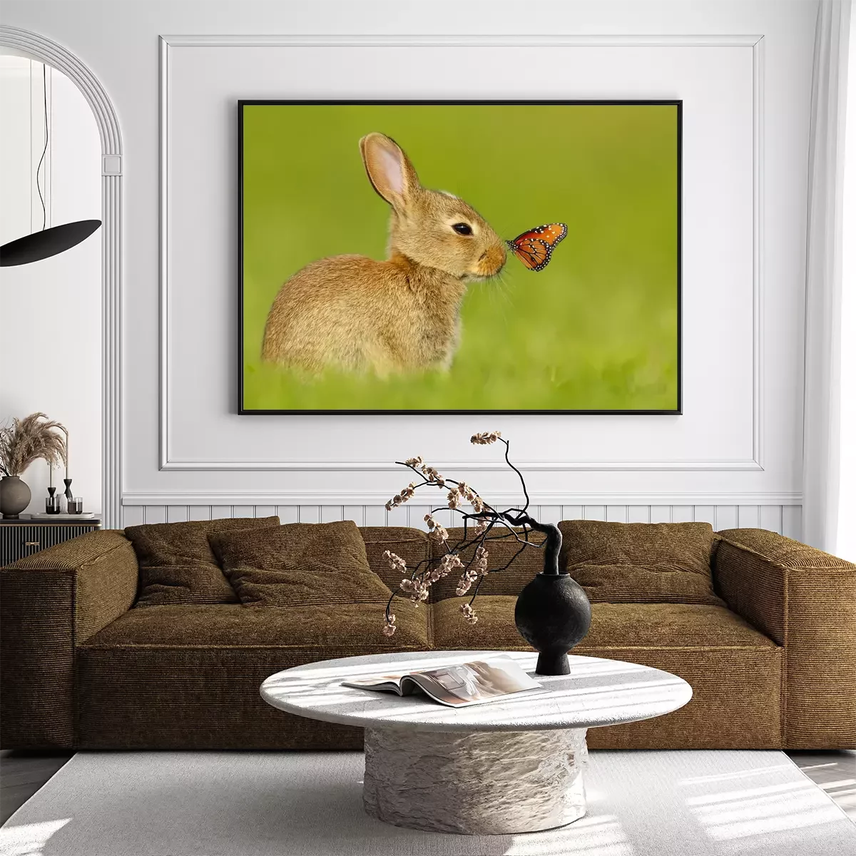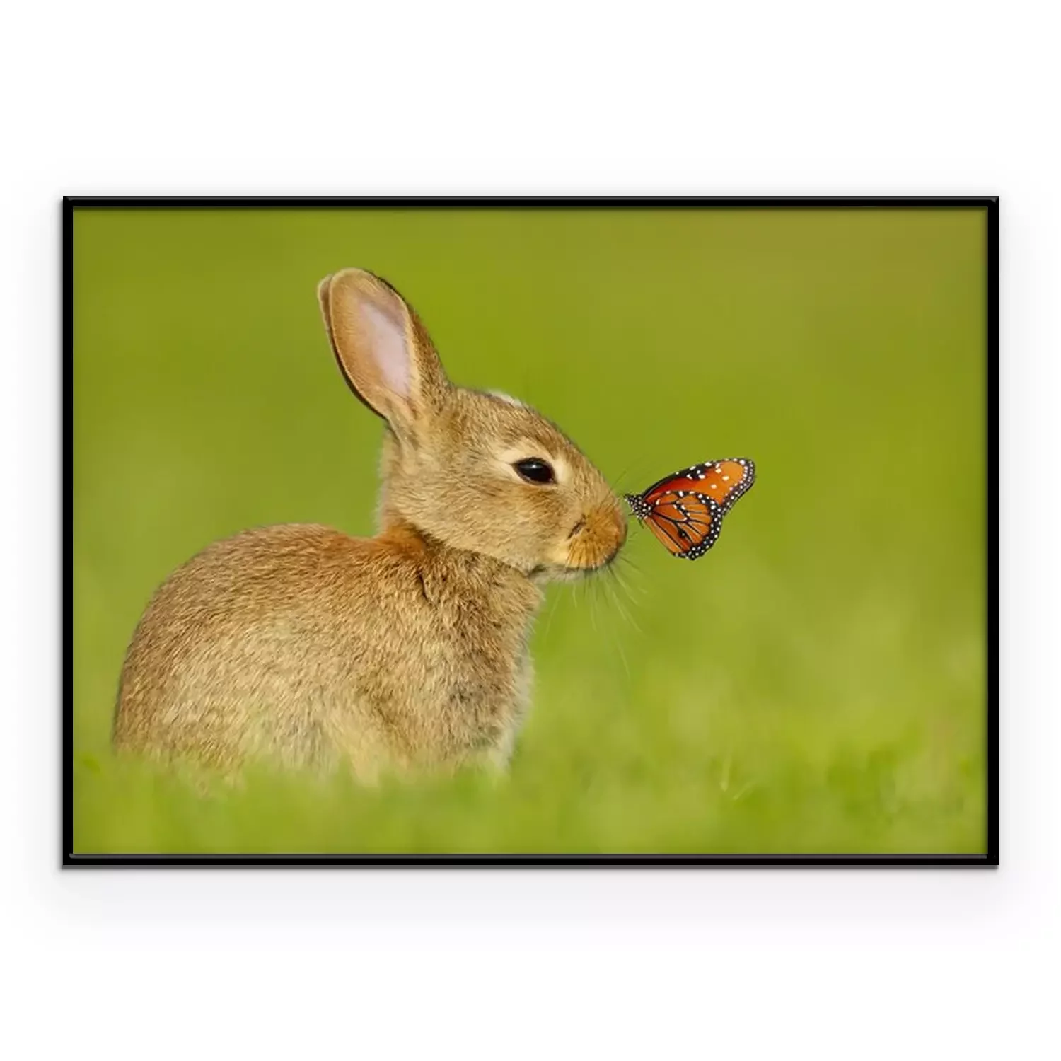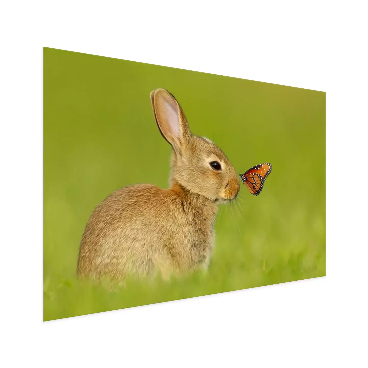 Poster: Kleines Häschen mit Schmetterling auf einer grünen Wiese
