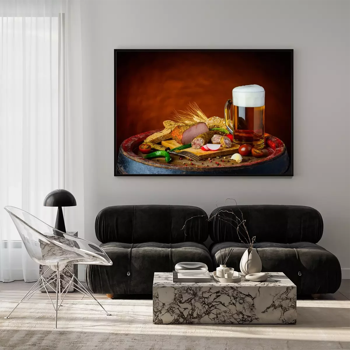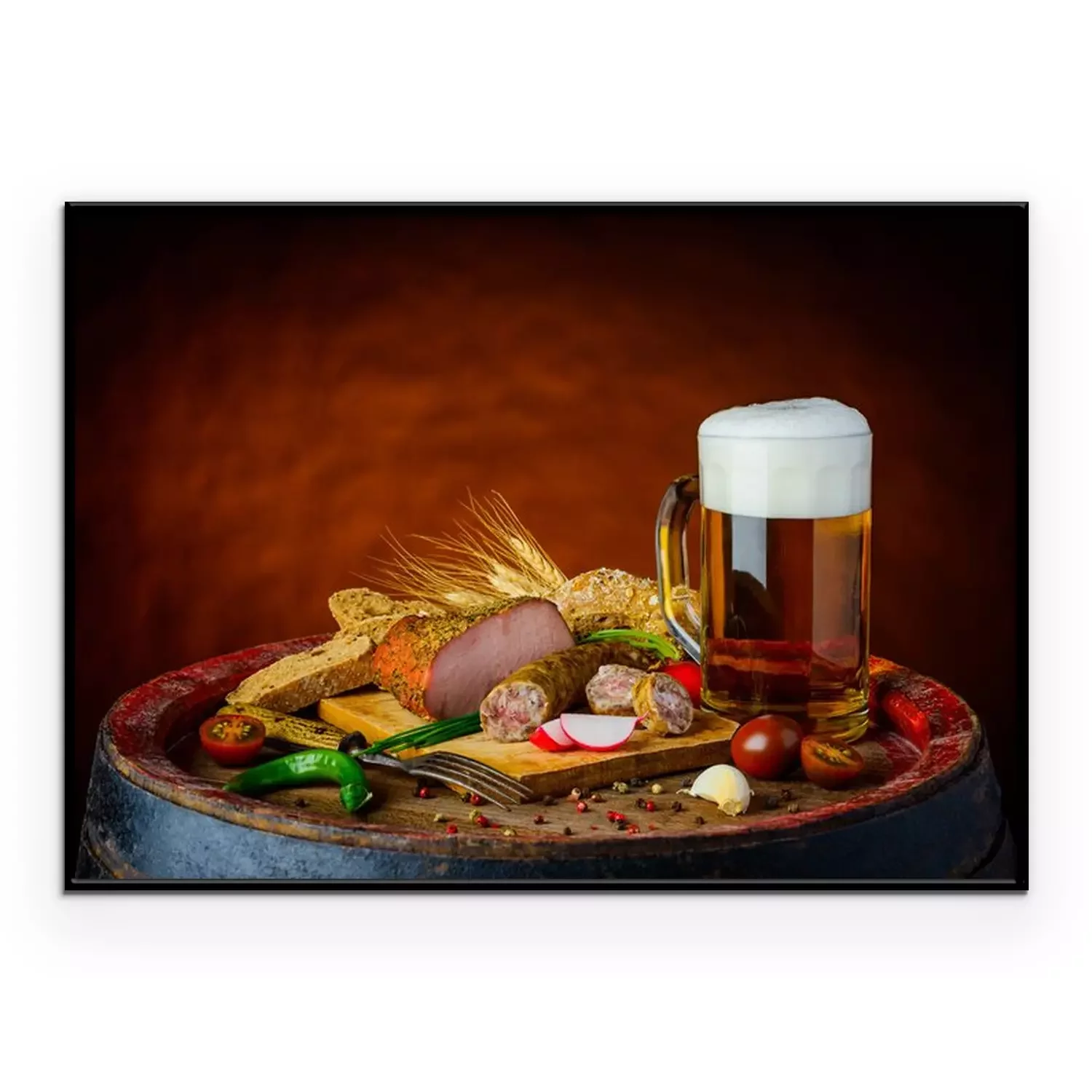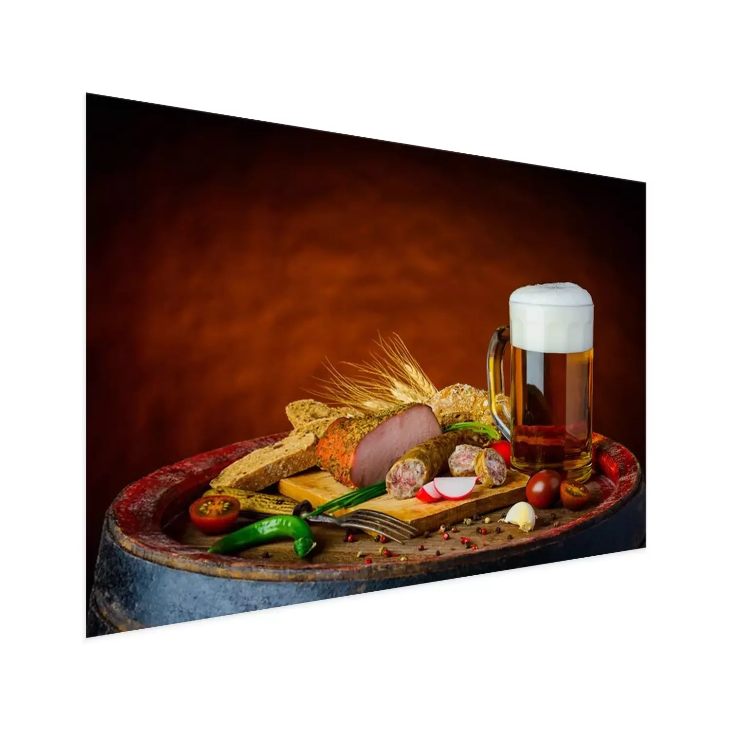 Poster: Krug und Lebensmittel auf einem Fass