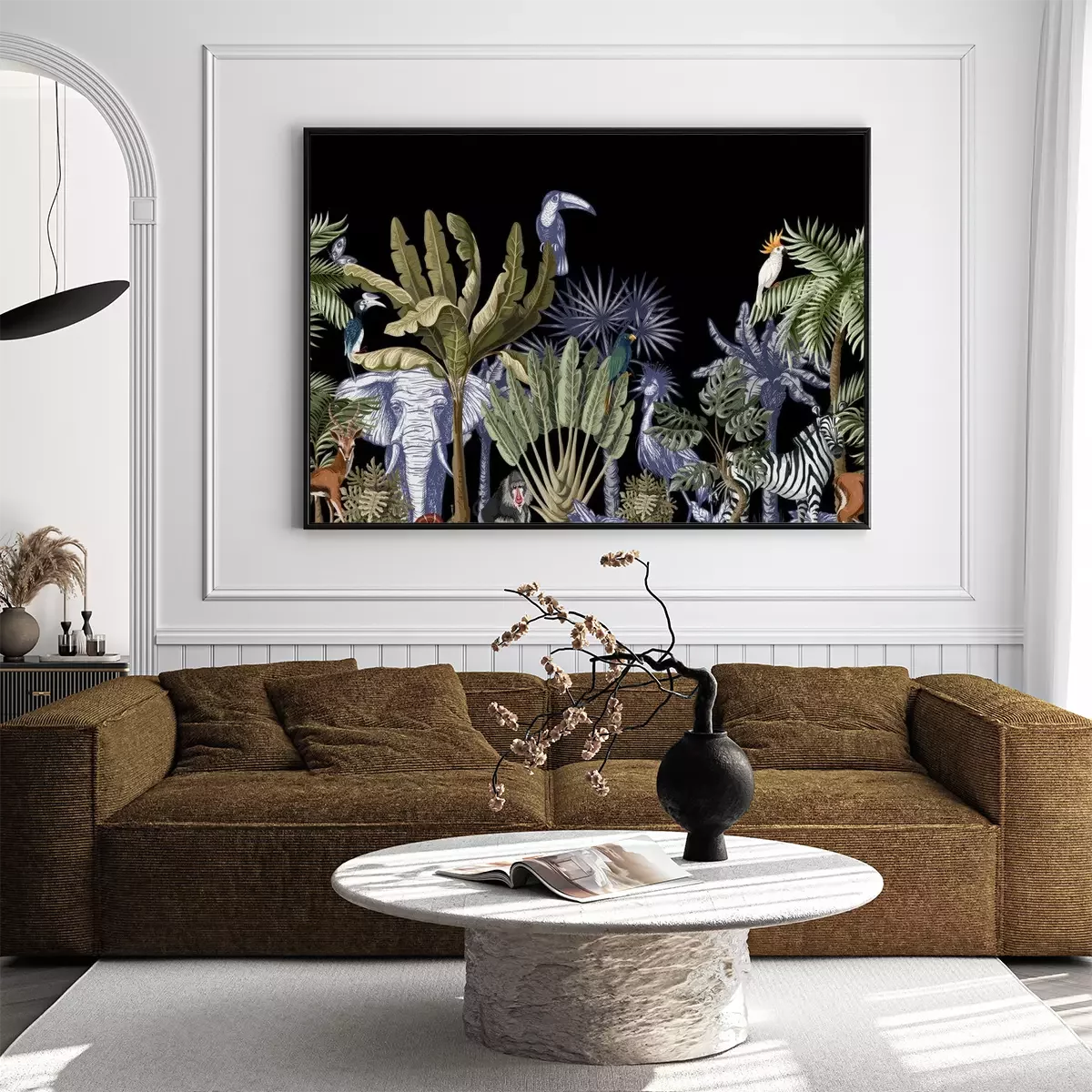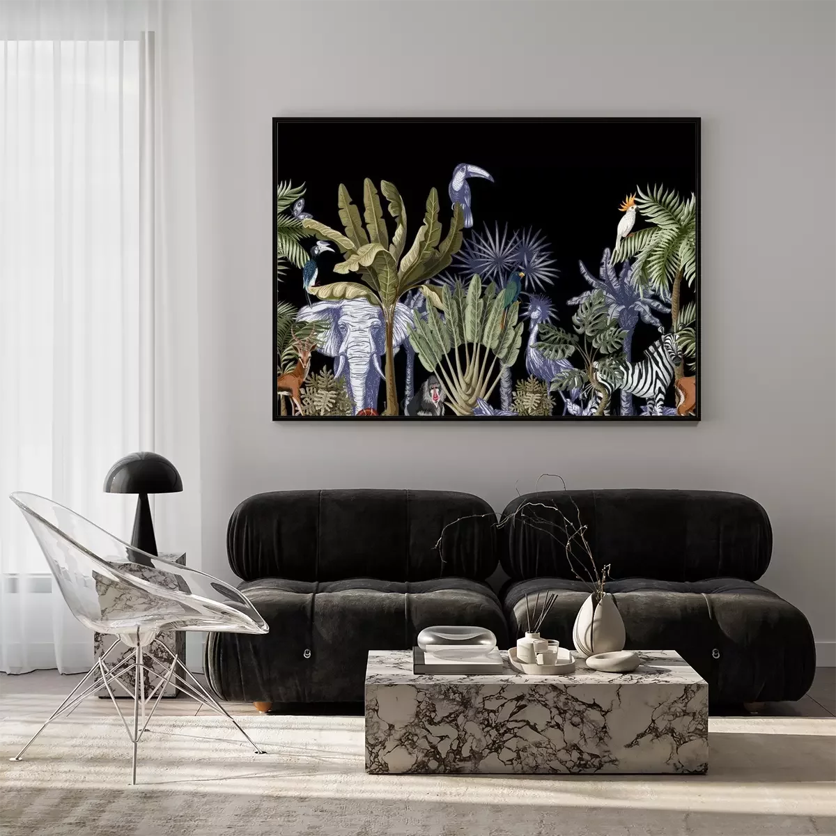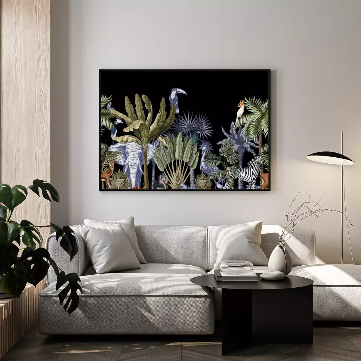 Schwarz-weiße und farbenfrohe tropische Tiere