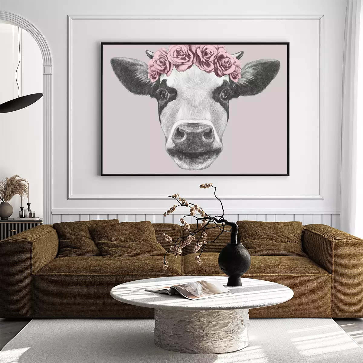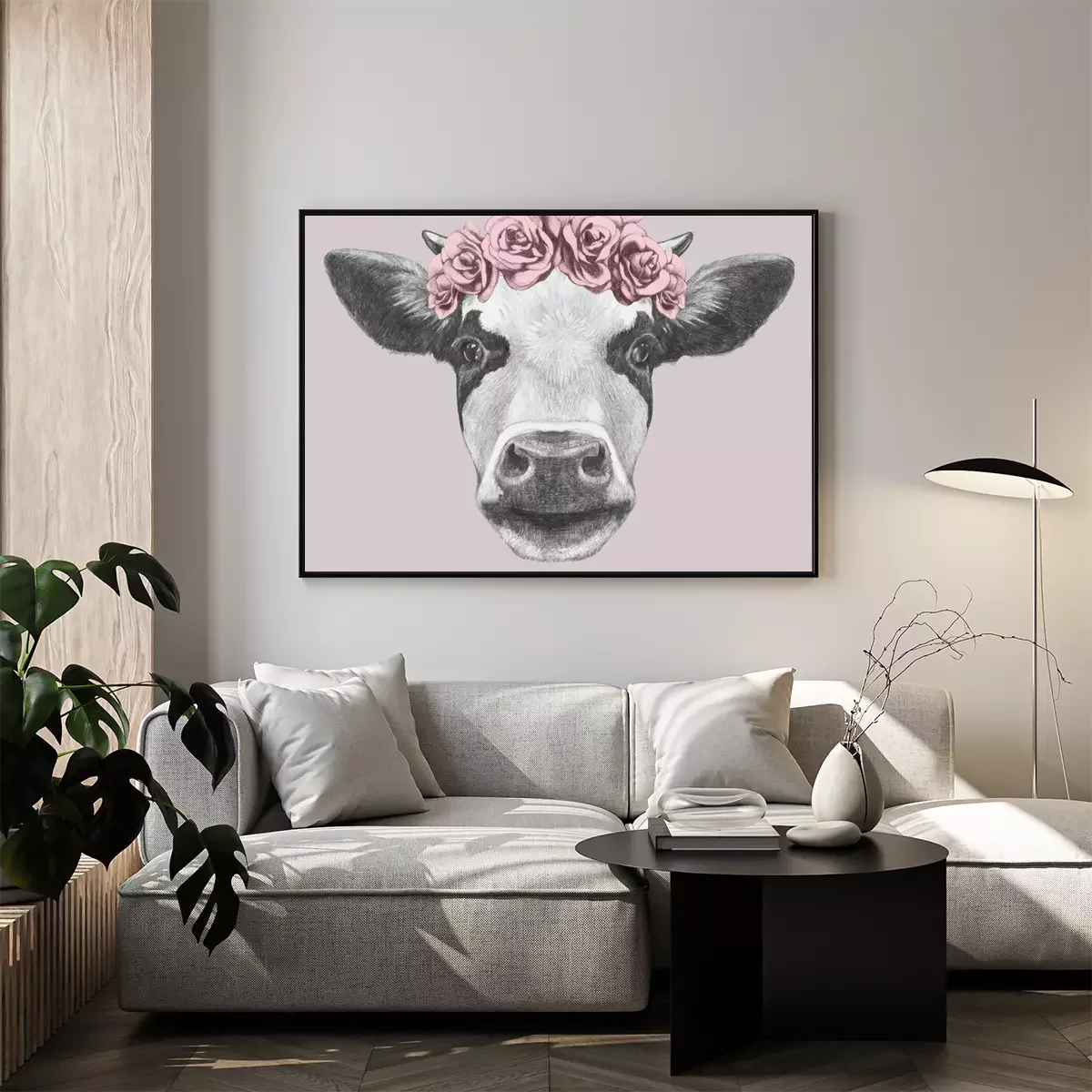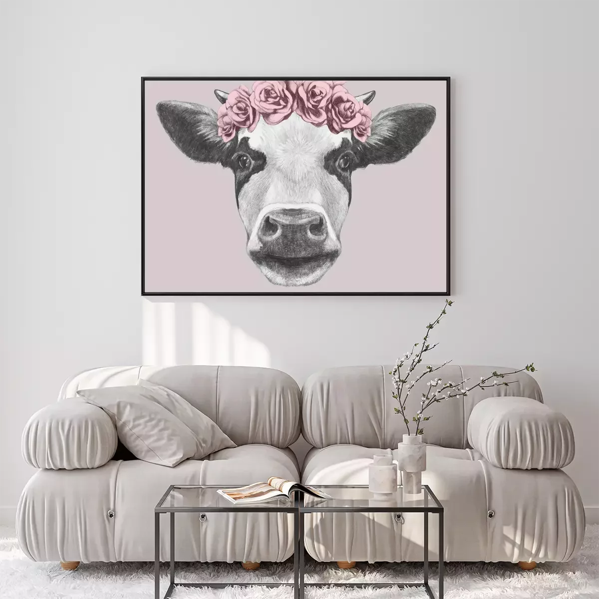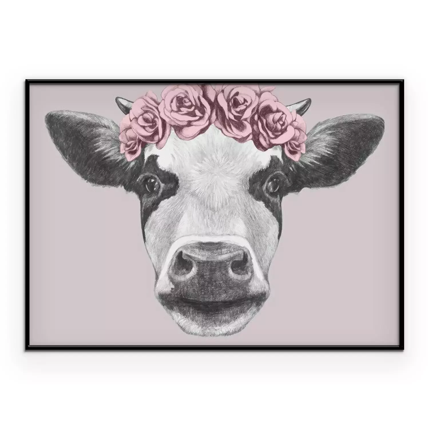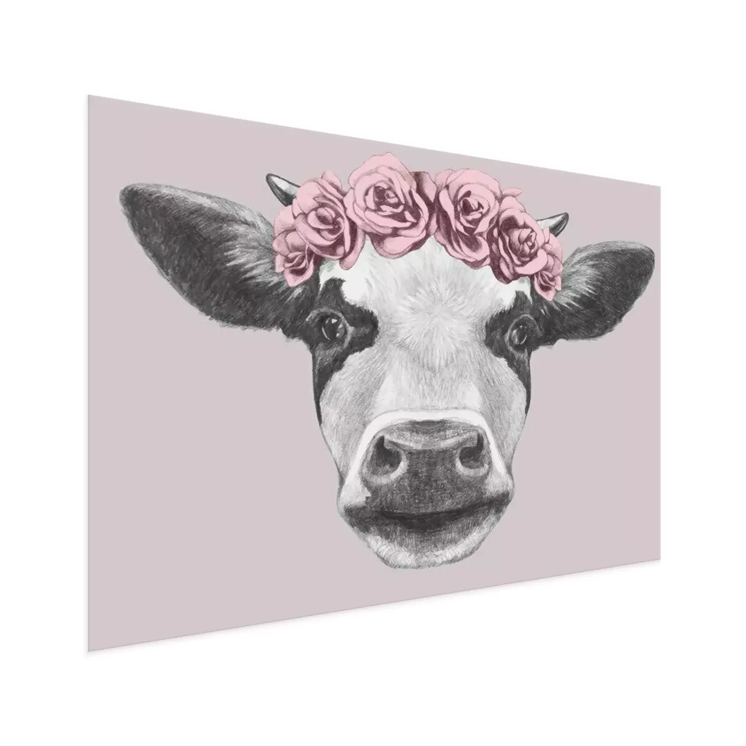 Poster: Kuh mit Blumenkranz auf rosa Hintergrund