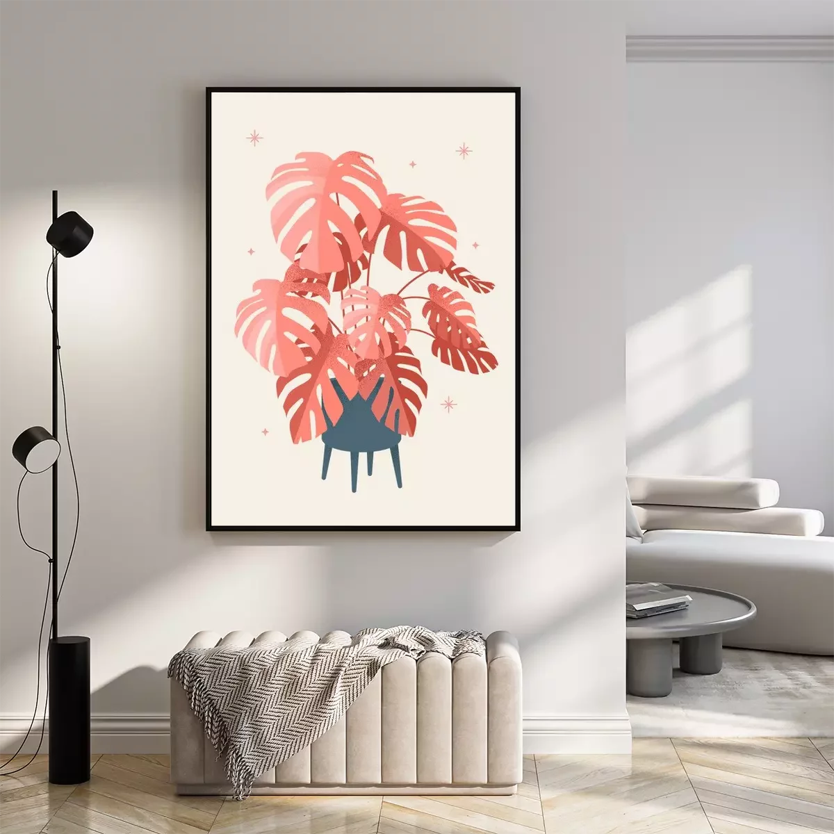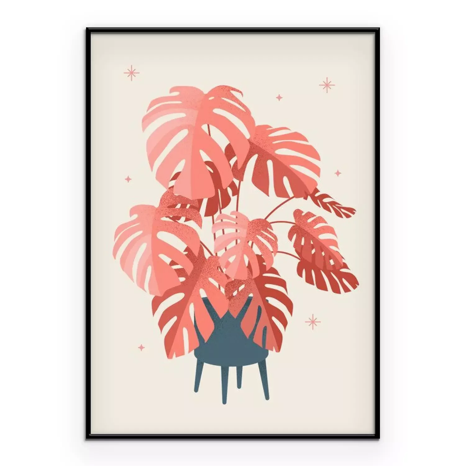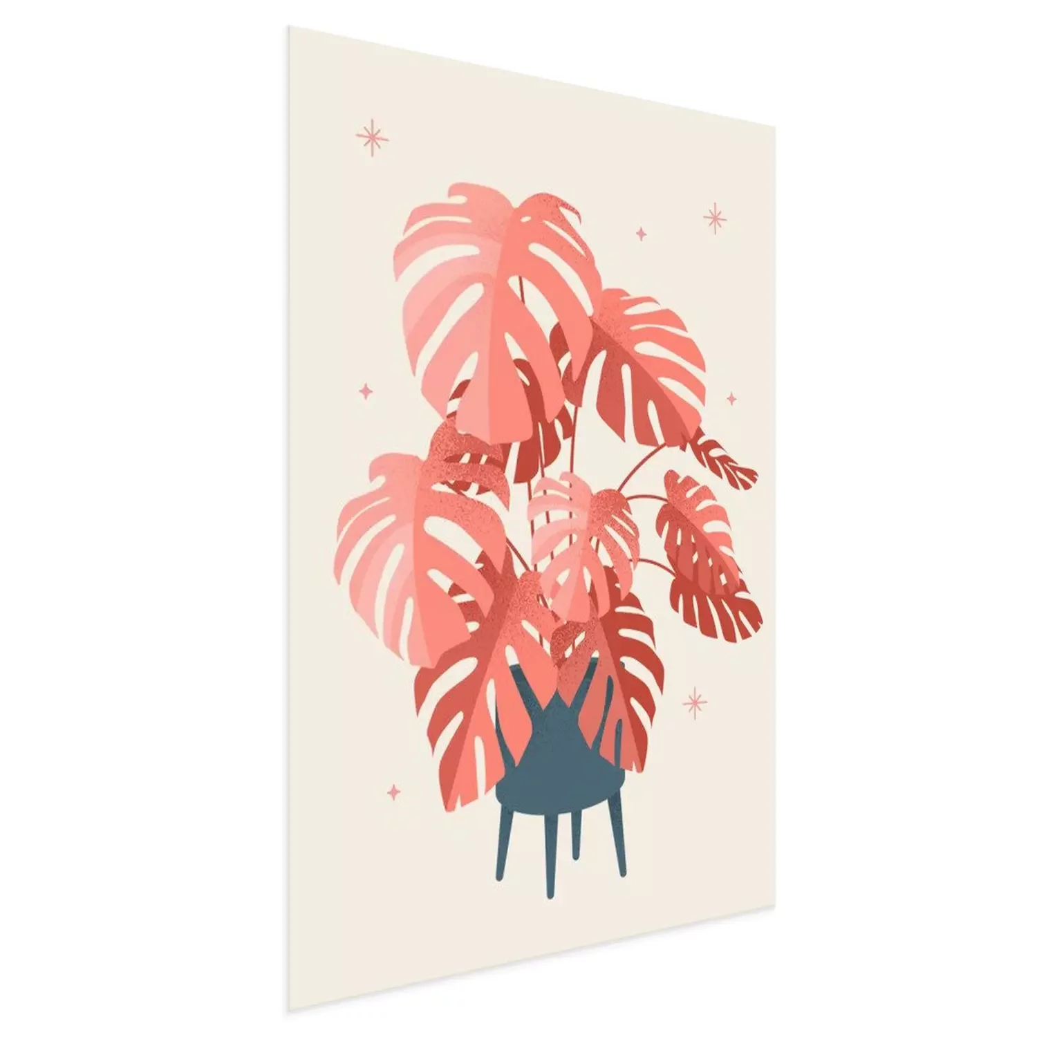 Poster: Lachsfarbene Monstera-Blätter in einem modernen Topf