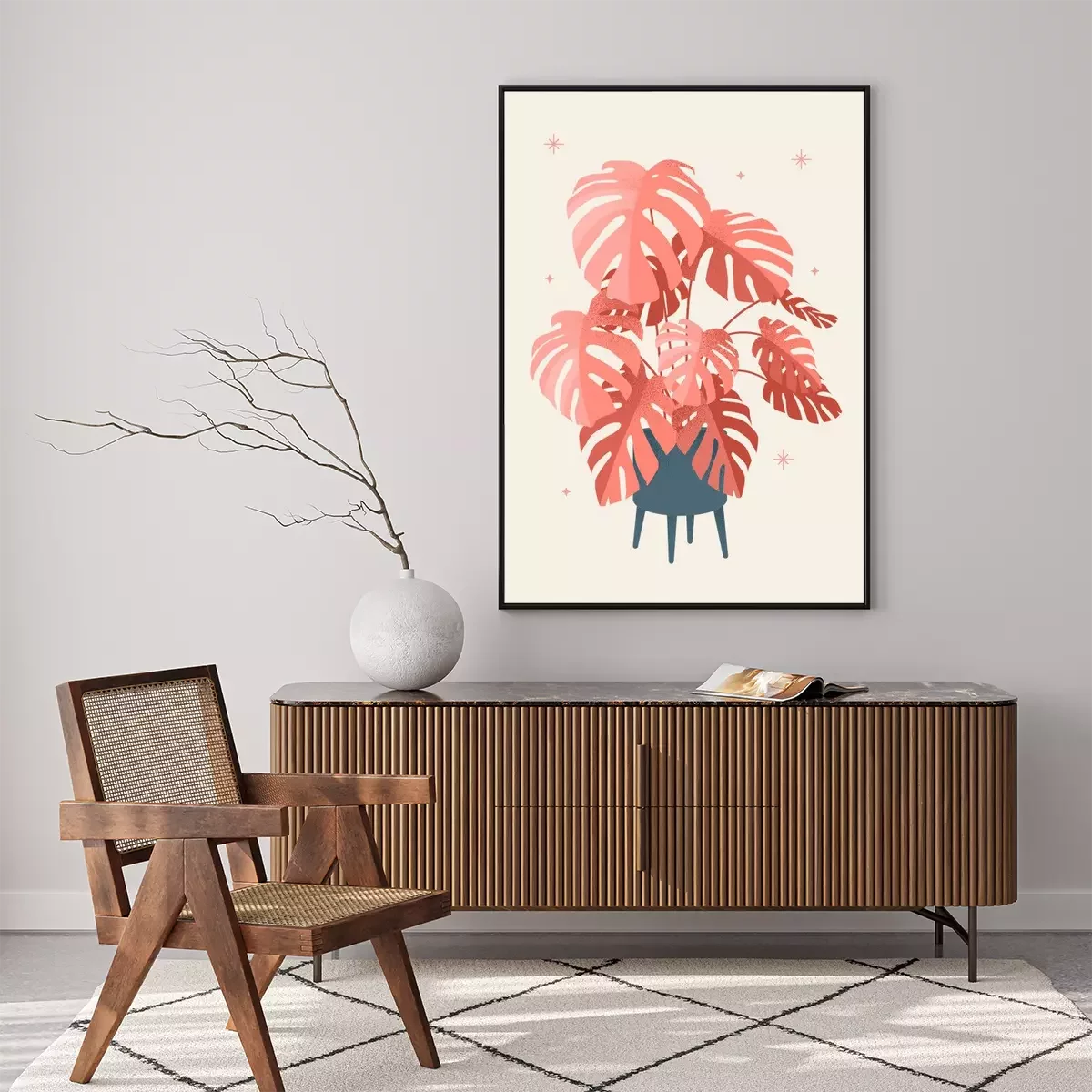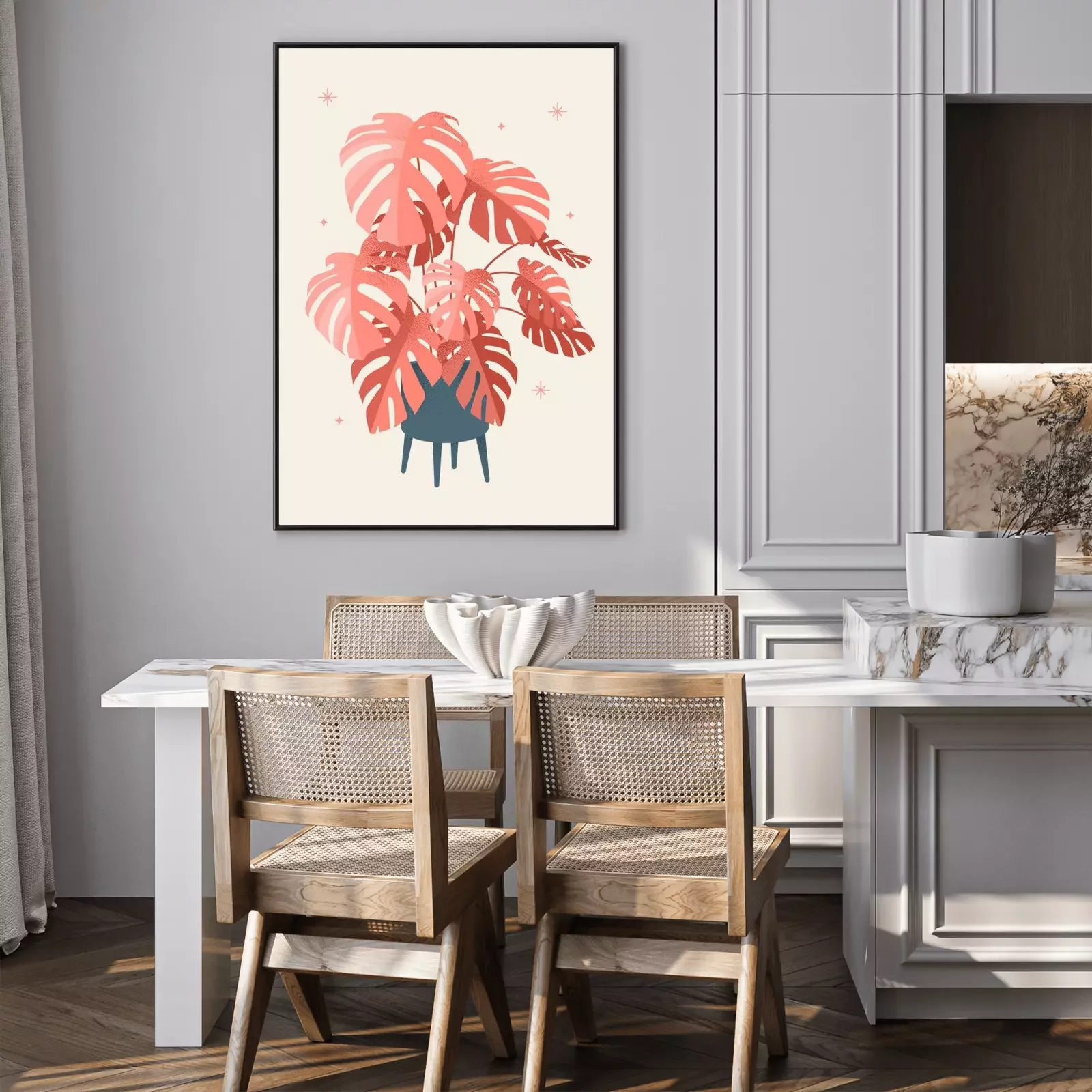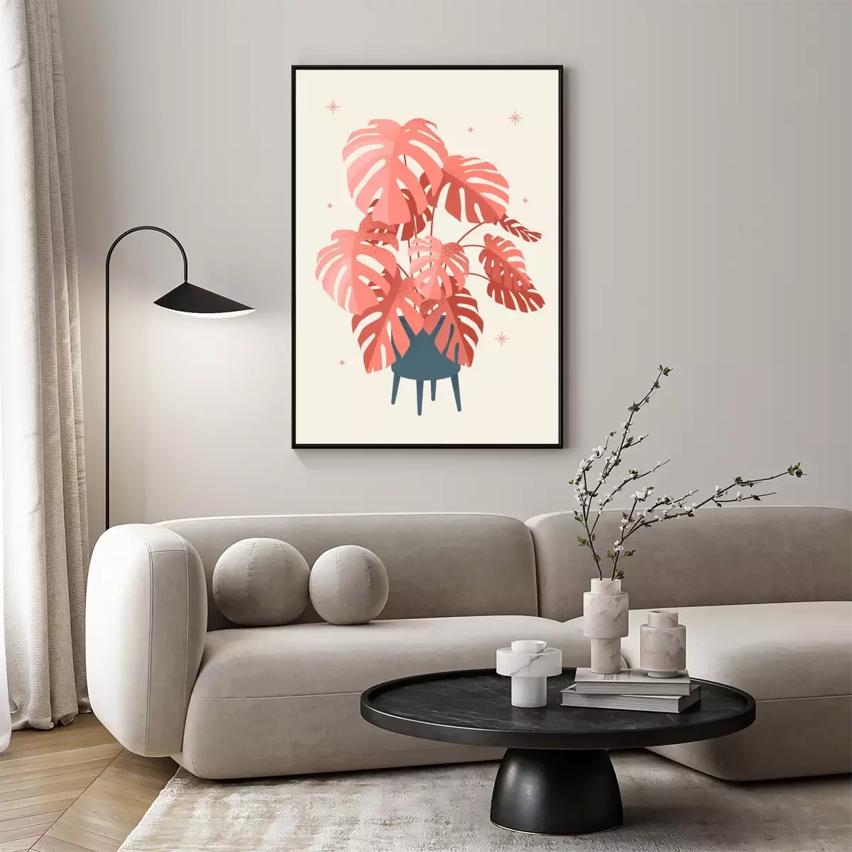 Poster: Lachsfarbene Monstera-Blätter in einem modernen Topf