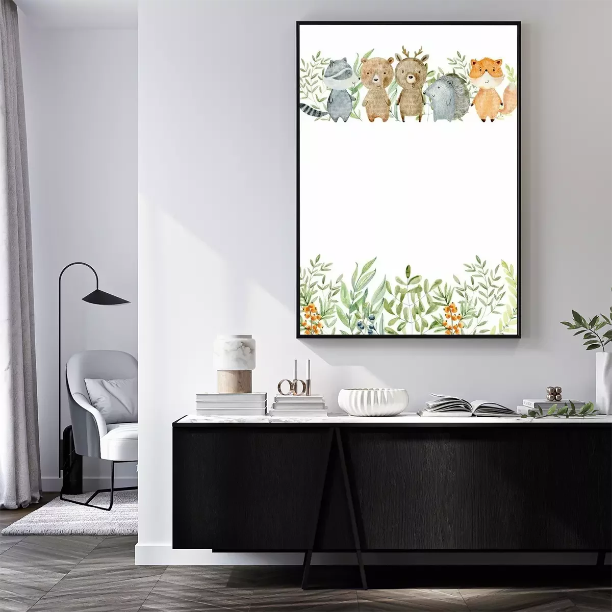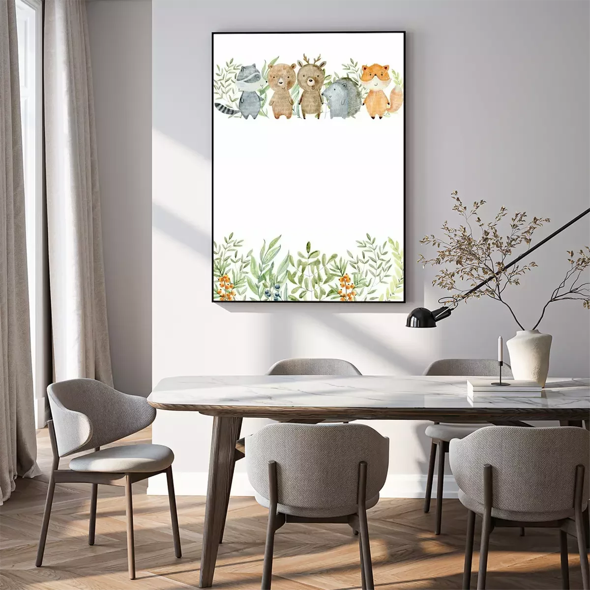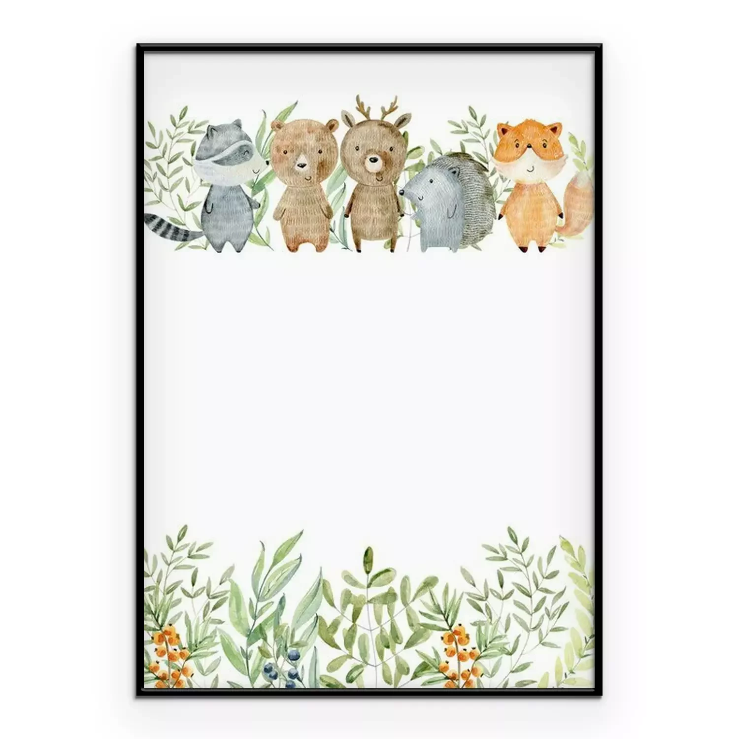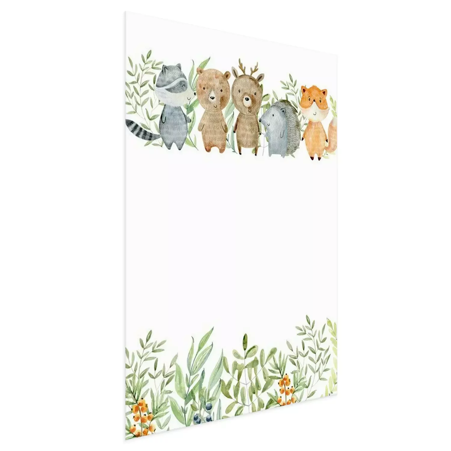 Poster: Lächelnde Waldtiere mit einem grünen Blattmotiv