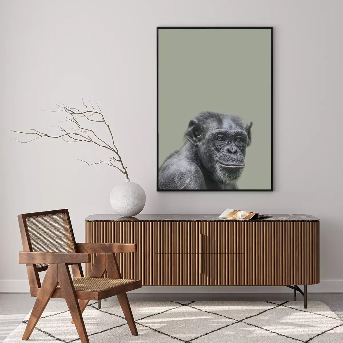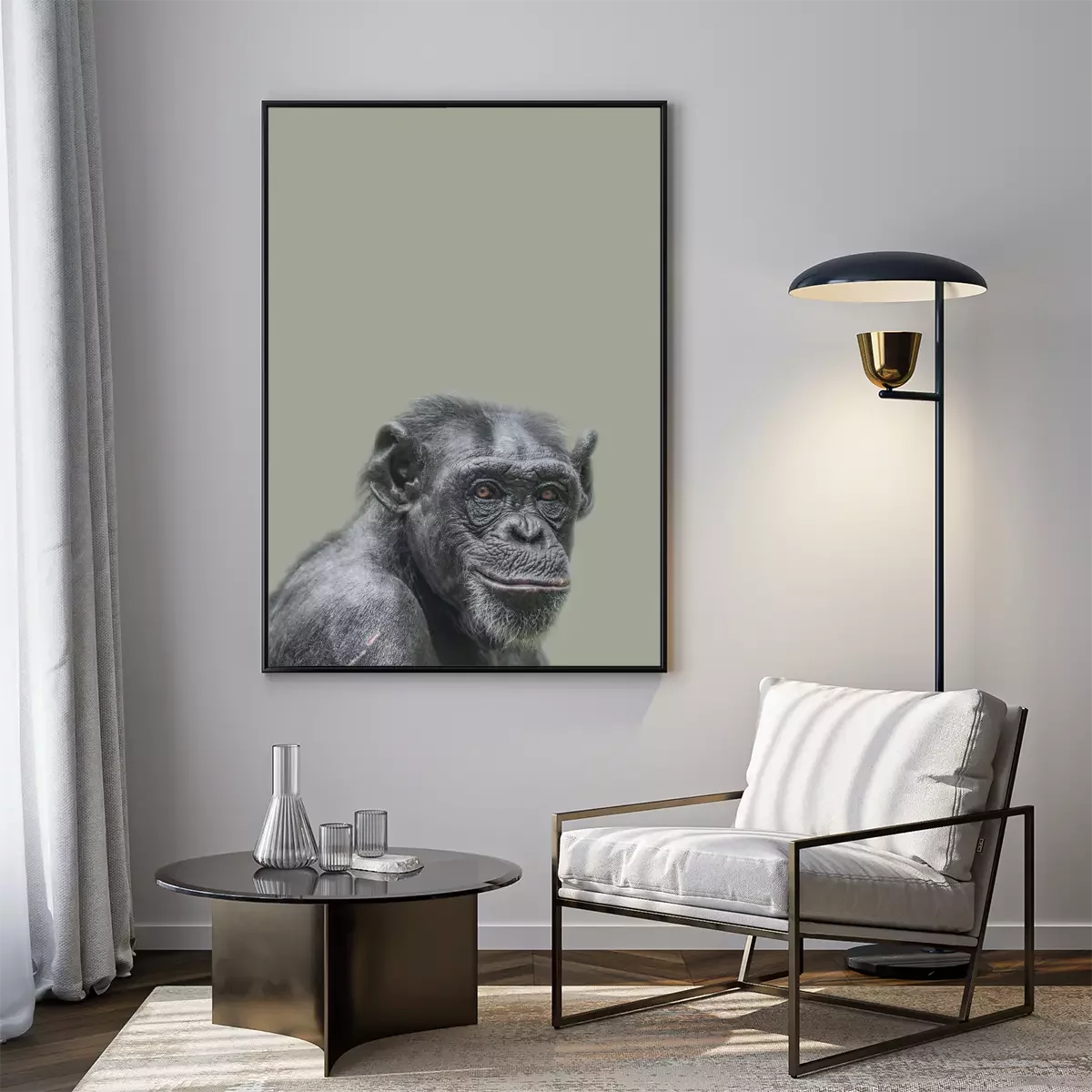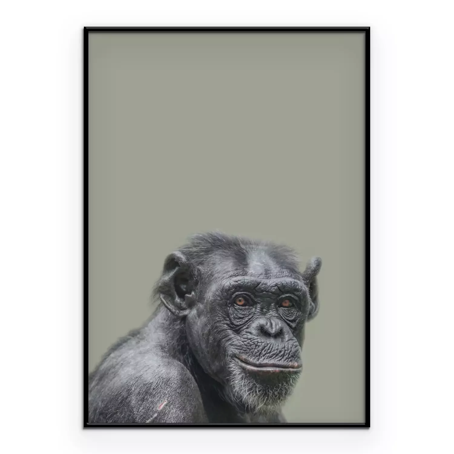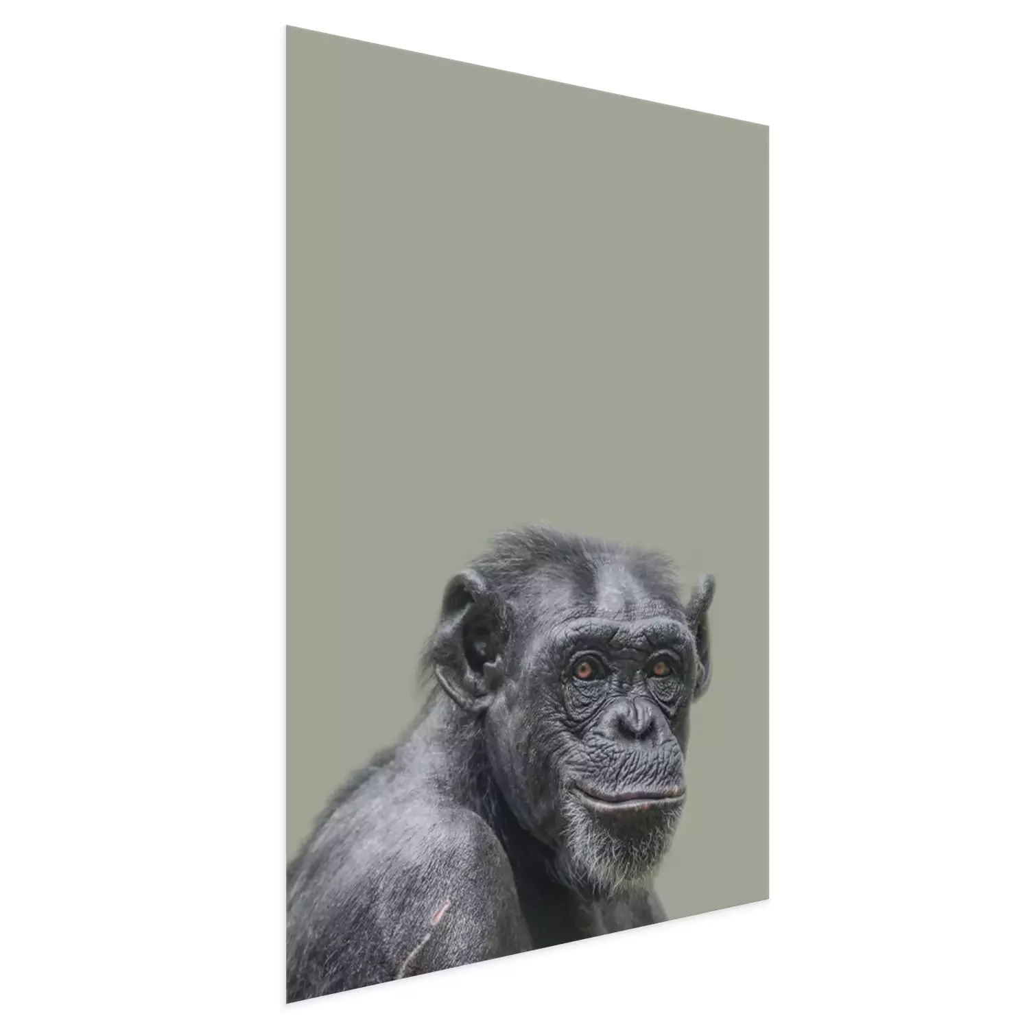 Poster: Lächelnder Schimpanse auf grünem Hintergrund