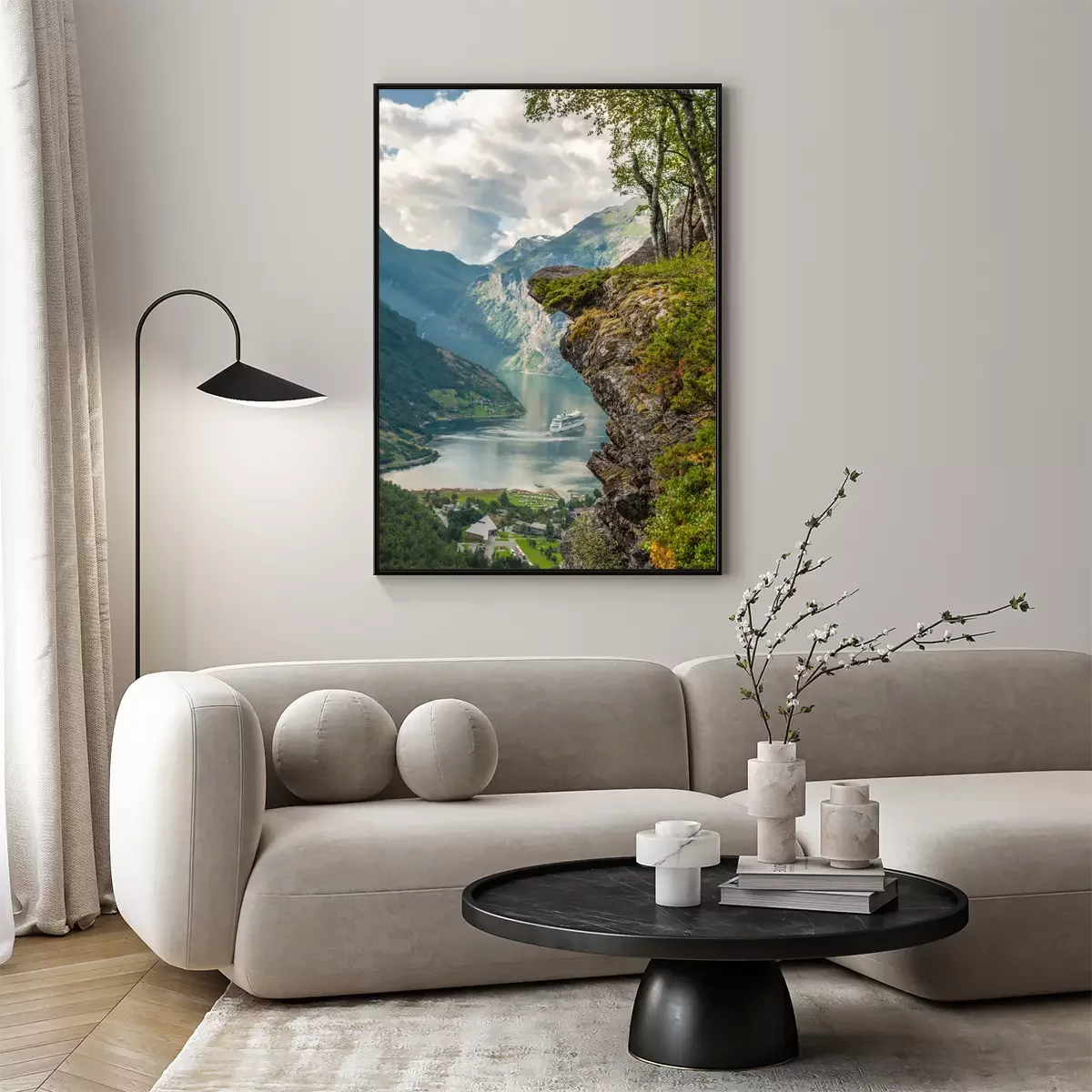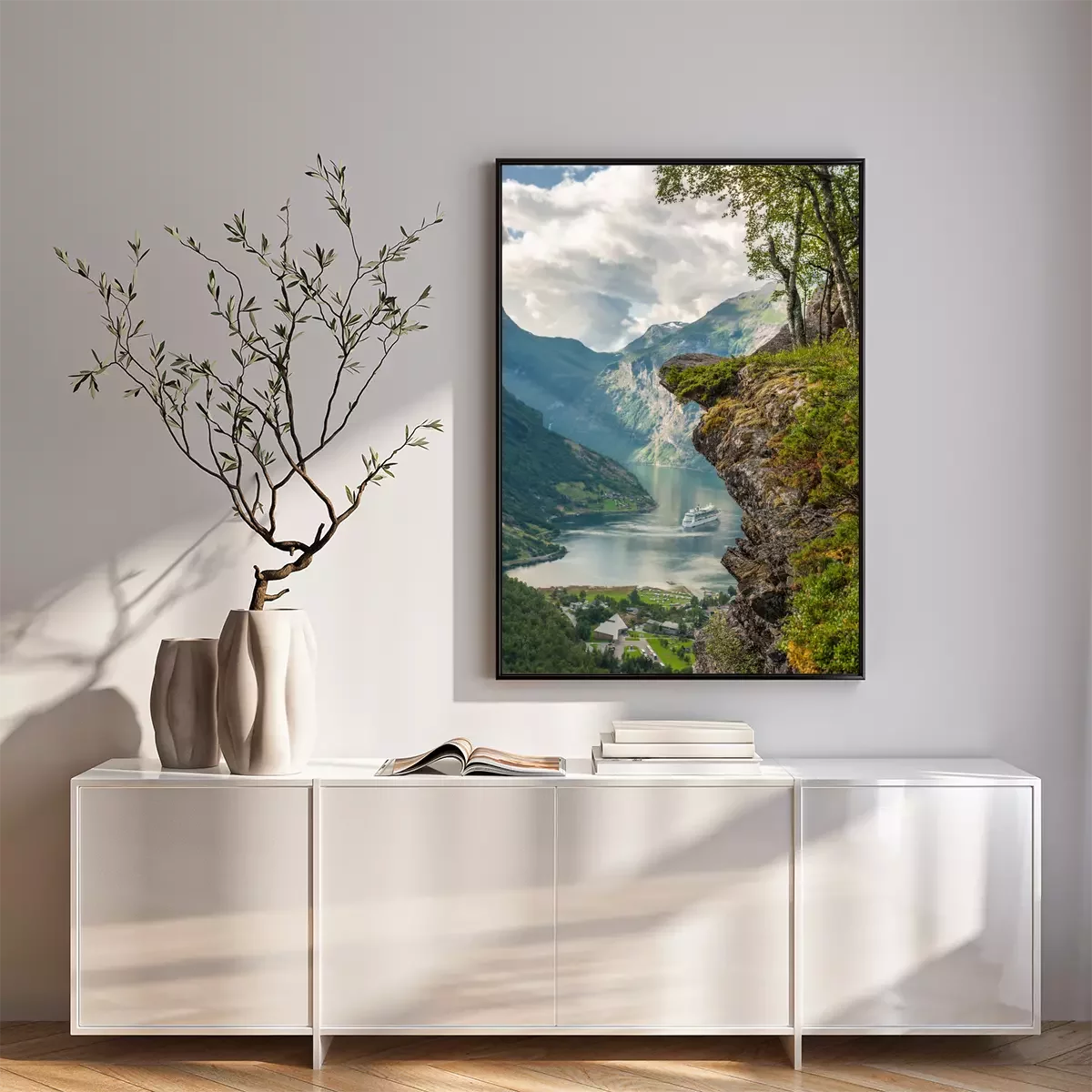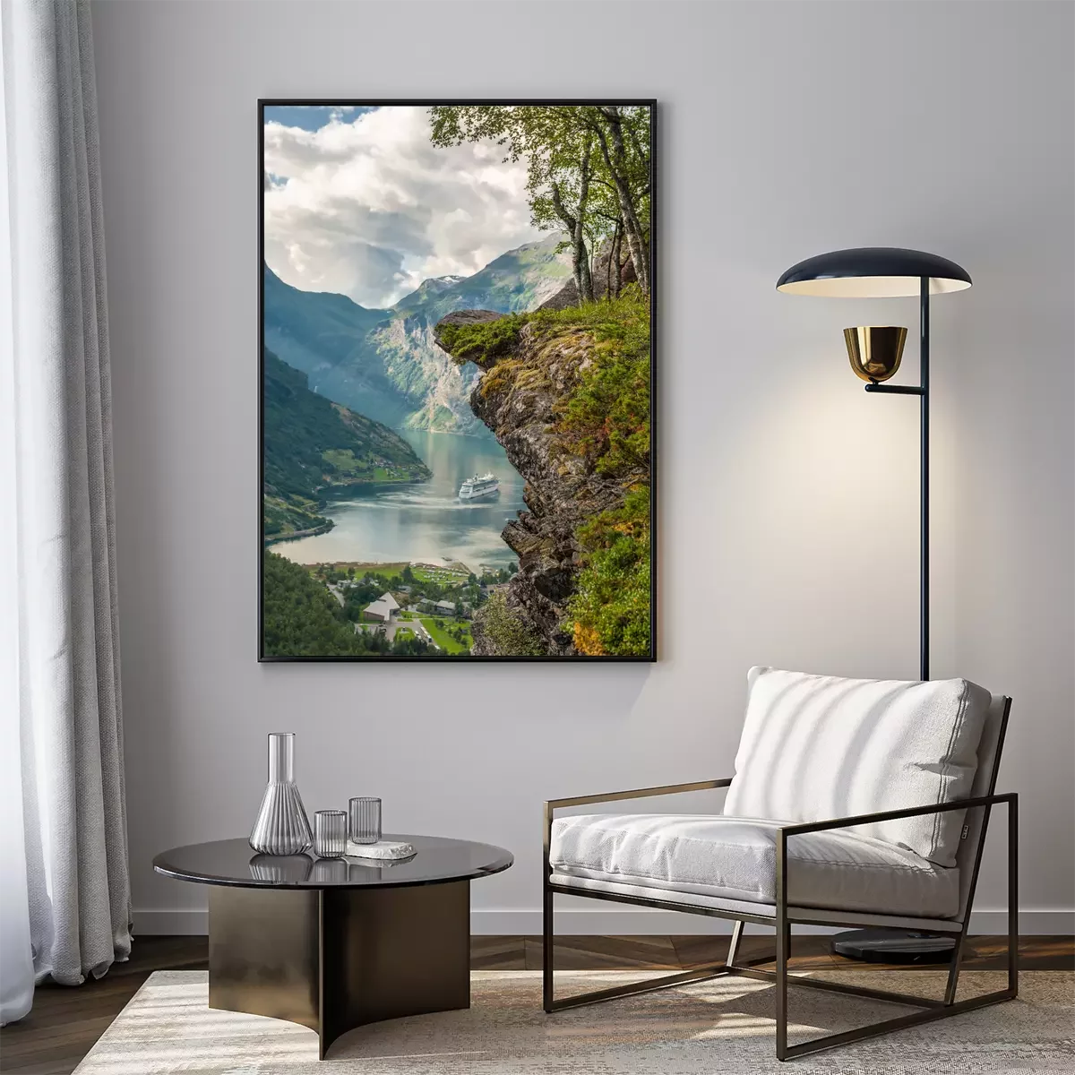 Poster: Landschaft mit einem Fjord und einem norwegischen Dorf
