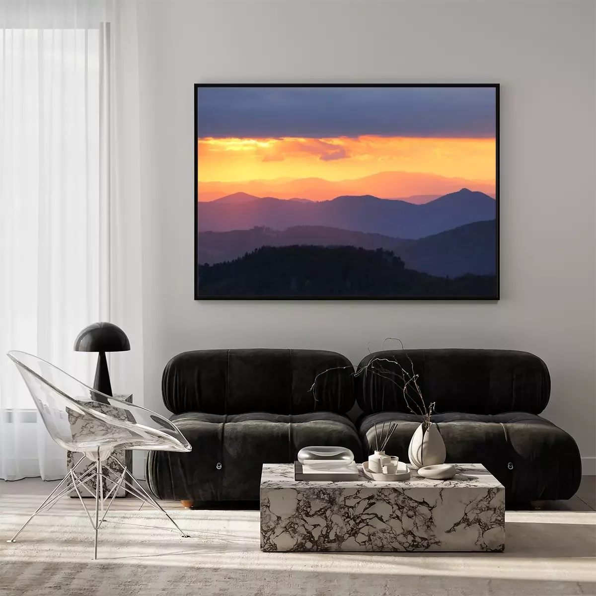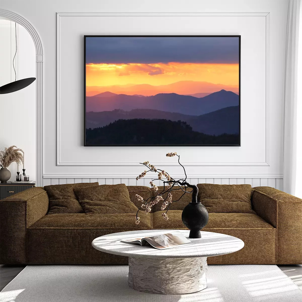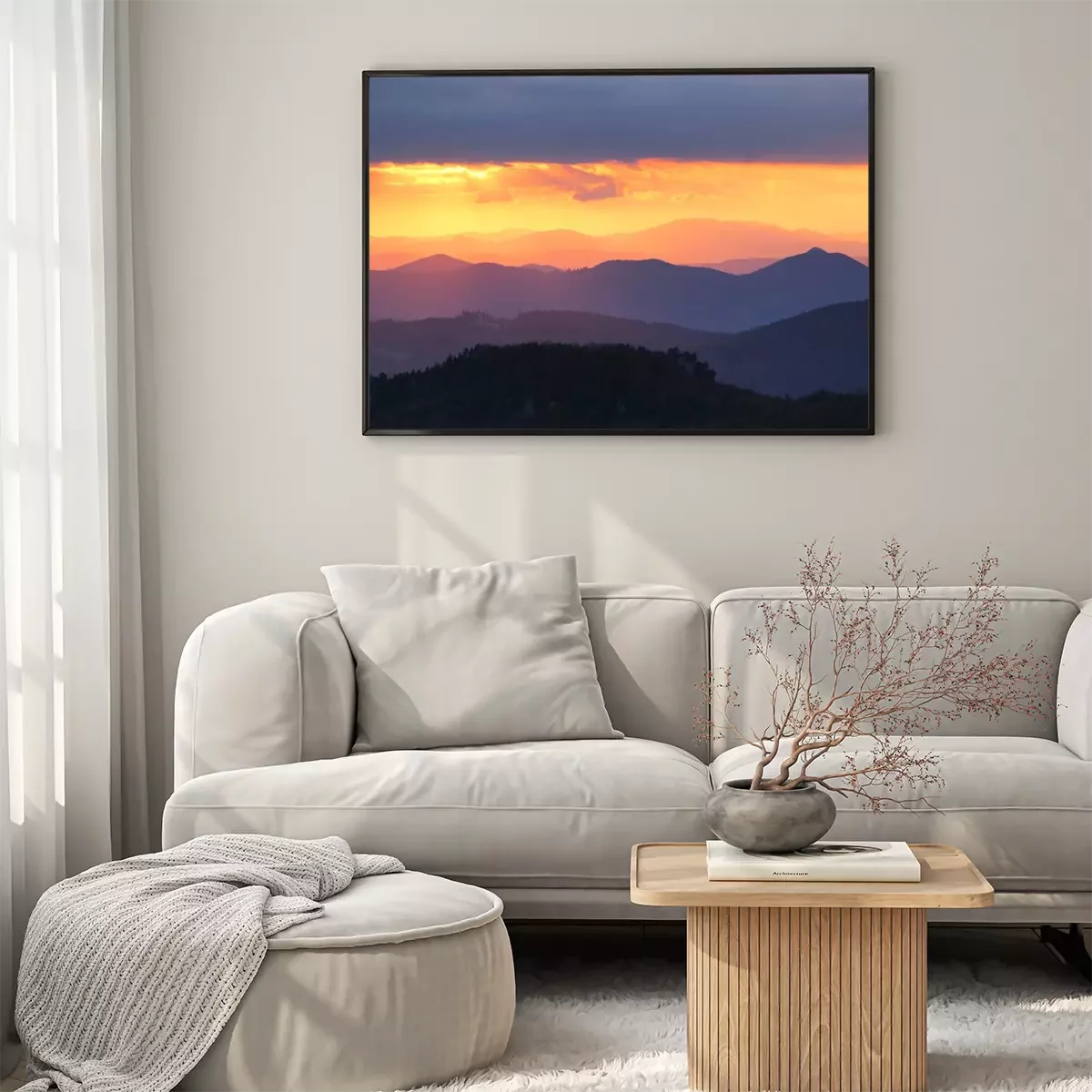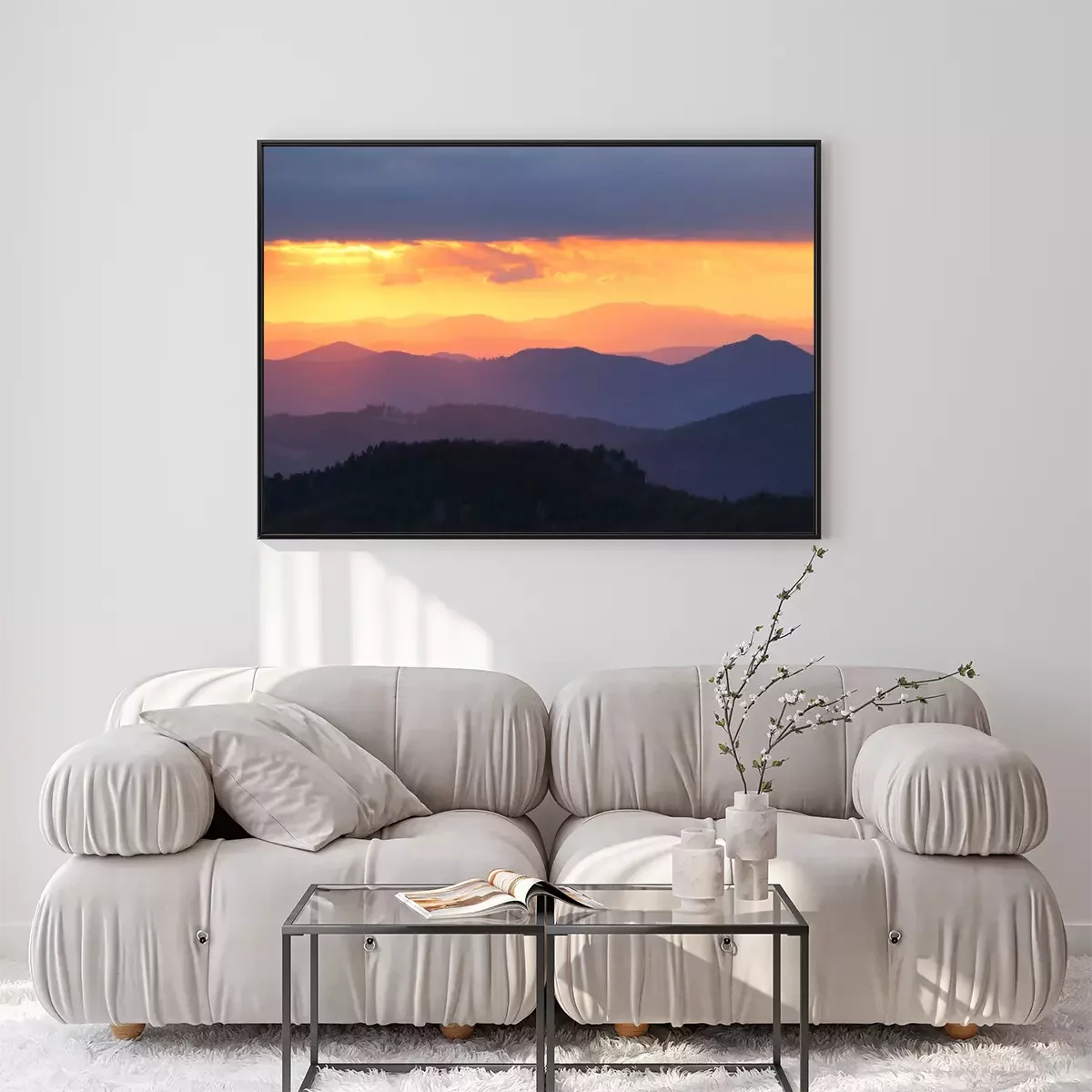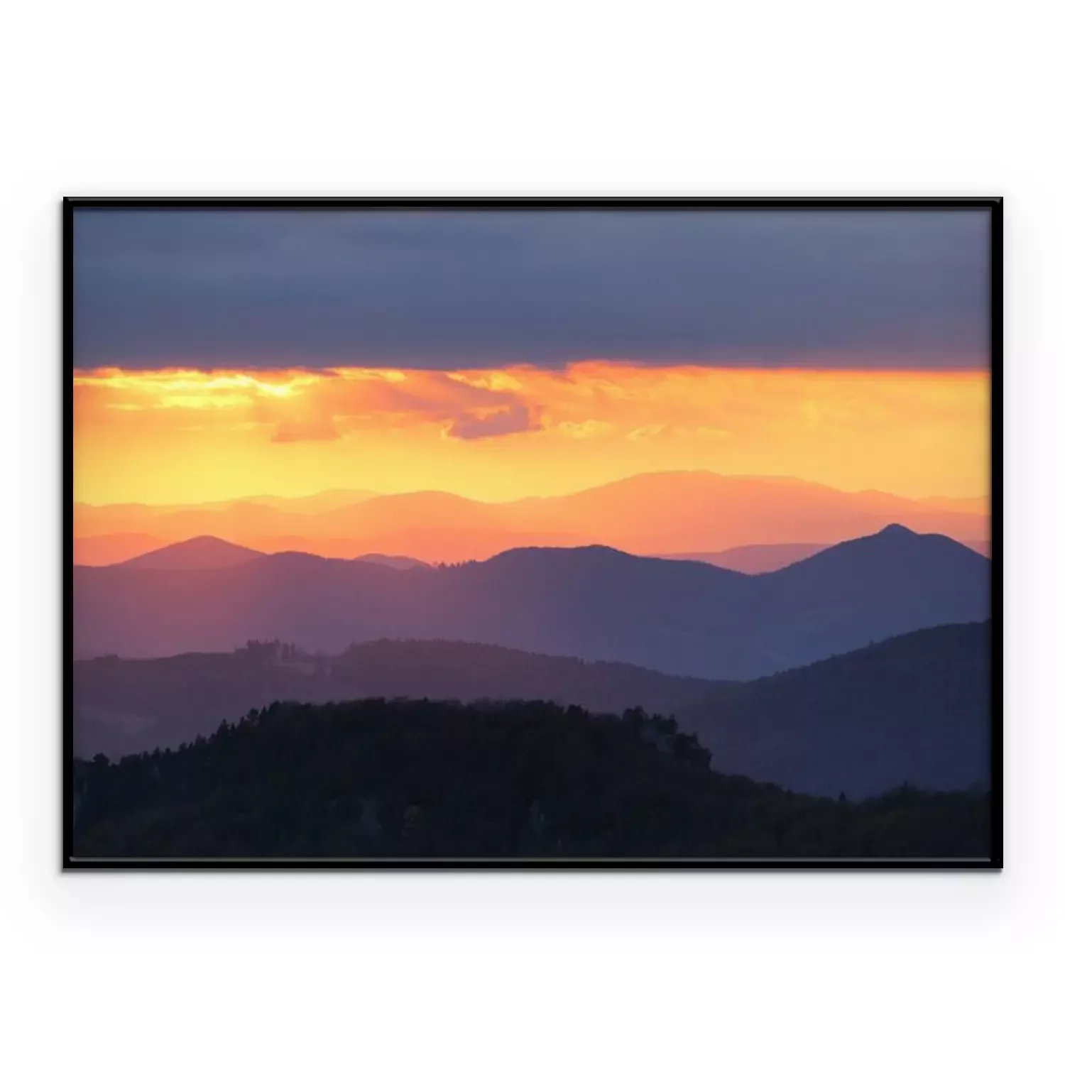 Poster Landschaft mit Sonnenuntergang in den Bergen