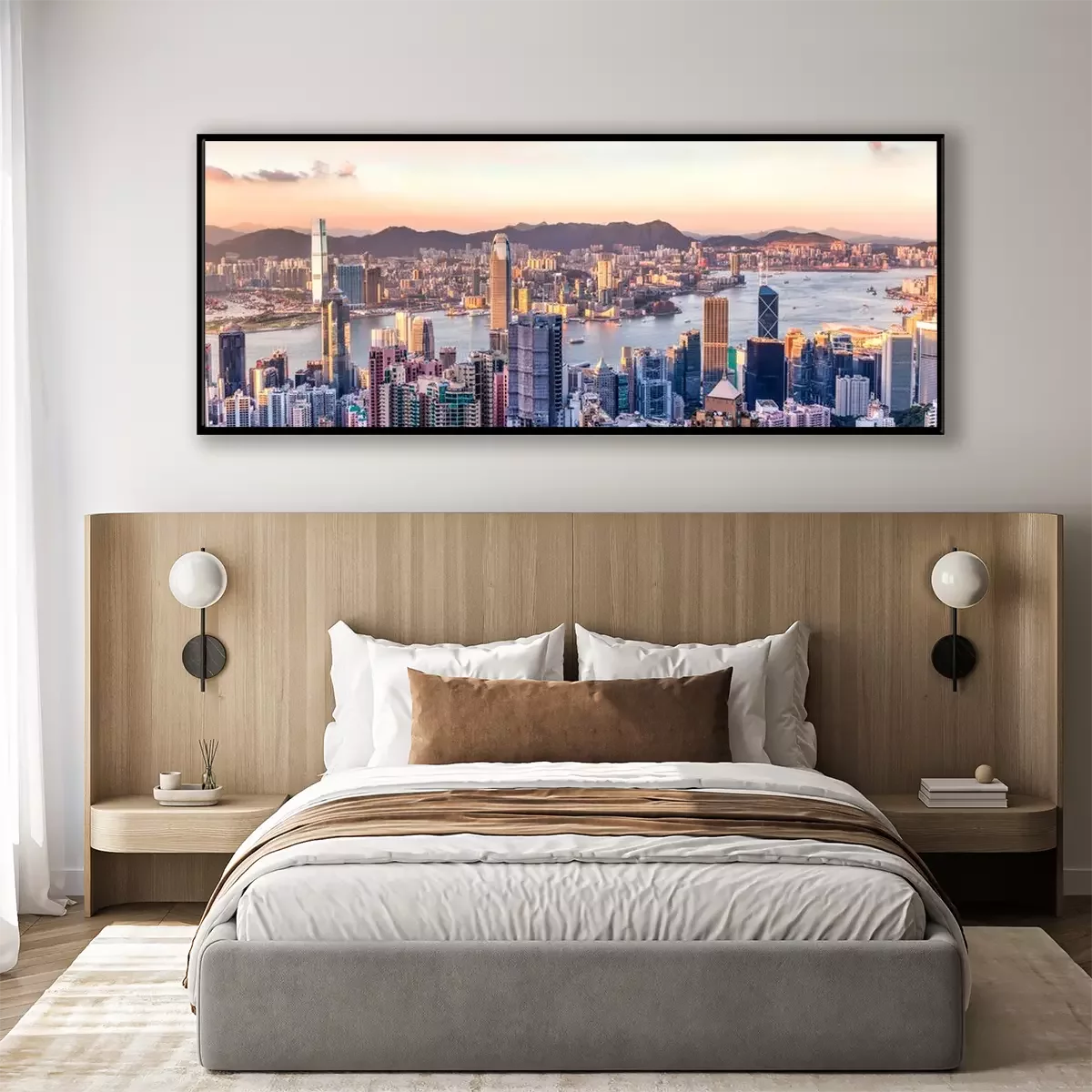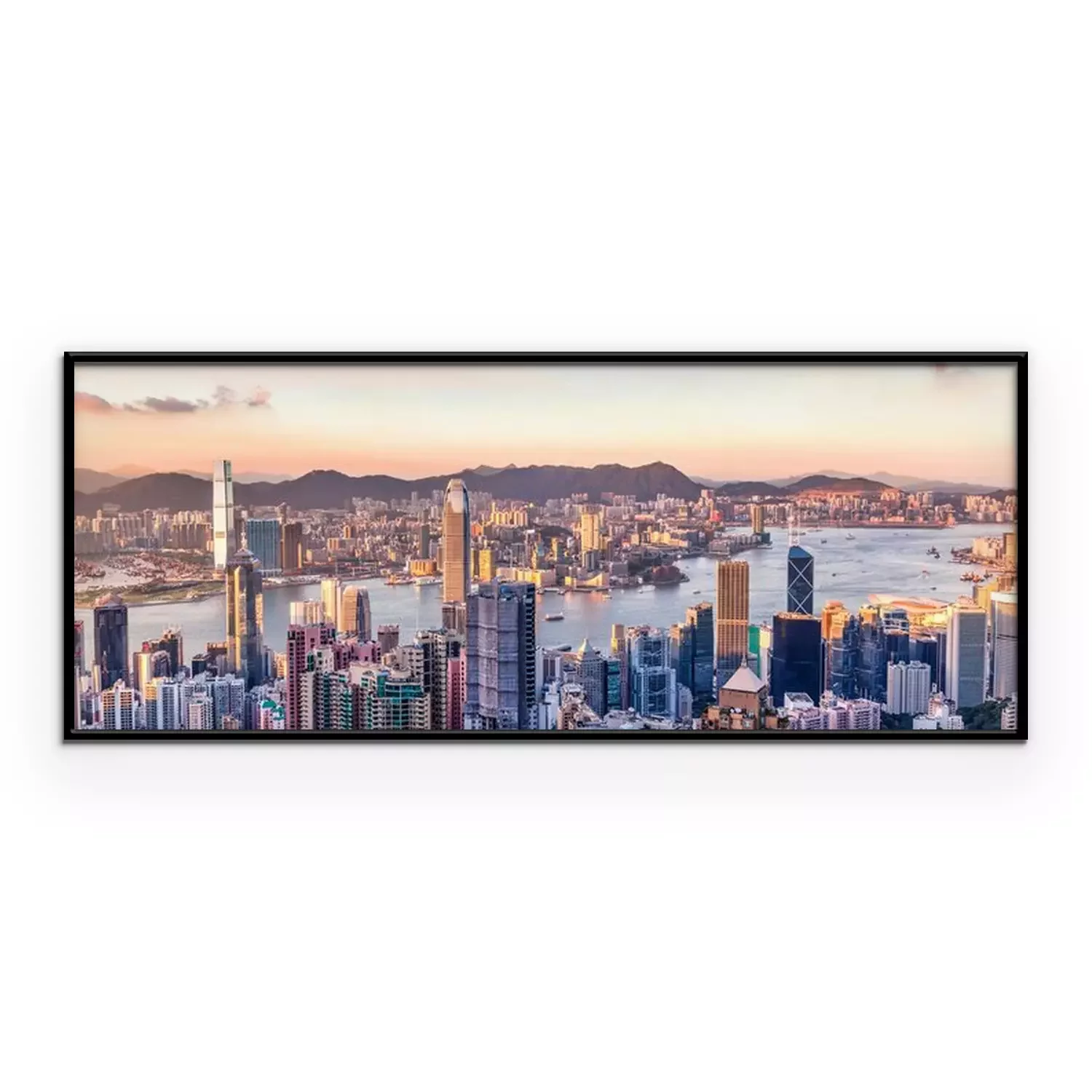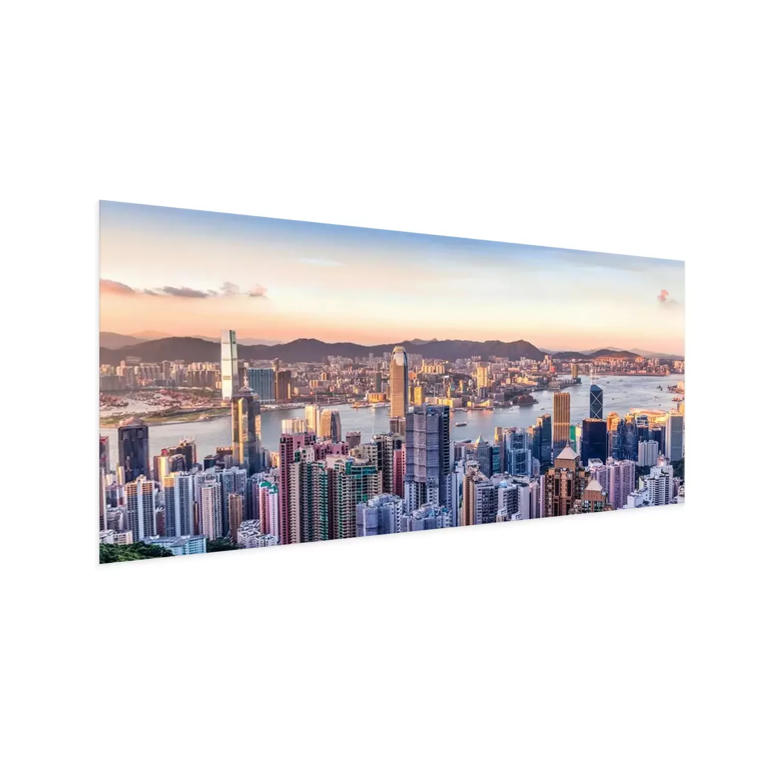 Poster Landschaft mit Sonnenuntergang und Wolkenkratzer