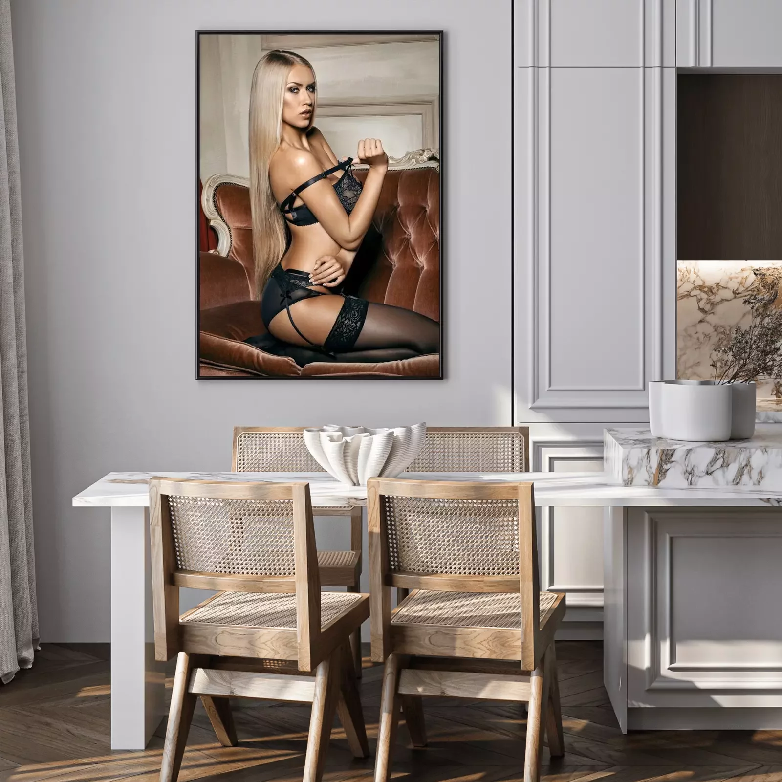 Poster Langhaarige Frau in schwarzer Lingerie posiert auf einem Sofa
