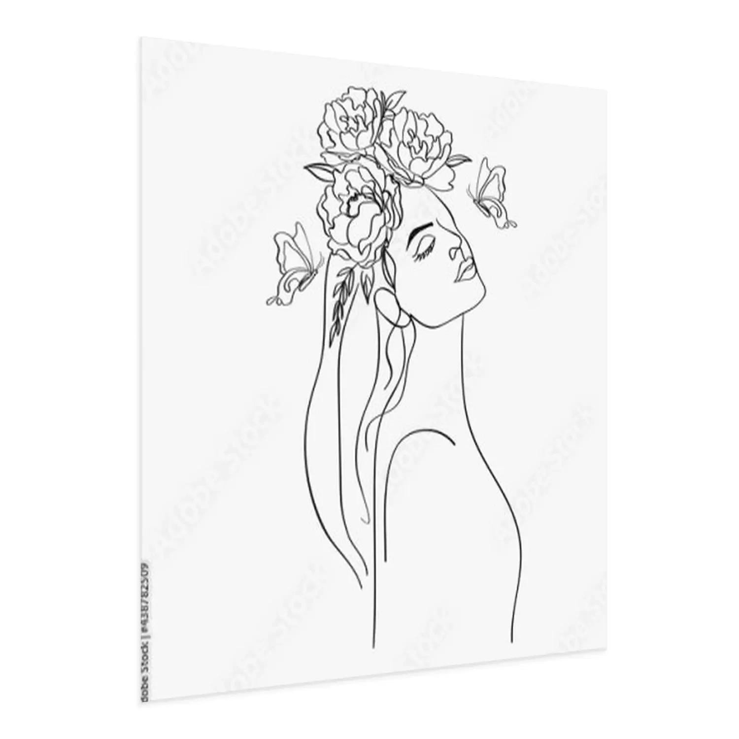 Poster: Langhaarige Frau mit einem Kranz aus Pfingstrosen