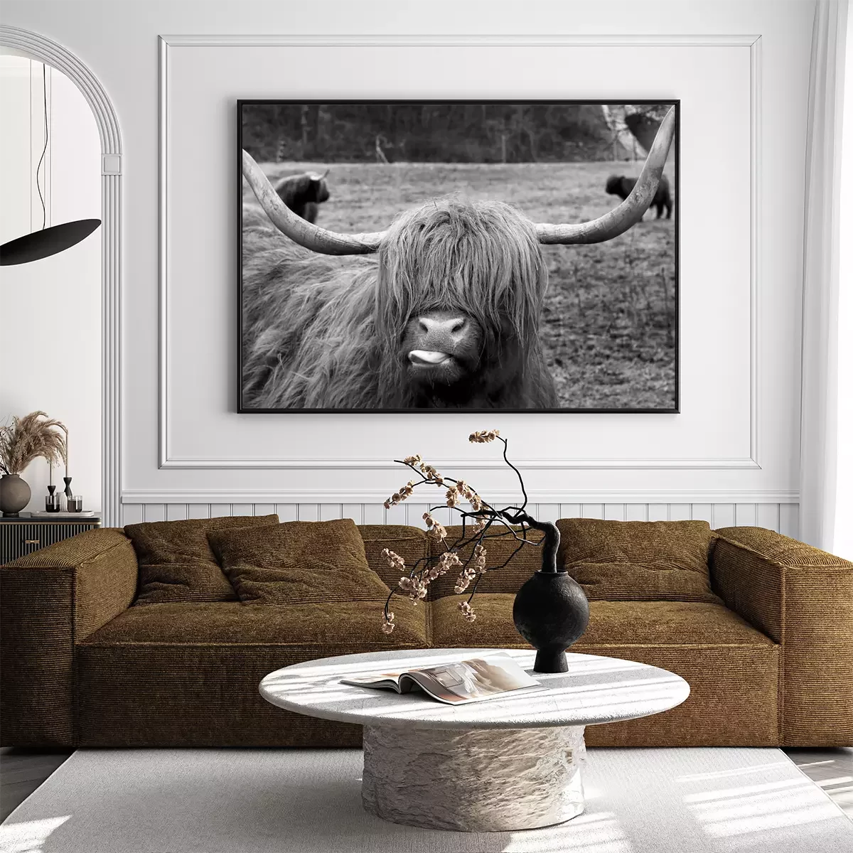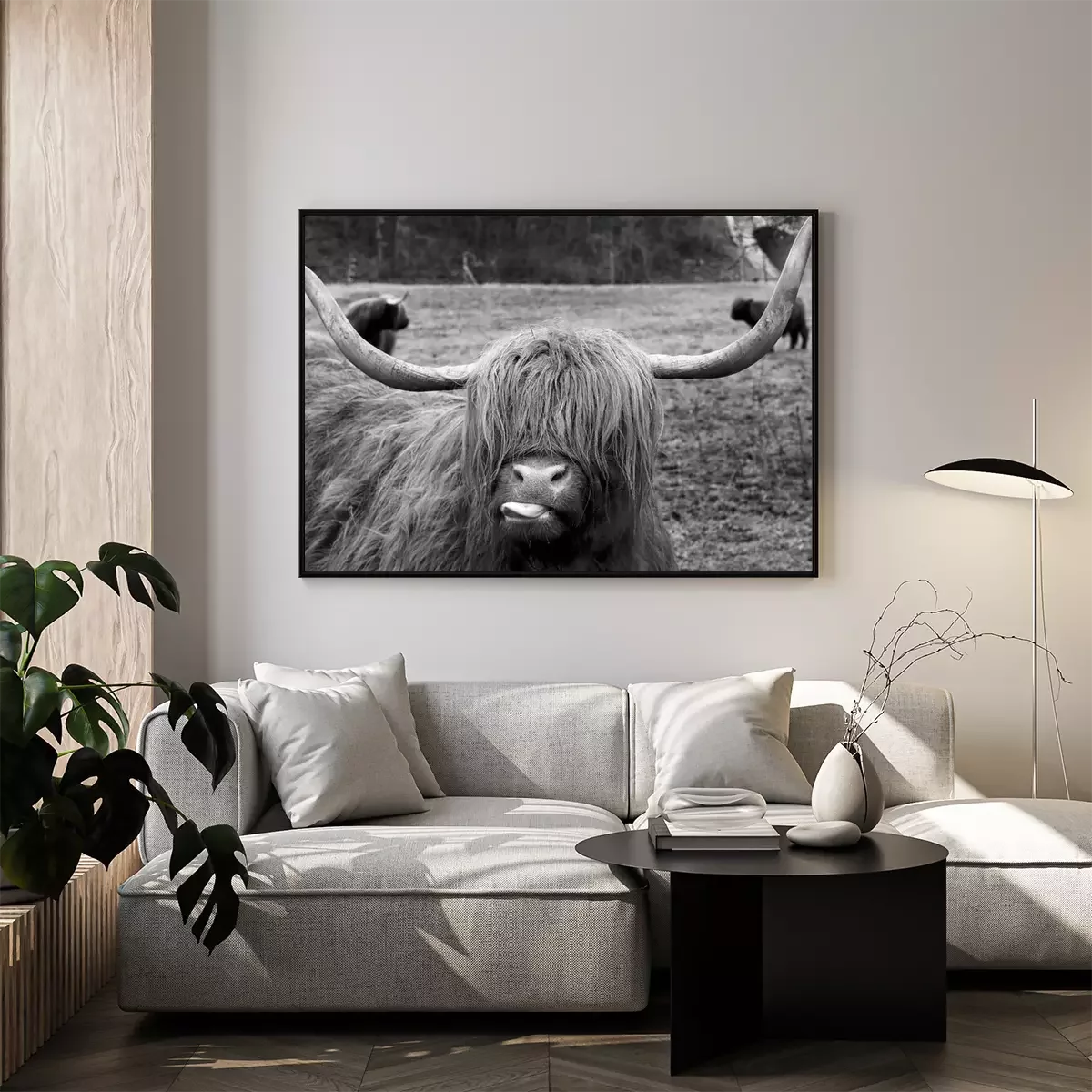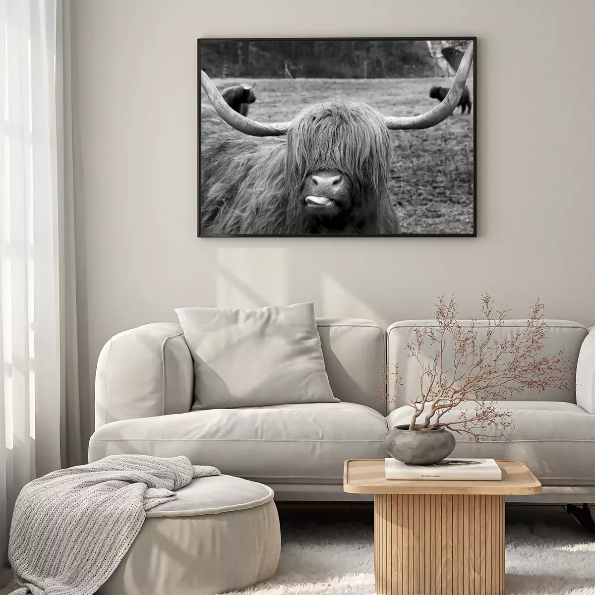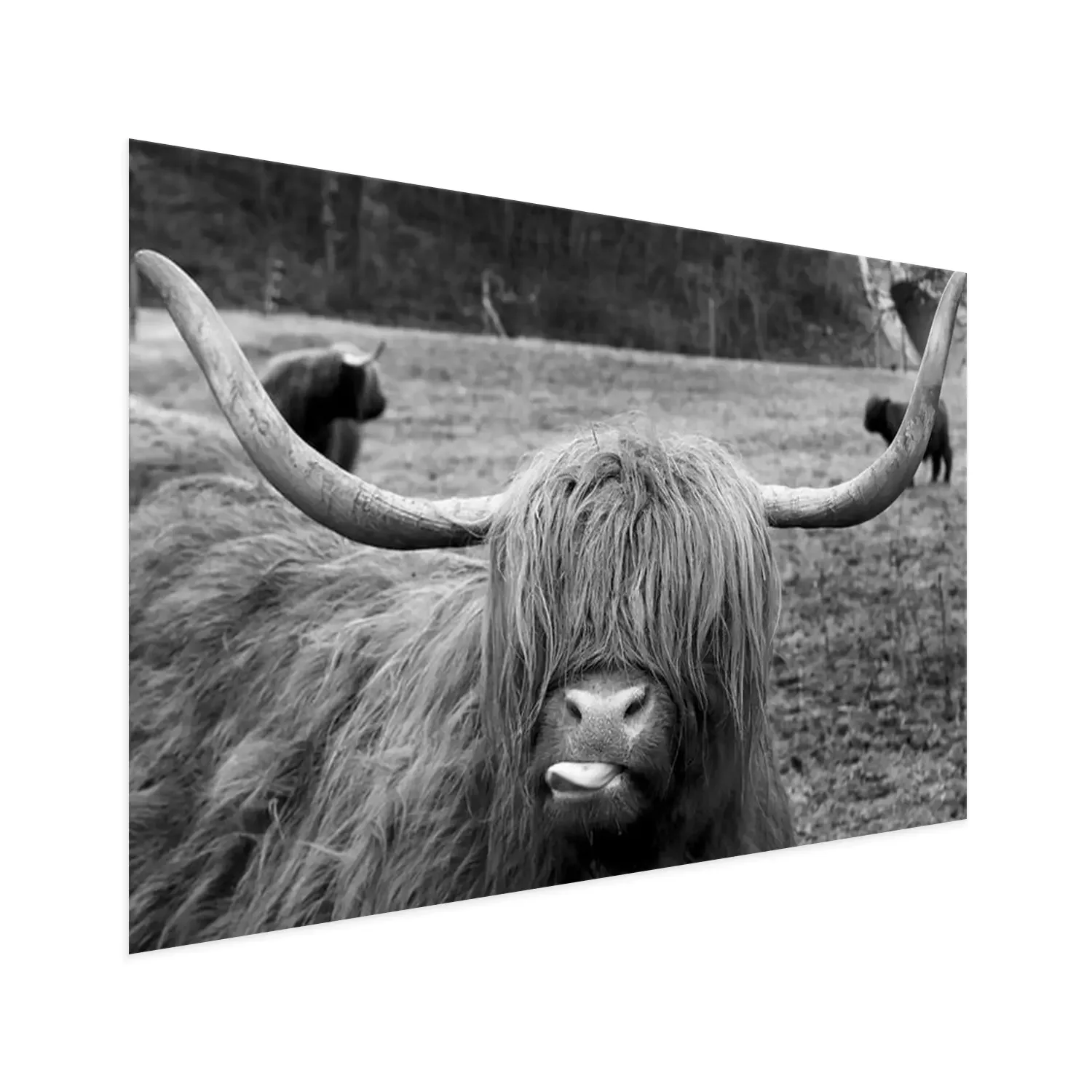 Poster: Langhaarige Kuh mit freiliegender Zunge