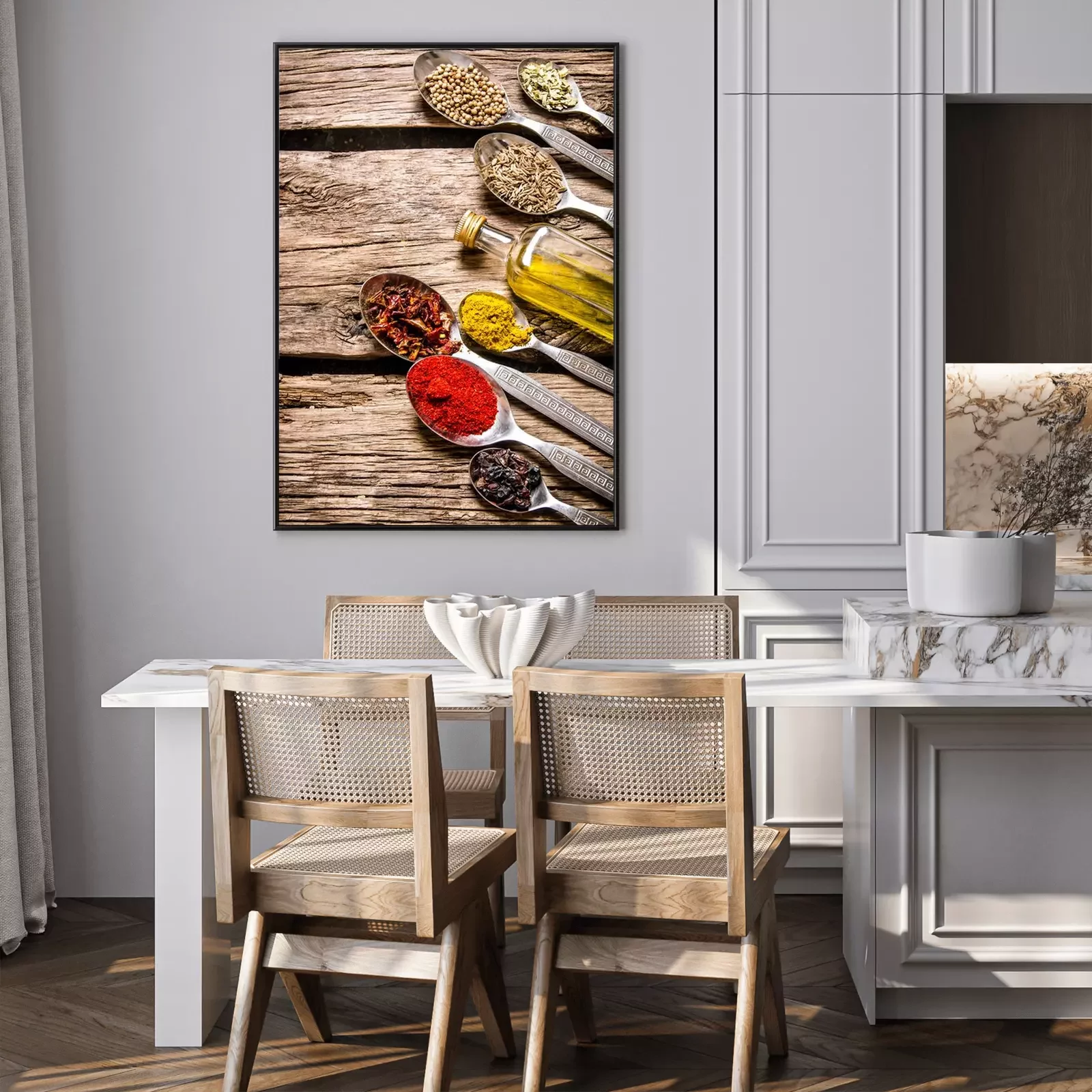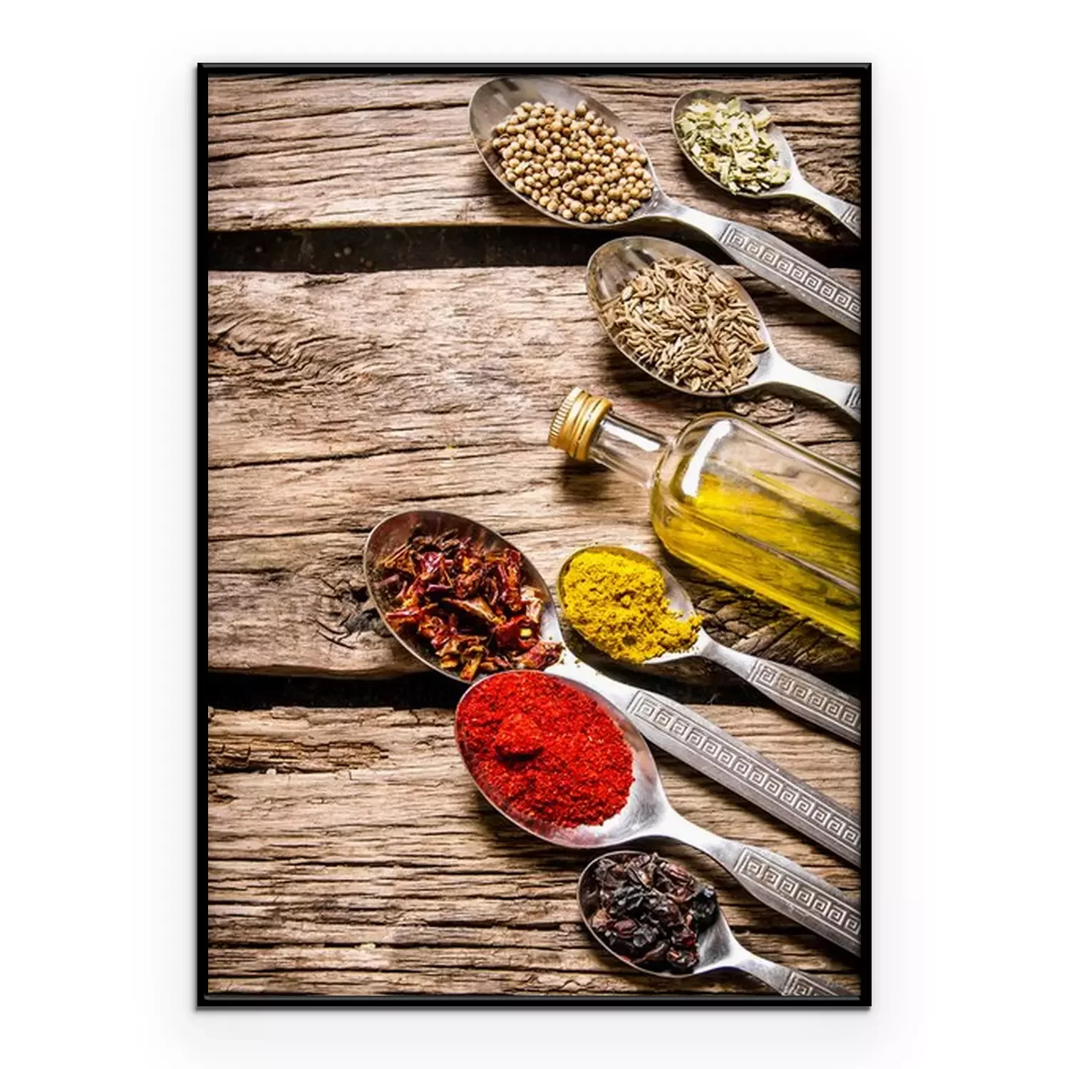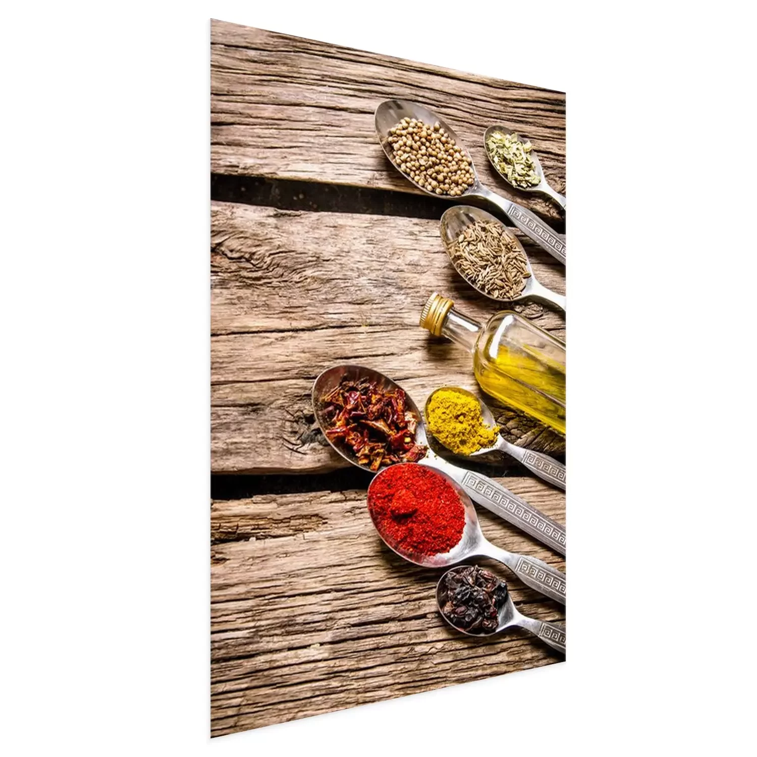 Poster: Löffel mit Gewürze neben dem Olivenöl