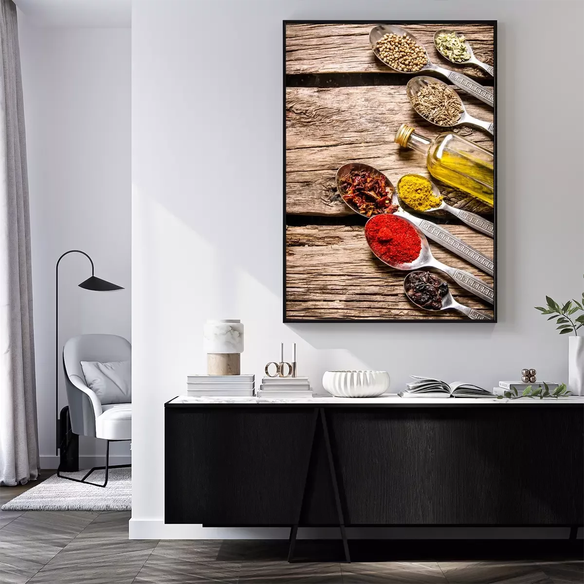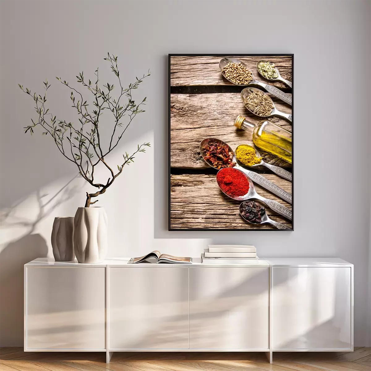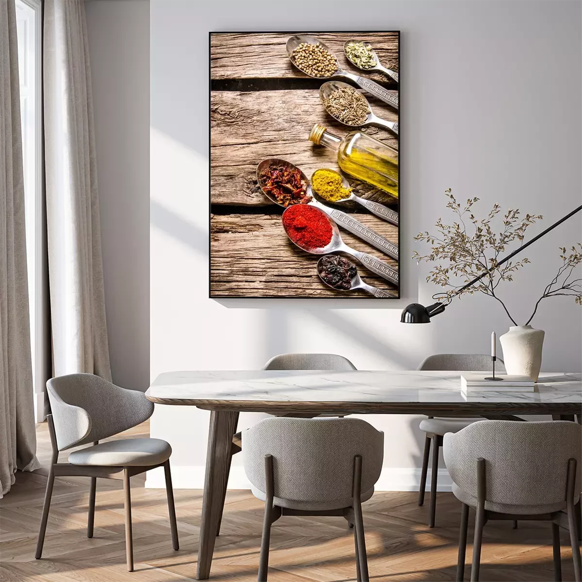 Poster: Löffel mit Gewürze neben dem Olivenöl