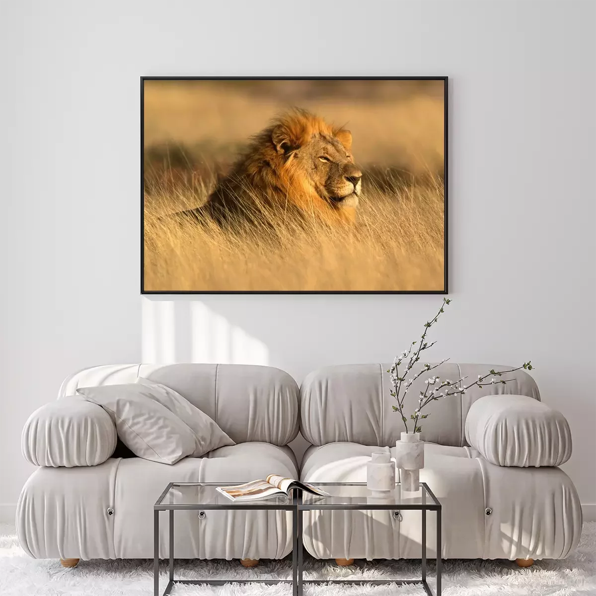 Poster Löwe in der Savanne im Gras