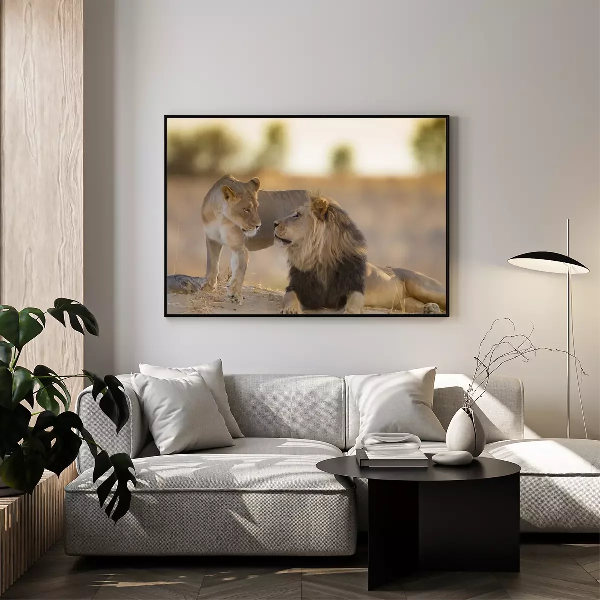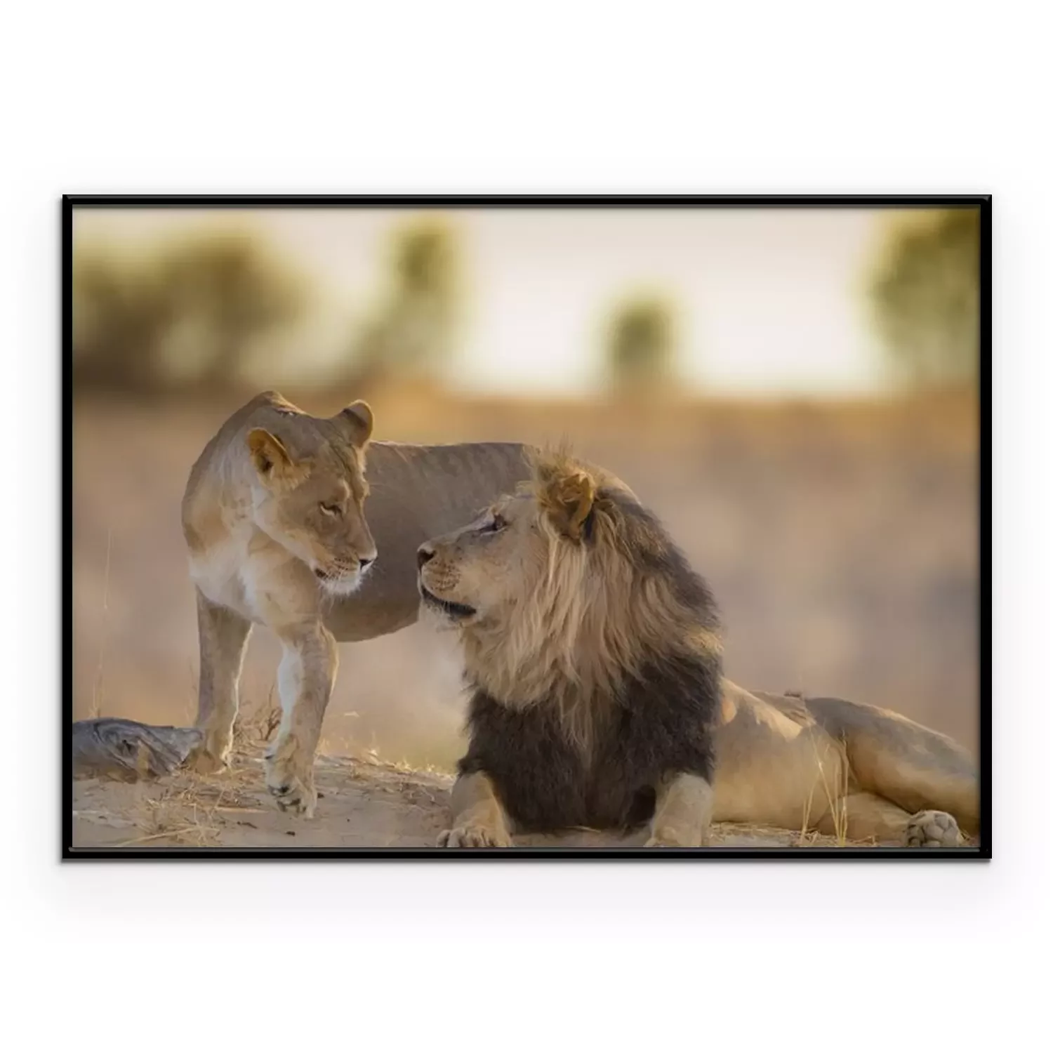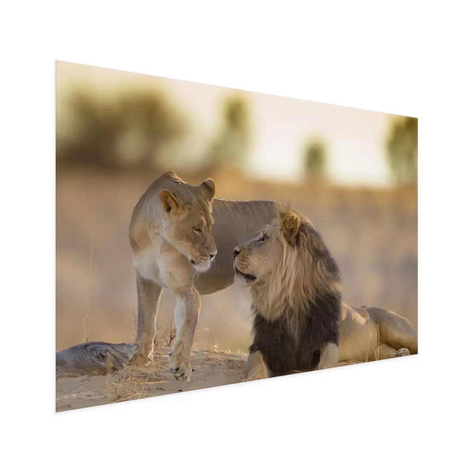 Poster: Löwe und Löwin bei Sonnenuntergang