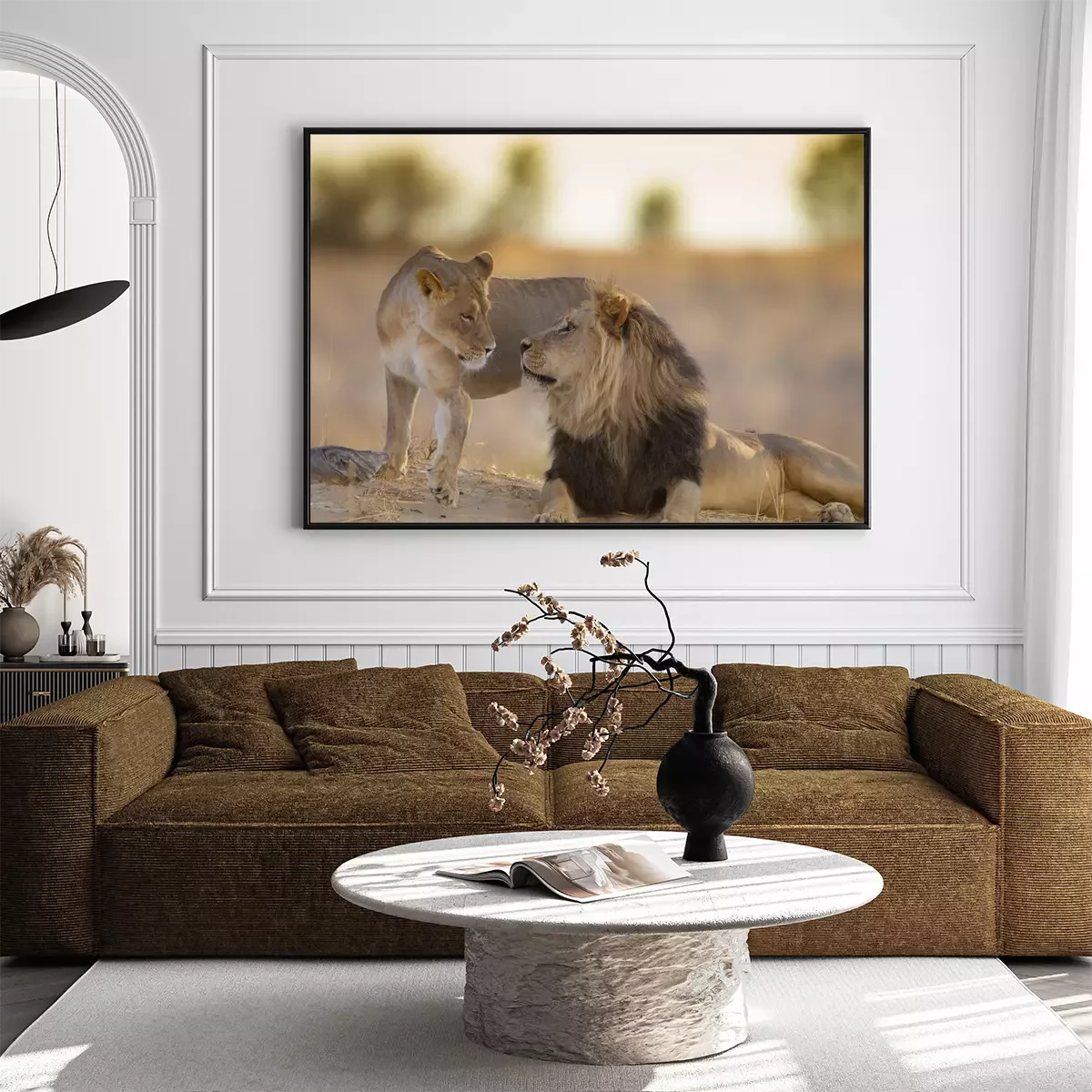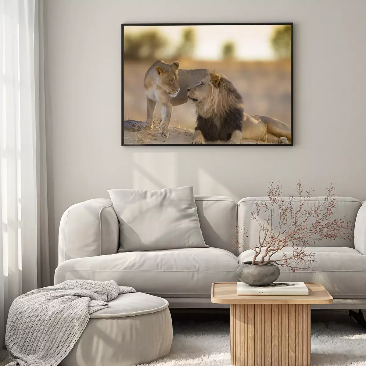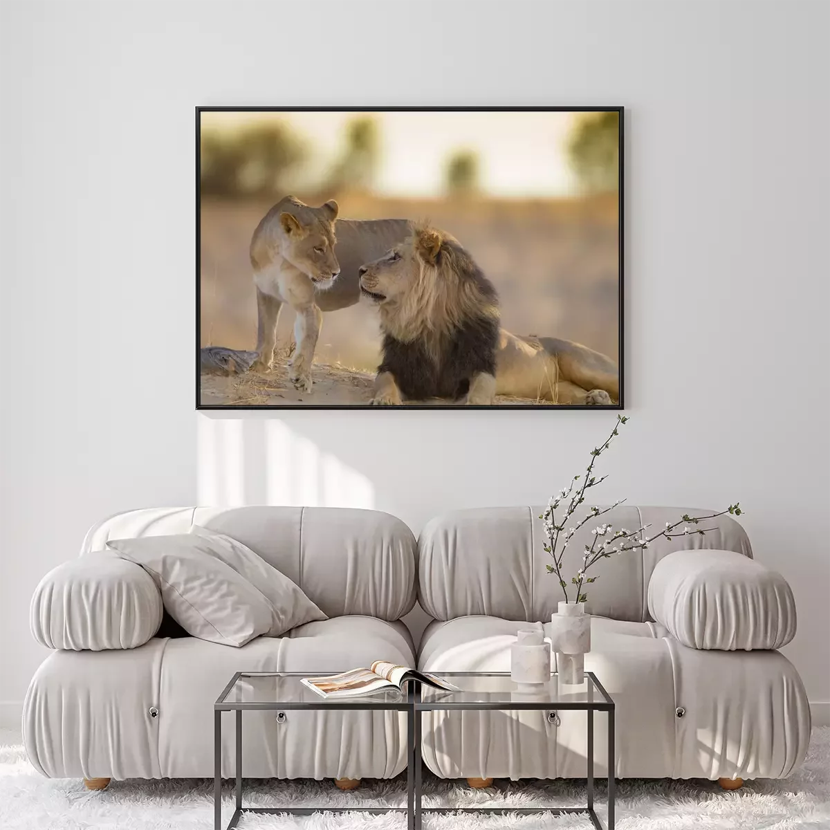 Poster: Löwe und Löwin bei Sonnenuntergang