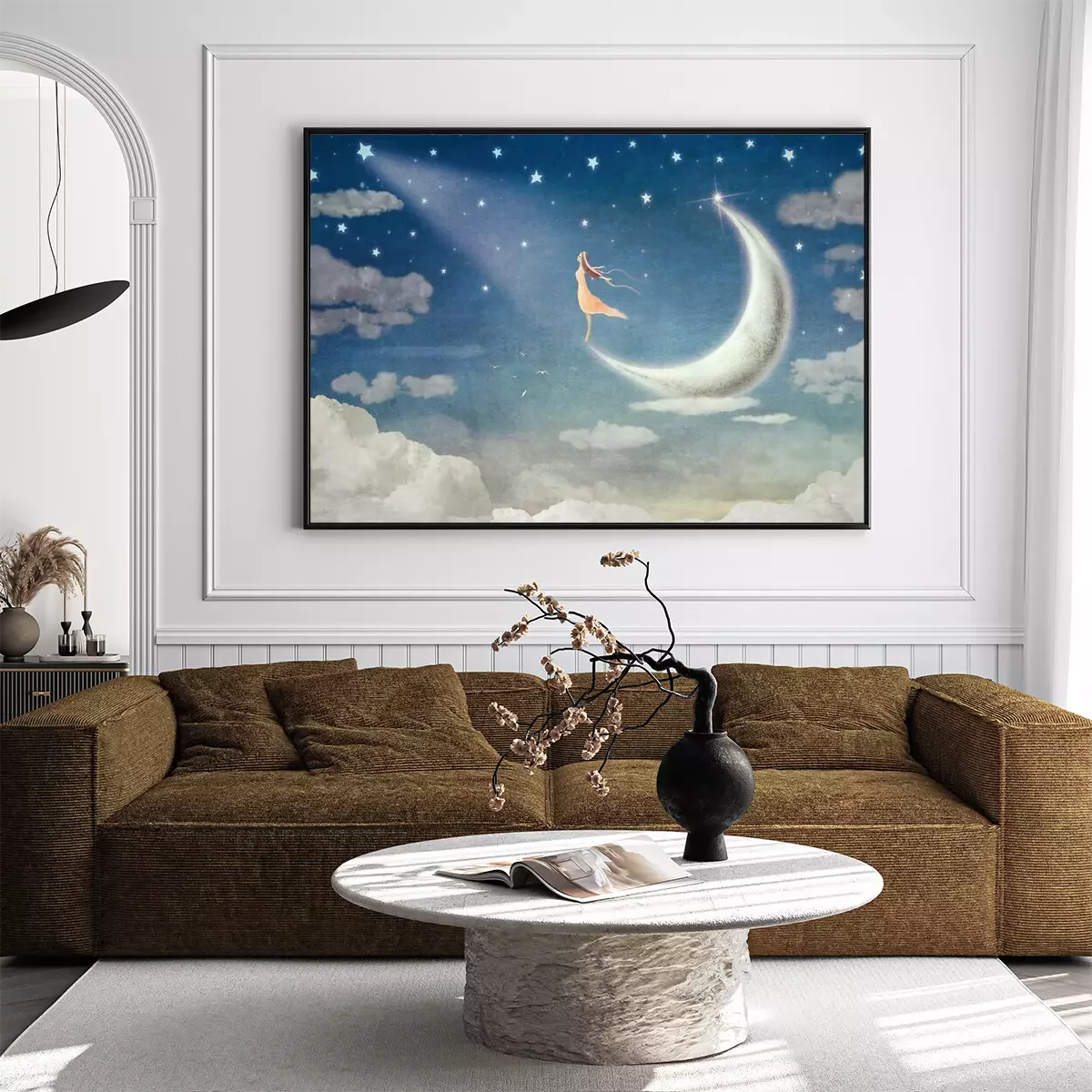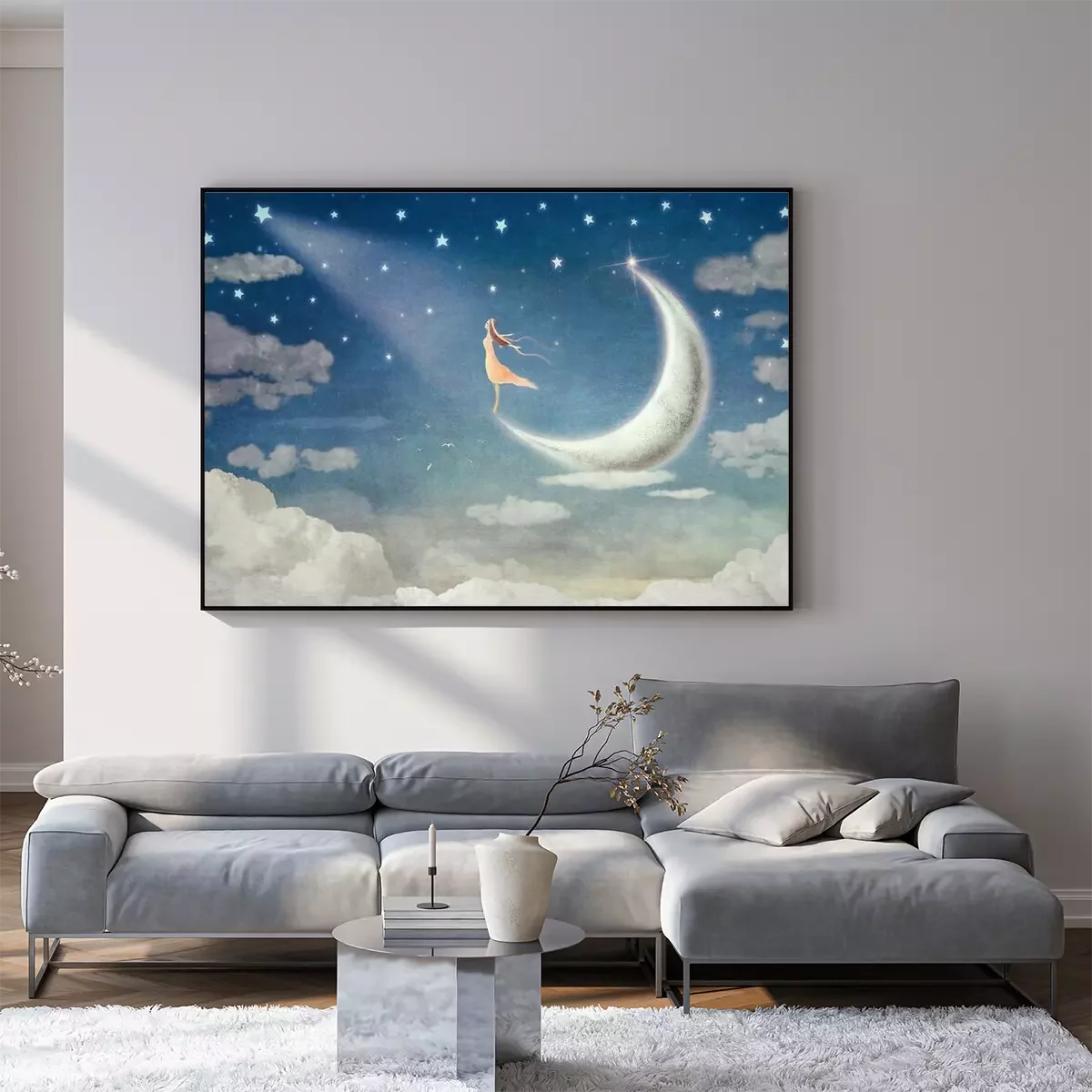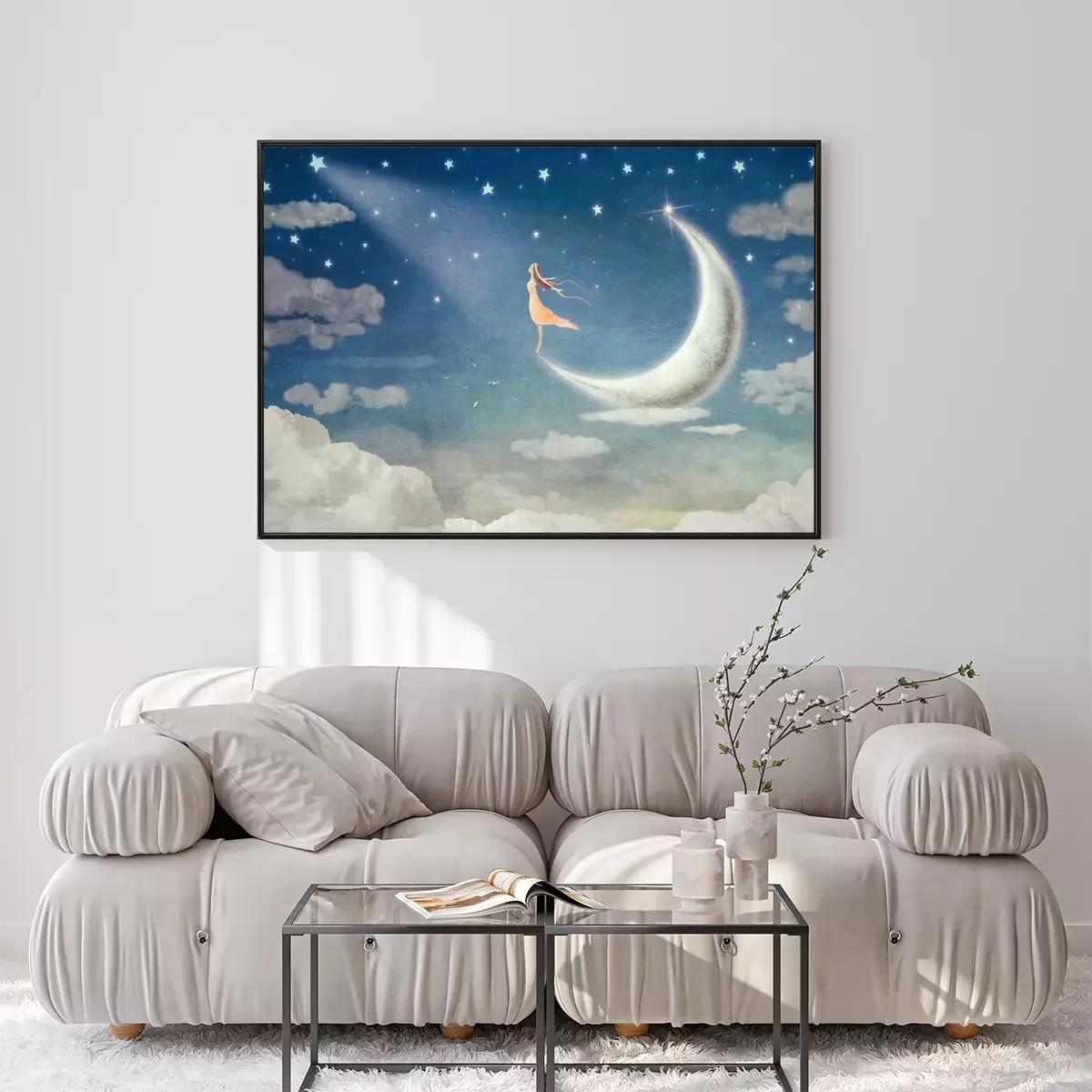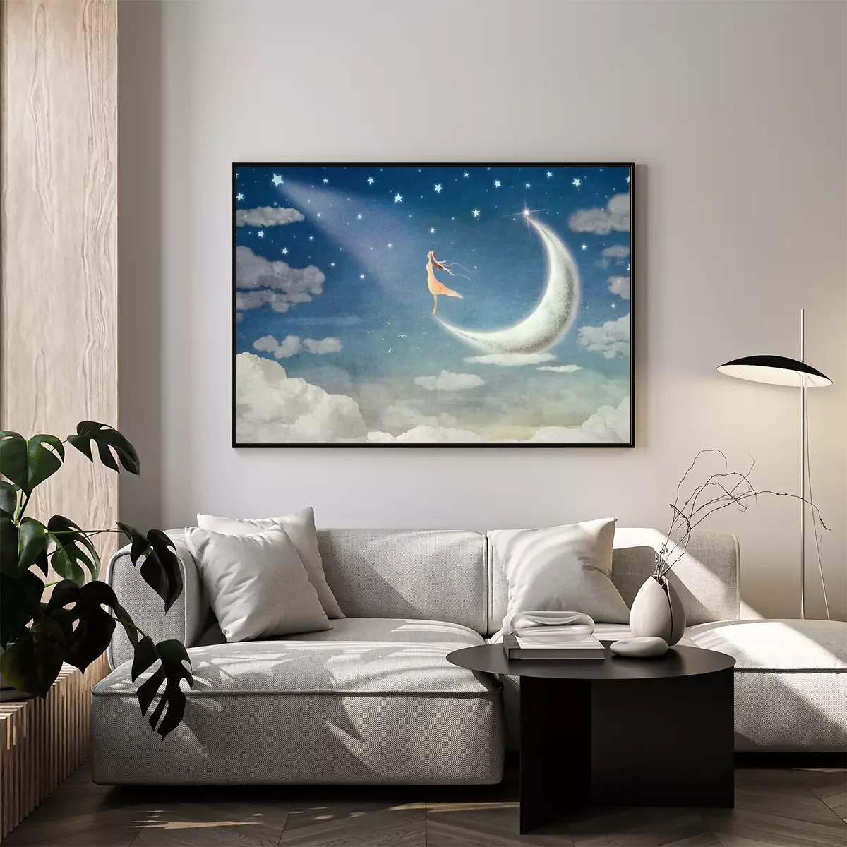 Poster Mädchen auf dem Mond, beleuchtet von einem Stern