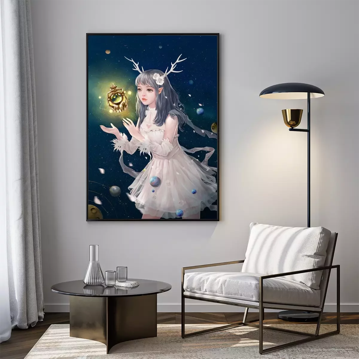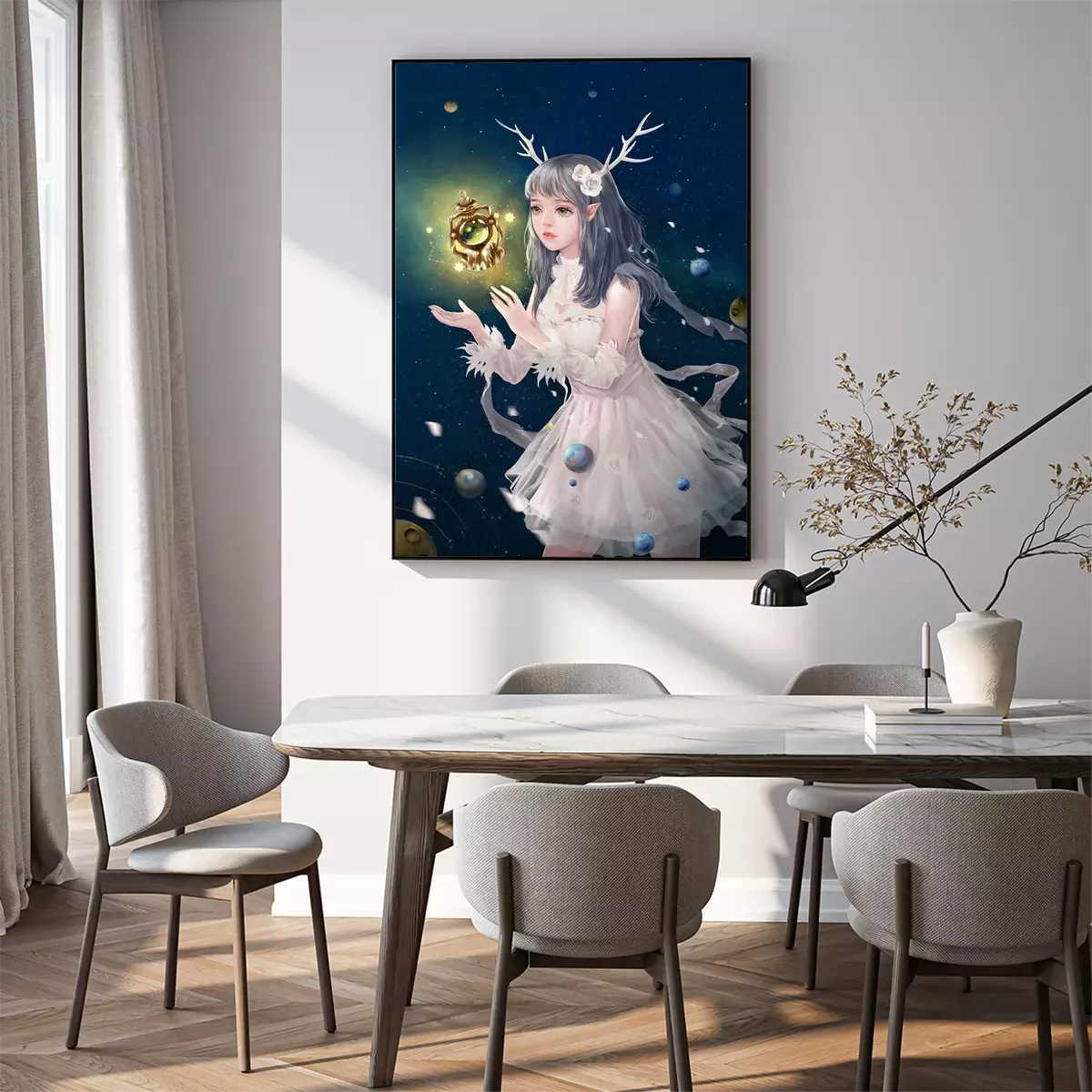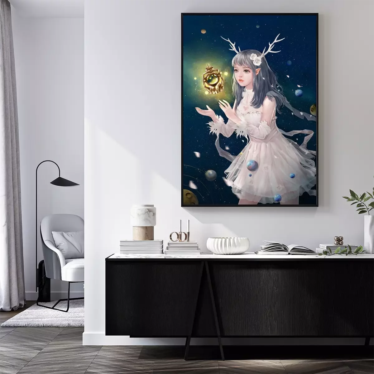 Poster: Mädchen mit Elfenohren und kosmischem Hintergrund