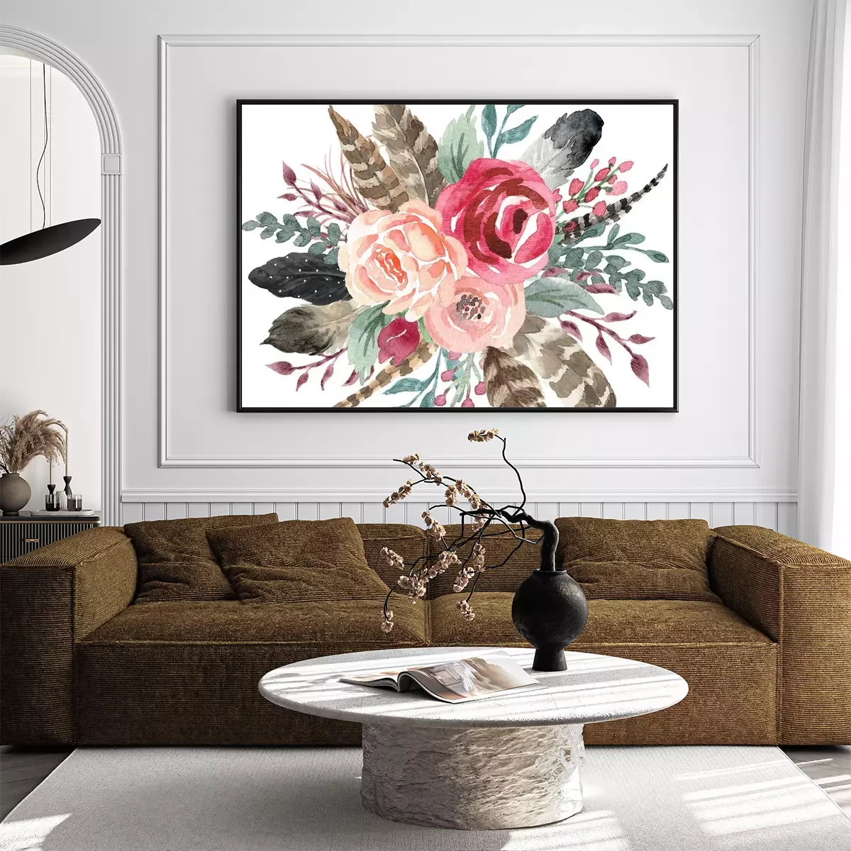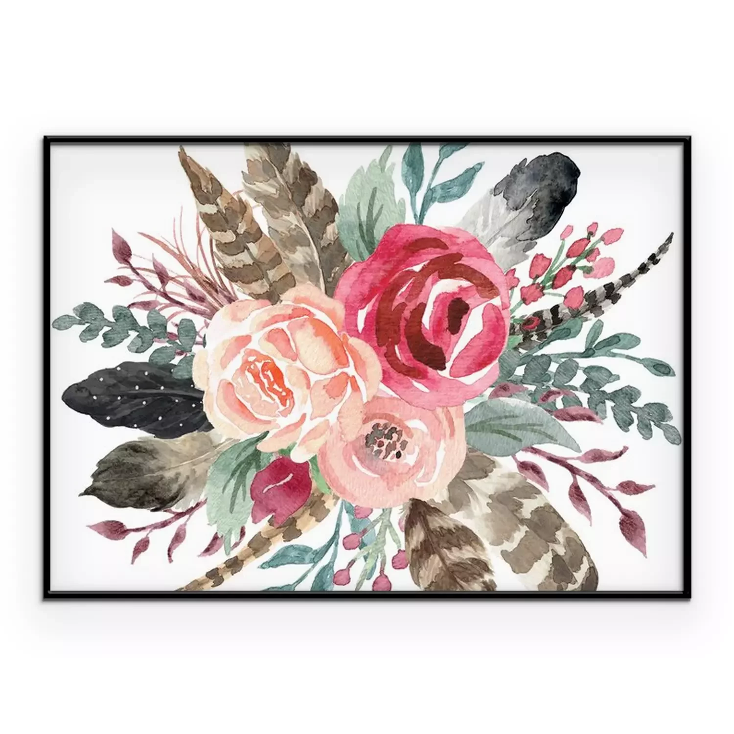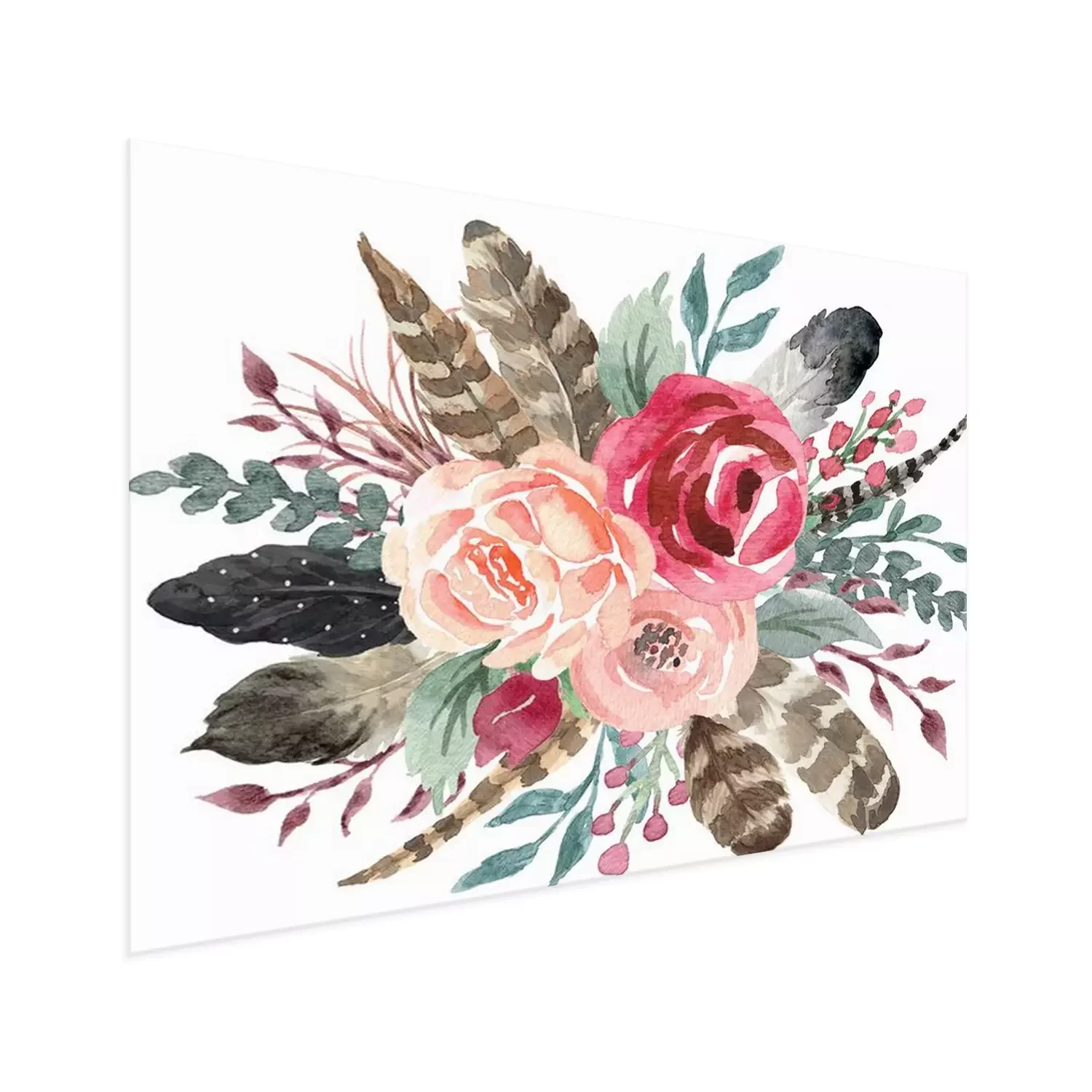 Poster: Märchenhafte Pfingstrosen umgeben von Blättern und Federn