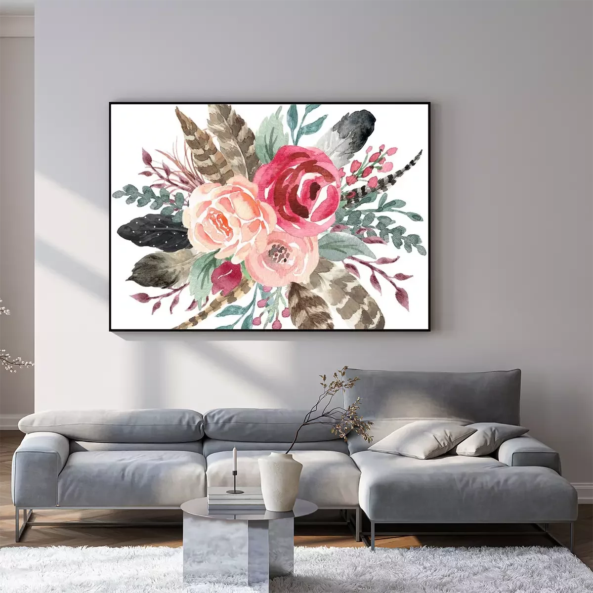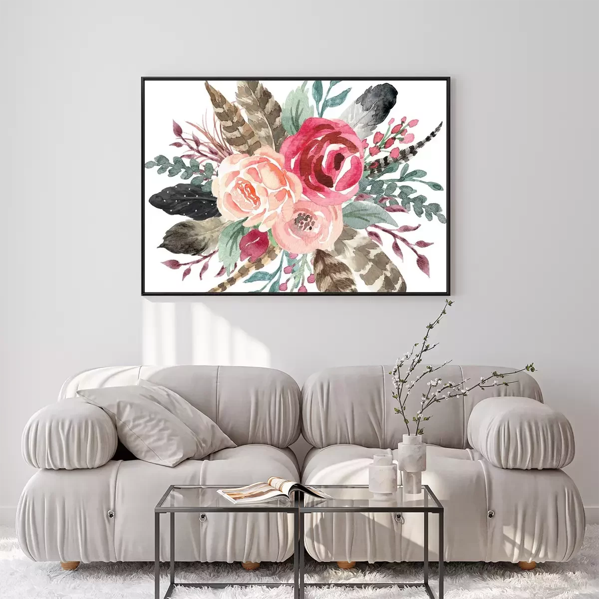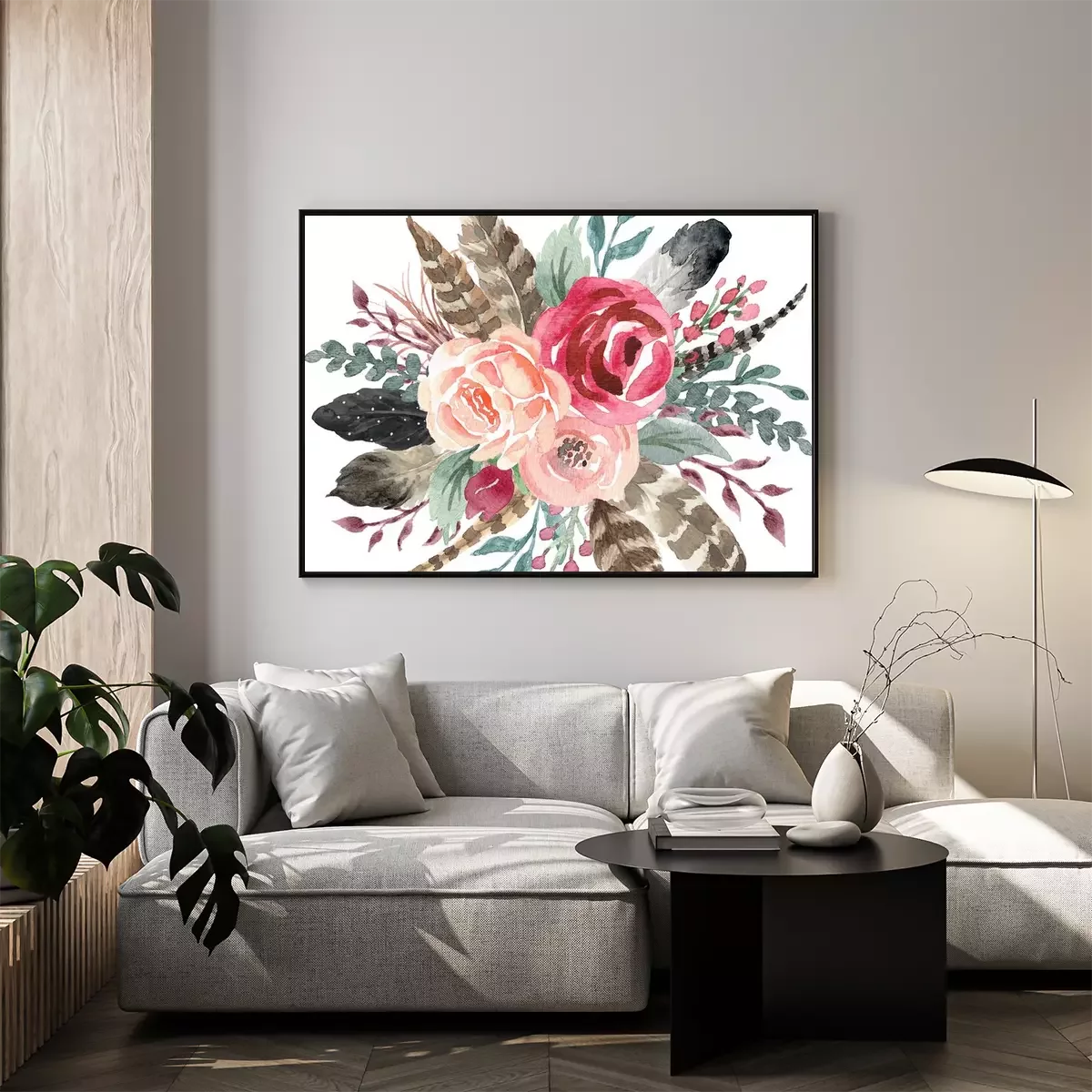 Poster: Märchenhafte Pfingstrosen umgeben von Blättern und Federn