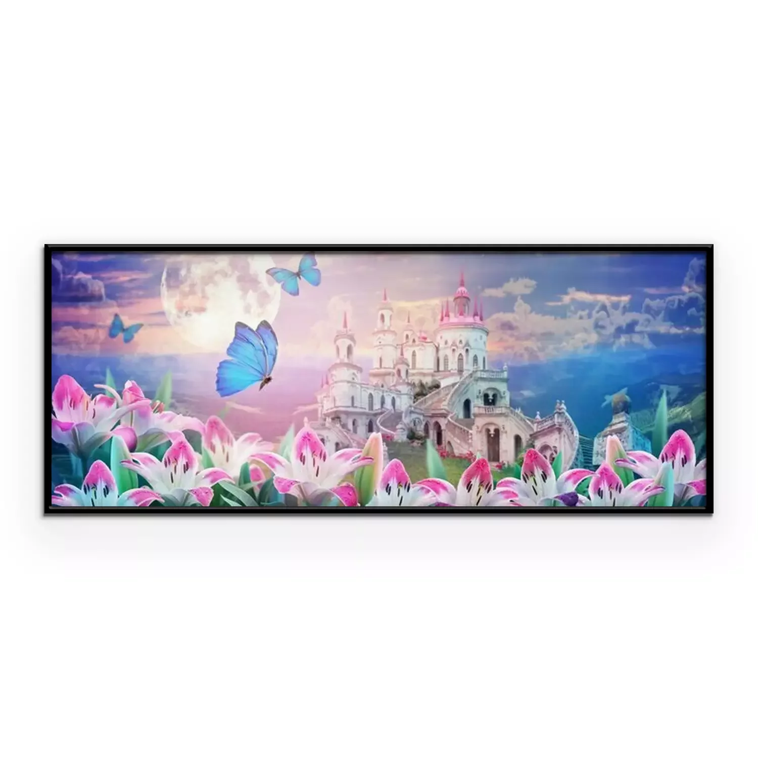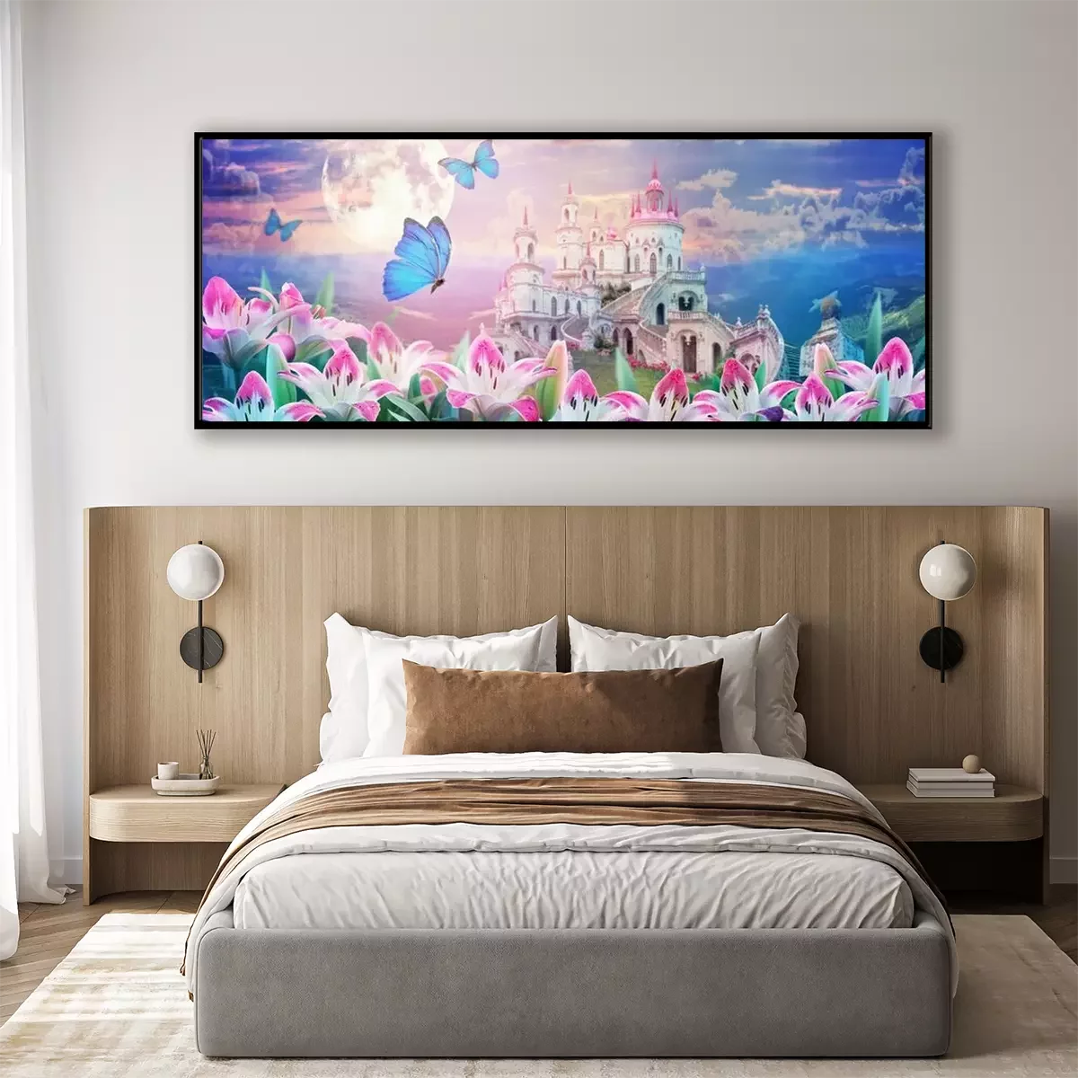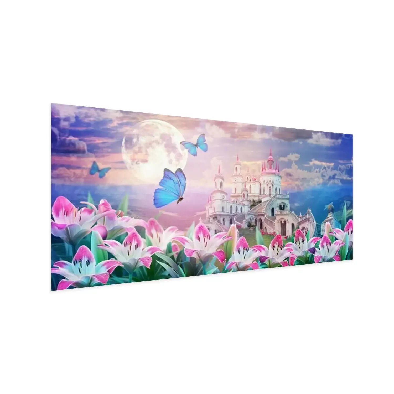 Poster: Märchenhaftes Schloss mit blauen Schmetterlingen und Lilien