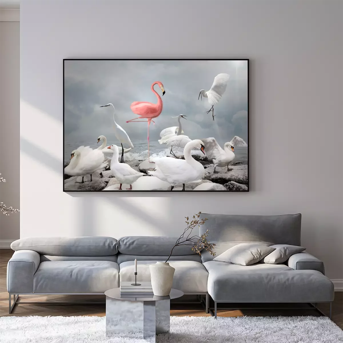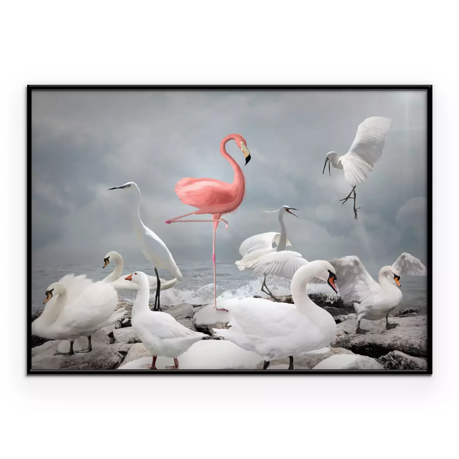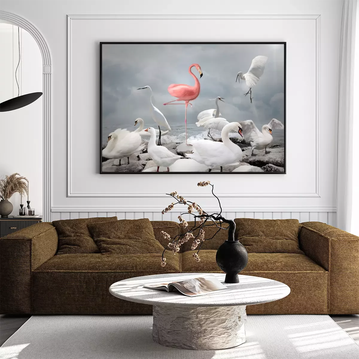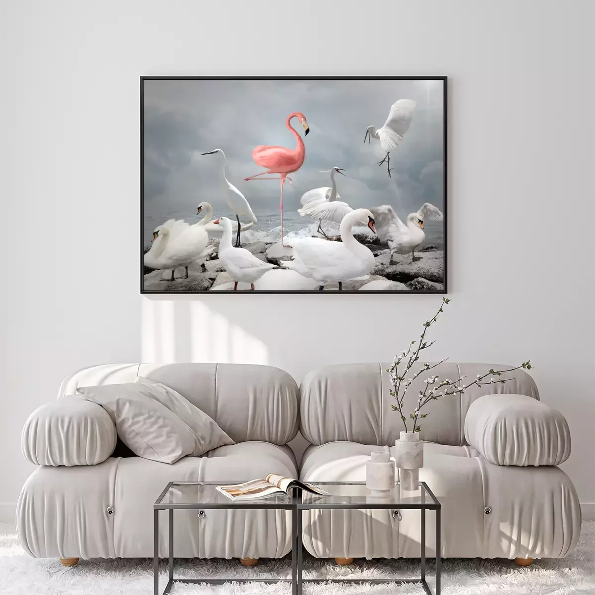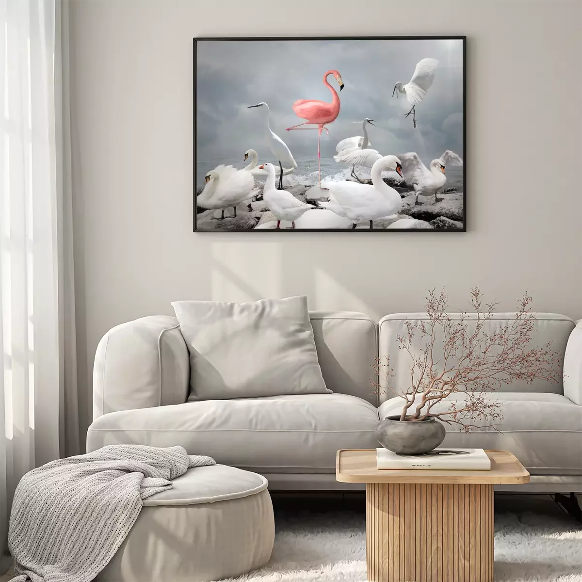 Poster: Majestätischer Flamingo unter weißen Vögeln