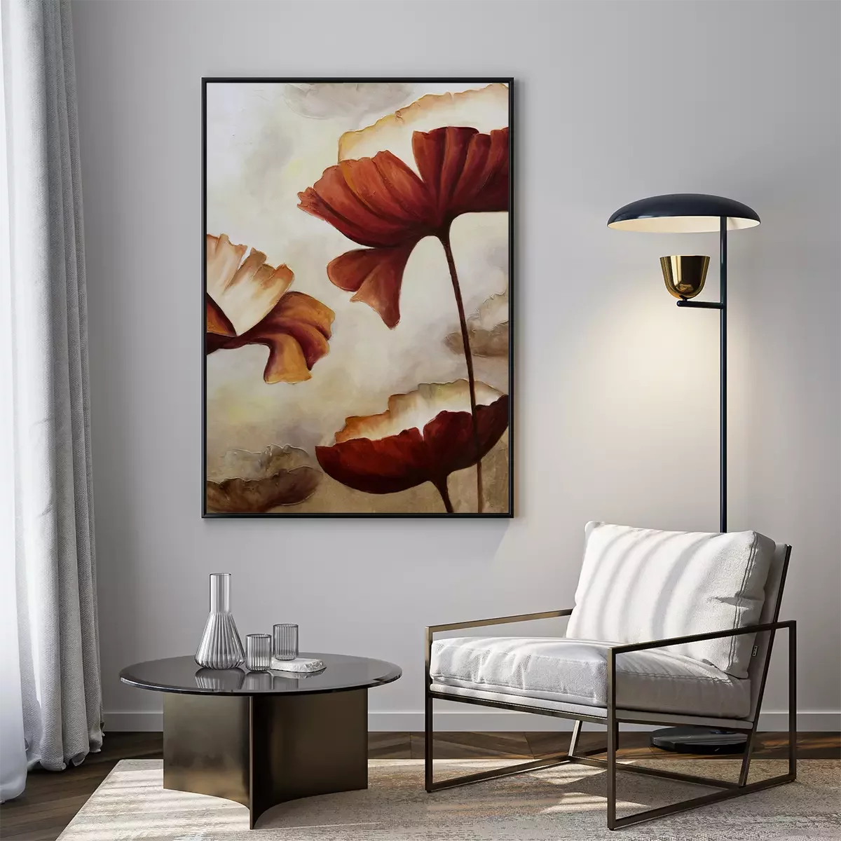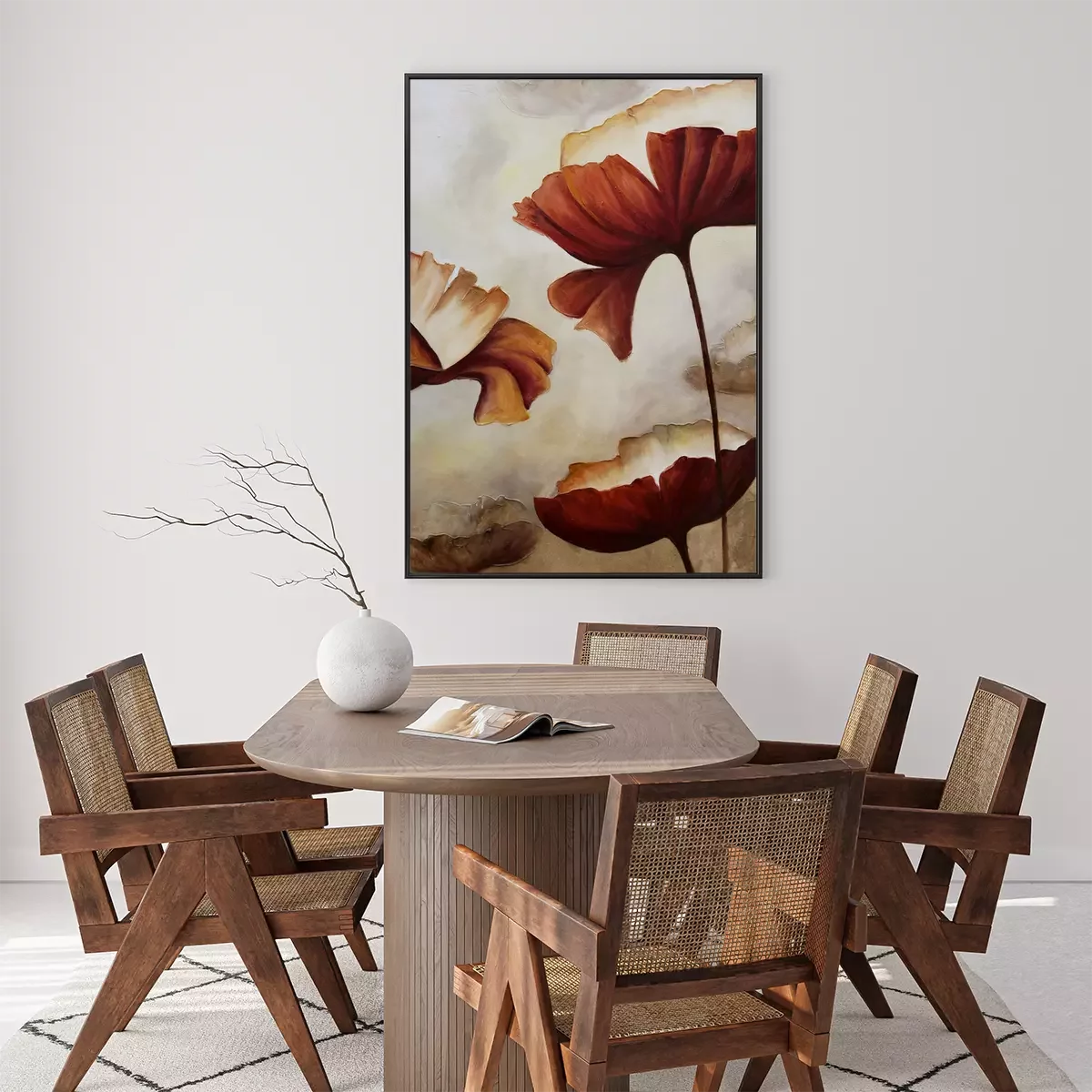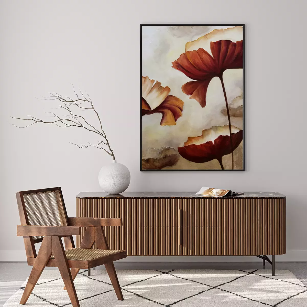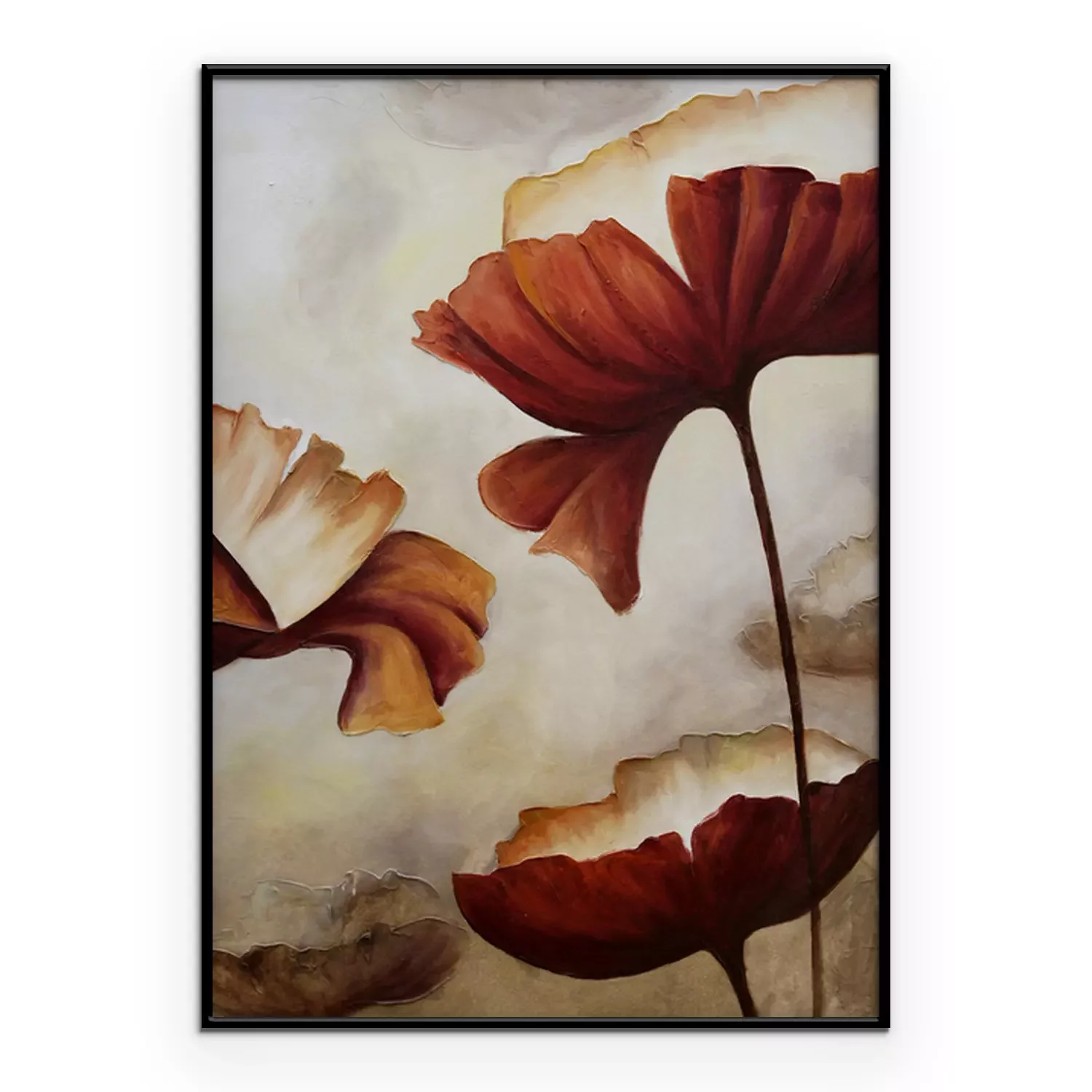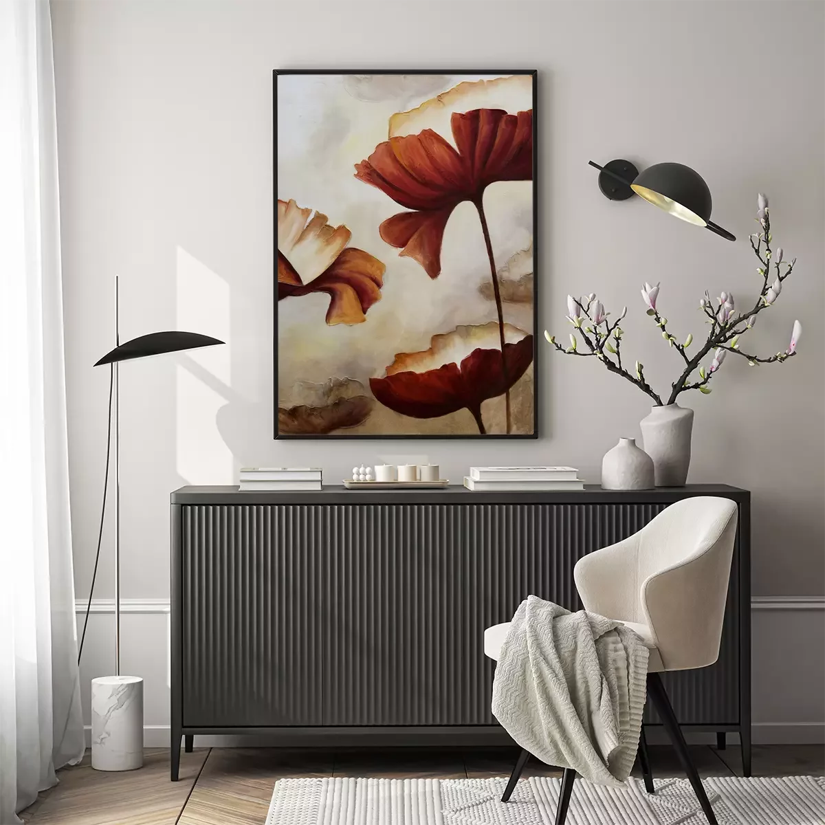 Das Poster Retro mit Blumenmotiv, das wir ausgewählt haben, hat etwas Einzigartiges an sich. Obwohl die Farbgebung an eine sepiafarbene Fotografie erinnert, ist die Form der Mohnblumen äußerst modern und minimalistisch und platziert die Dekoration irgendwo zwischen einer modernen und einer alten Ästhetik. Dadurch ist das Design vielseitig einsetzbar und bietet zahlreiche Gestaltungsmöglichkeiten. Besonders hervorzuheben ist das Motiv dieses Posters. Aquarell ist das Erste, was einem in den Sinn kommt, wenn man unsere Wanddekoration betrachtet. Doch obwohl es sich um einen Druck handelt, ahmt das Motiv die Technik der Aquarellmalerei perfekt nach. Dies verleiht dem Poster Retro einen künstlerischen Charakter. Besonders bemerkenswert ist auch, dass Blumenmotive zeitlos schön sind und nie aus der Mode kommen. Vor allem solche, die einen modernen, manchmal sogar abstrakten Charakter haben. Für welche Räume empfehlen wir dieses Poster? Mohnblumen passen hervorragend zu traditionellen oder rustikalen Stylings, in denen eine warme Farbpalette mit Beige, Braun und Orange dominiert. Eine interessante Idee wäre es, diese Dekoration in einem industriellen Raum aufzuhängen. An einer Betonwand erhält einen ganz anderen Charakter dieses Poster. Aquarell mit Mohnblumen lässt sich auch gut in ein romantisch eingerichtetes Schlafzimmer einfügen, wenn es über dem Bett hängt. In Kombination mit einem Kopfteil aus Weidengeflecht kommt das gesamte Interieur wunderschön zur Geltung. Bei diesem Design ist es wichtig, auf den passenden Rahmen zu achten. Ein Holzrahmen eignet sich für rustikale, romantische, Öko- und traditionelle Arrangements, während ein schwarzer Aluminiumrahmen in minimalistischen und industriellen Umgebungen besser zur Geltung kommt. Dank der Originalität dieses Posters Mohnblumen werden über viele Jahre hinweg das Zuhause schmücken, ohne dass sie langweilig werden oder aus der Mode kommen. Der elegante Charakter des Musters macht es auch zu einer geeigneten Dekorationsoption für Büros, Cafés, Wartezimmer oder verschiedene Arztpraxen.