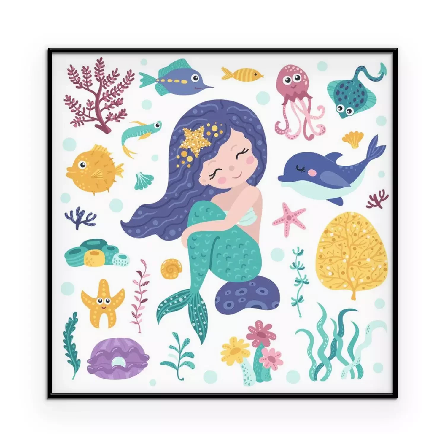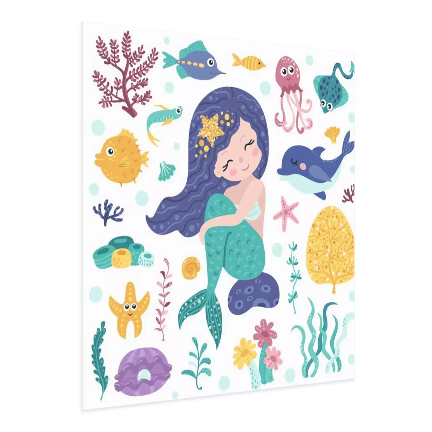 Poster: Meerjungfrau auf einem Felsen und bunte Fische