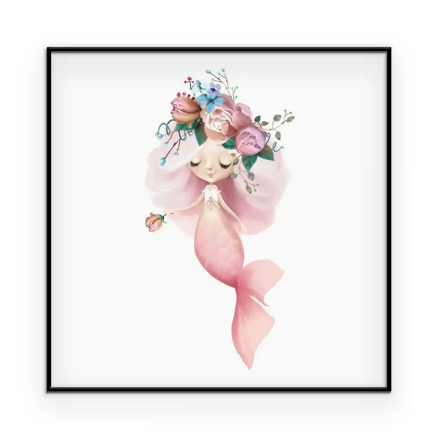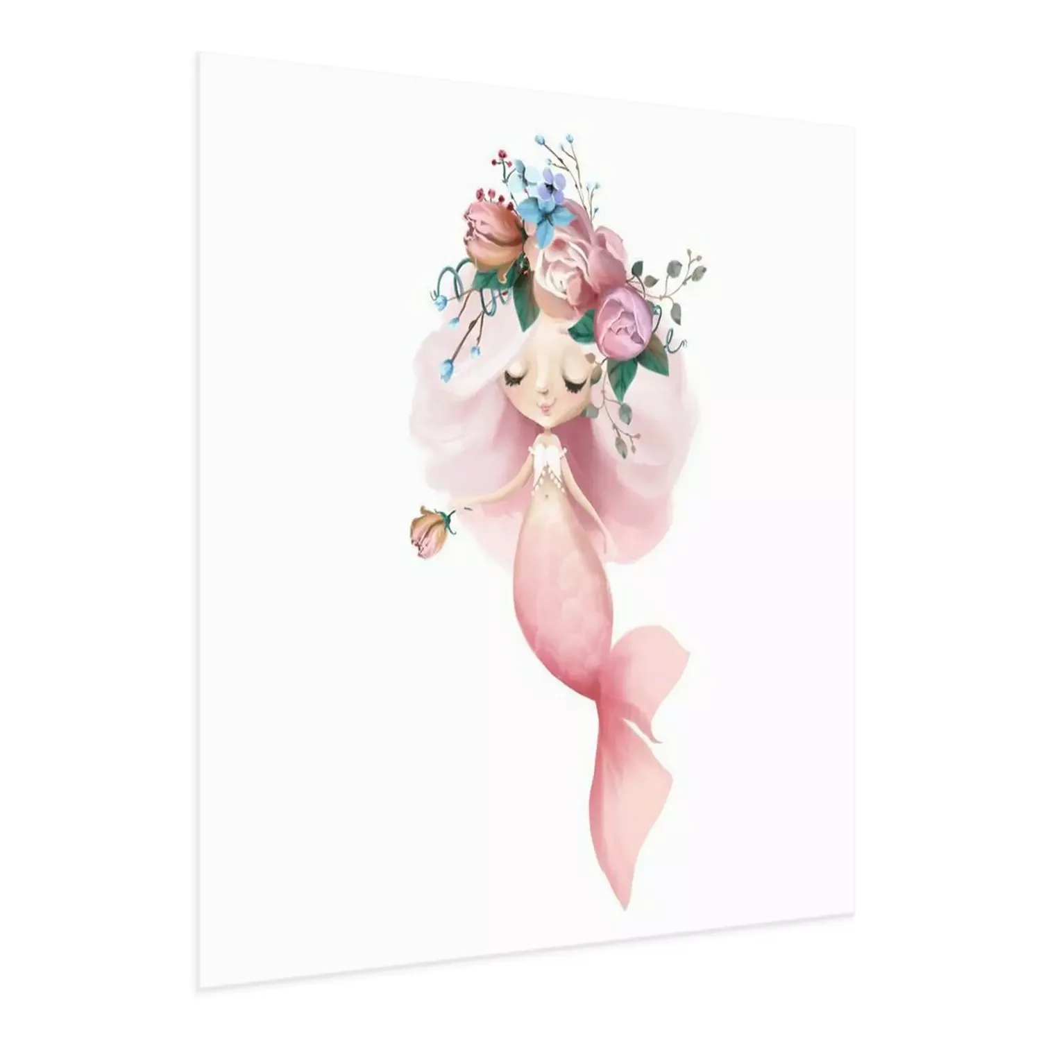 Wir wissen genau, was ein perfektes Poster für Mädchen zeigen sollte. Wir haben eine besonders schöne Illustration mit einer märchenhaften Meerjungfrau entworfen – mit pastellfarbenen Haaren und einer rosa Flosse. Im Gegensatz zu den üblichen Darstellungen ist unsere Nixe nicht mit Muscheln oder Seesternen geschmückt, sondern trägt einen Kranz aus üppigen Rosen. Diese Komposition sieht sowohl in kleinen als auch in großen Formaten wunderschön aus, so dass du leicht die passende Variante für das Zimmer deiner Tochter auswählen kannst. Der Bereich über dem Bettchen ist ein idealer Platz für ein solches Poster. Meerjungfrau begleitet das Kind beim Einschlafen und macht die Nacht weniger unheimlich. Eine andere Möglichkeit ist die Wand über dem Schreibtisch, an dem das Kind seine Hausaufgaben macht oder zeichnet. Hier wird das Poster für Mädchen zur Inspiration für kreative Zeichnungen mit Unterwassermotiven. Unsere Kollektion umfasst viele Wanddekorationen mit Märchenfiguren, mit denen du eine Gallery Wall gestalten kannst. Wähle einfach mehr Poster. Nixe harmoniert besonders schön mit anderen Meerjungfrauen. Du kannst einen beeindruckenden Triptychon-Effekt erzielen, indem du drei Illustrationen nebeneinander aufhängst – jede mit einer anderen Haar- und Flossenfarbe. Eine weitere Möglichkeit besteht darin, das Poster mit Abbildungen von Meeresbewohnern wie Fischen, Seepferdchen oder Seesternen zu kombinieren. Das Poster Meerjungfrau, an die Wand gehängt, bringt im Handumdrehen eine märchenhafte Atmosphäre in dein Interieur. Unser Produkt eignet sich auch für Einrichtungen wie Kinderkrippen und Kindergärten oder für Geschäftsräume, die für Kinder bestimmt sind. Dazu gehören Spielecken in Restaurants und Cafés sowie Wartezimmer in Arztpraxen. Dies ist eine einfache Möglichkeit, um den Raum viel freundlicher zu gestalten. Hänge es an die Wand und erlebe selbst, wie viel eine solche Deko im Raum bewirken kann, wie dieses Poster. Nixe in Kombination mit anderen Wanddekorationen schafft überall eine kinderfreundliche Umgebung.