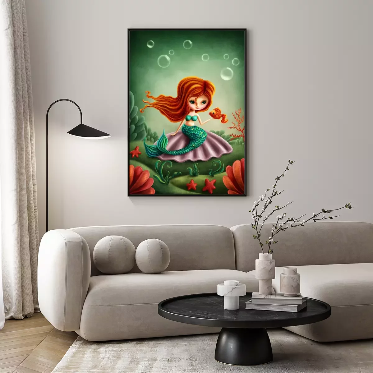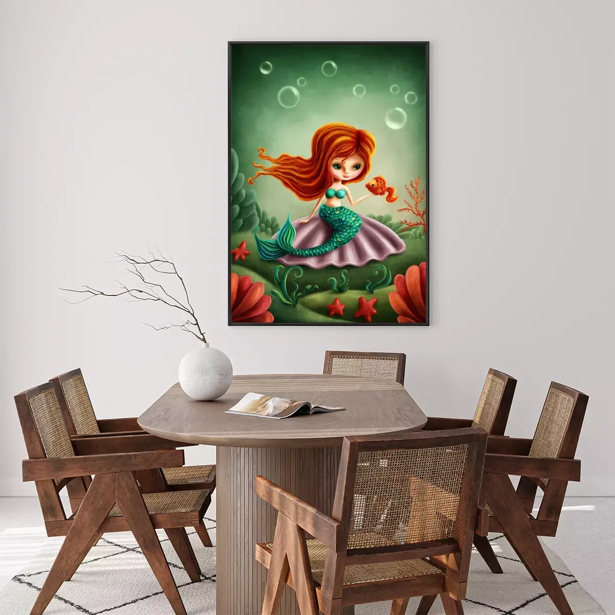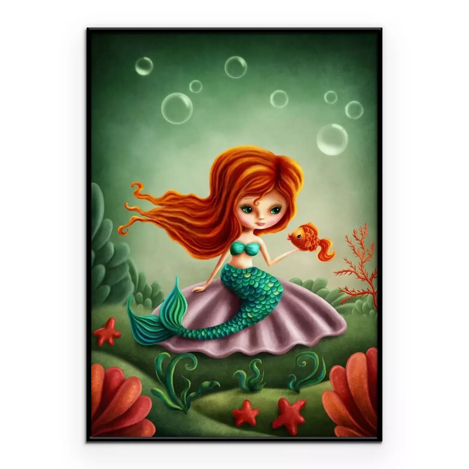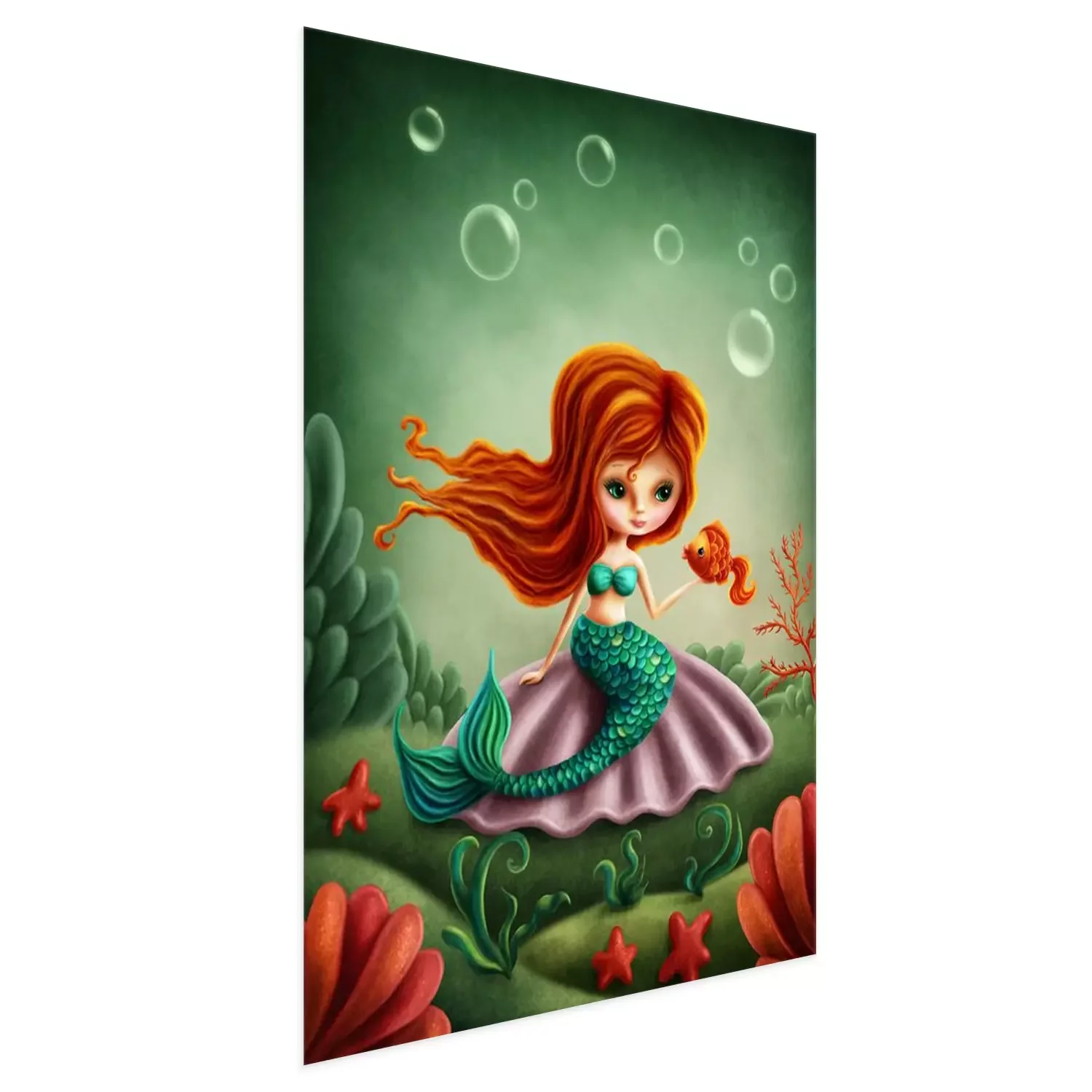 Poster: Meerjungfrau mit rotem Haar und grünem Schwanz und Goldfisch