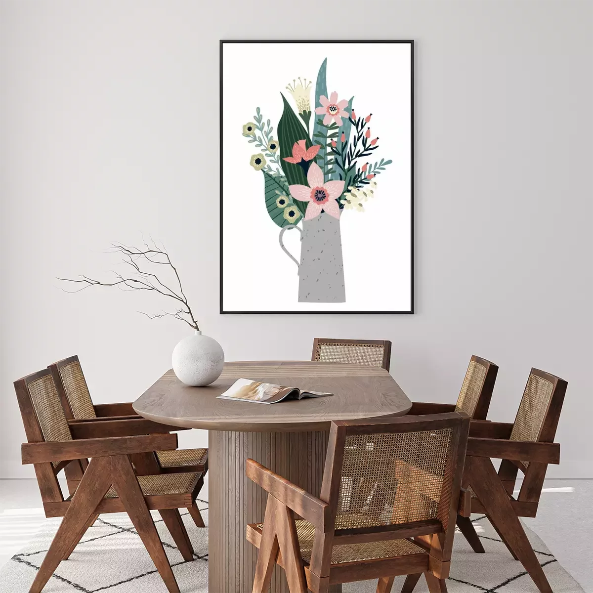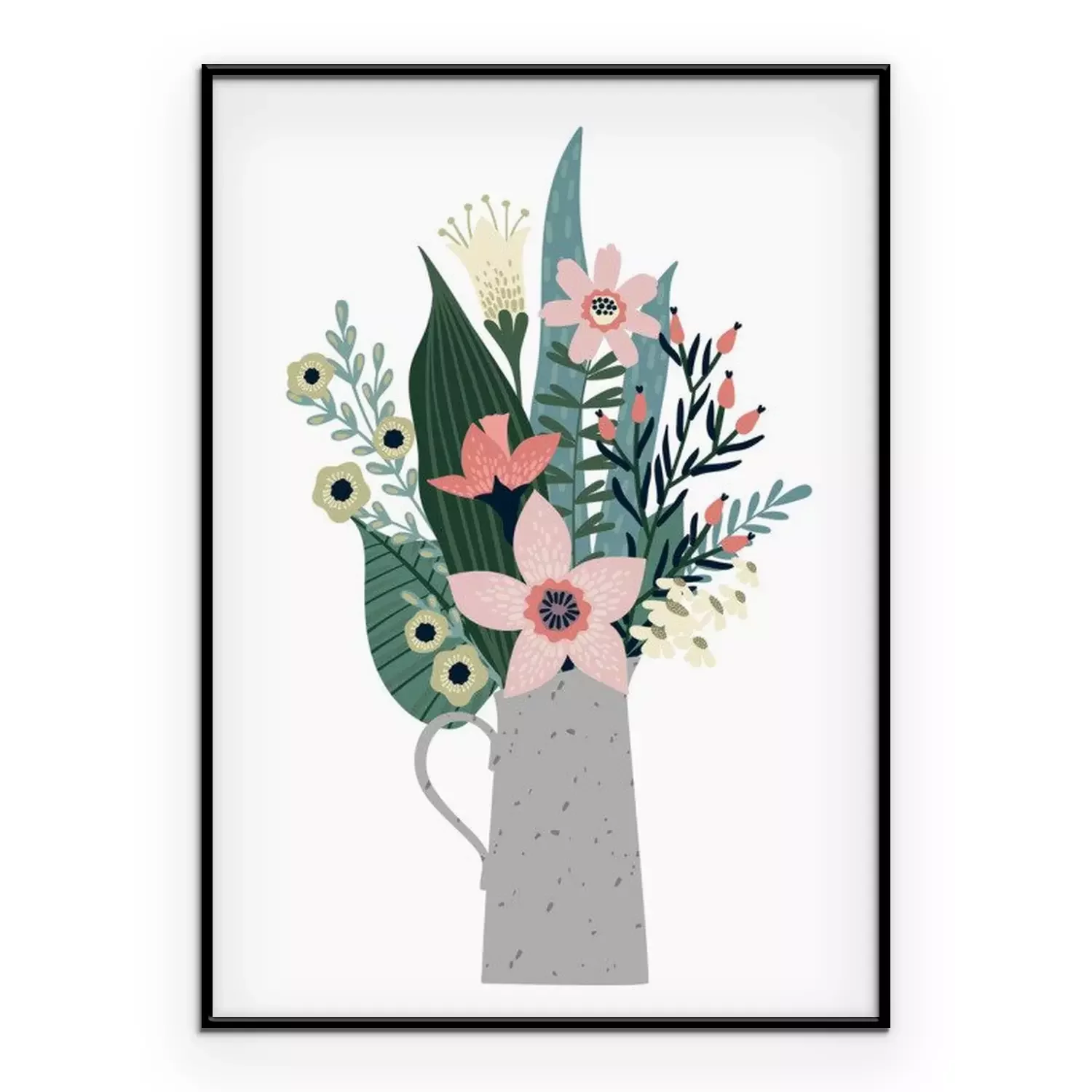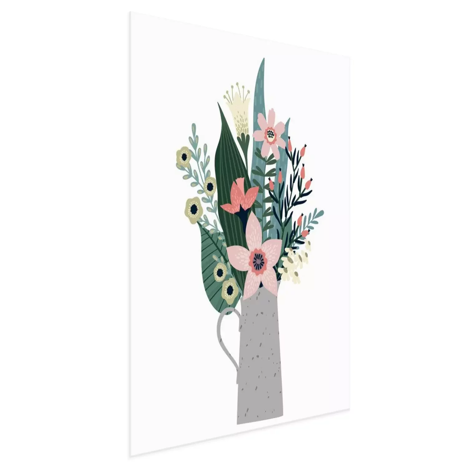 Poster: Mehrfarbige Blumen und große Blätter in einer Vase