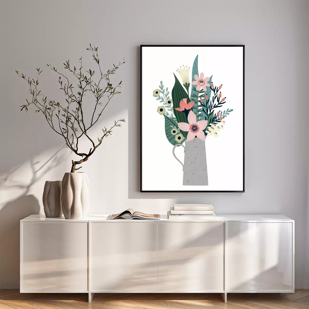 Poster Mehrfarbige Blumen und große Blätter in einer Vase