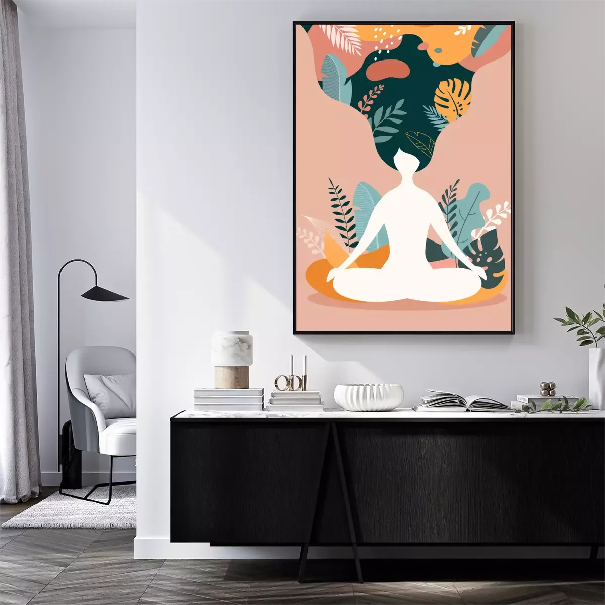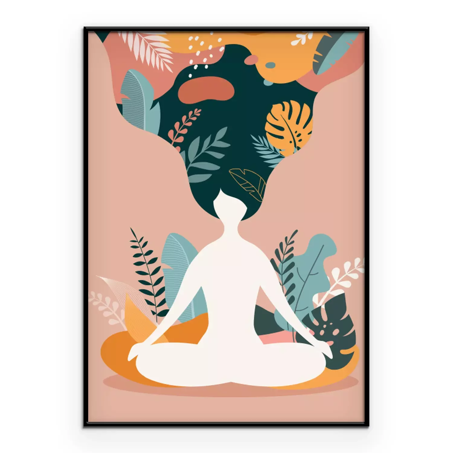 Figur einer meditierenden Frau zwischen exotischen Blättern