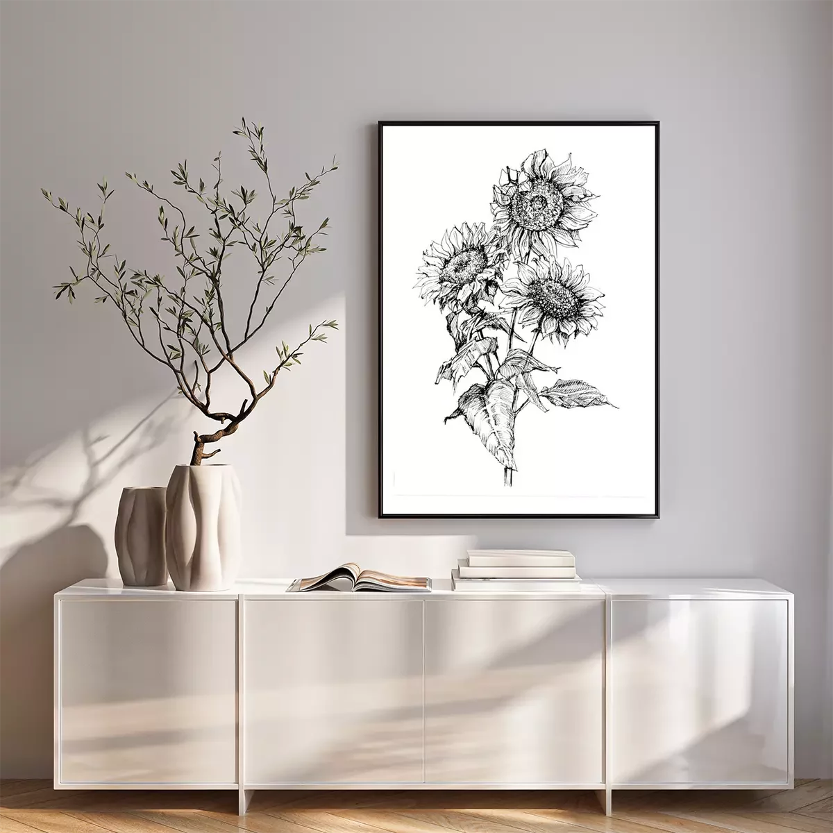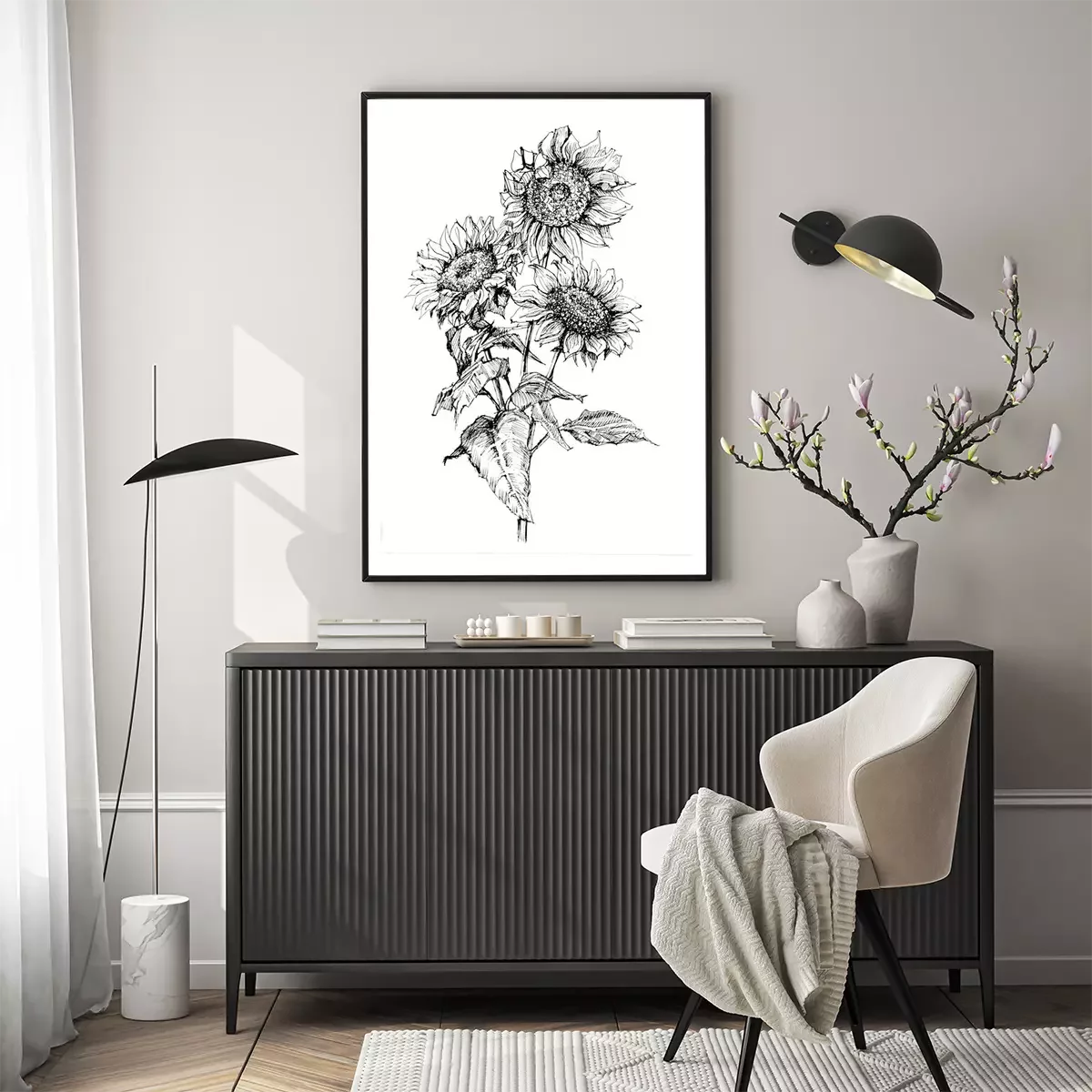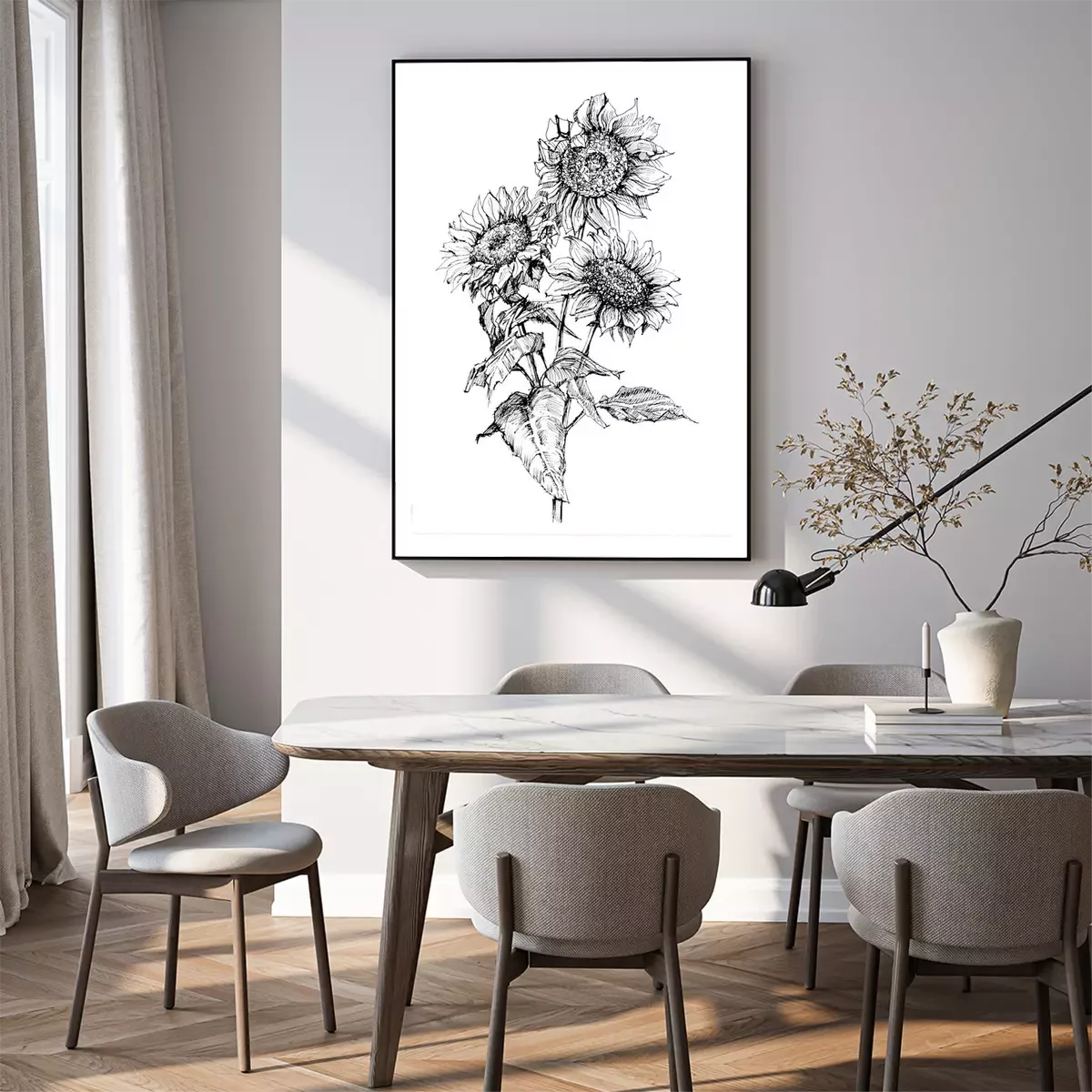 Poster: Minimalistische Sonnenblumen mit schwarzem Strich gemalt