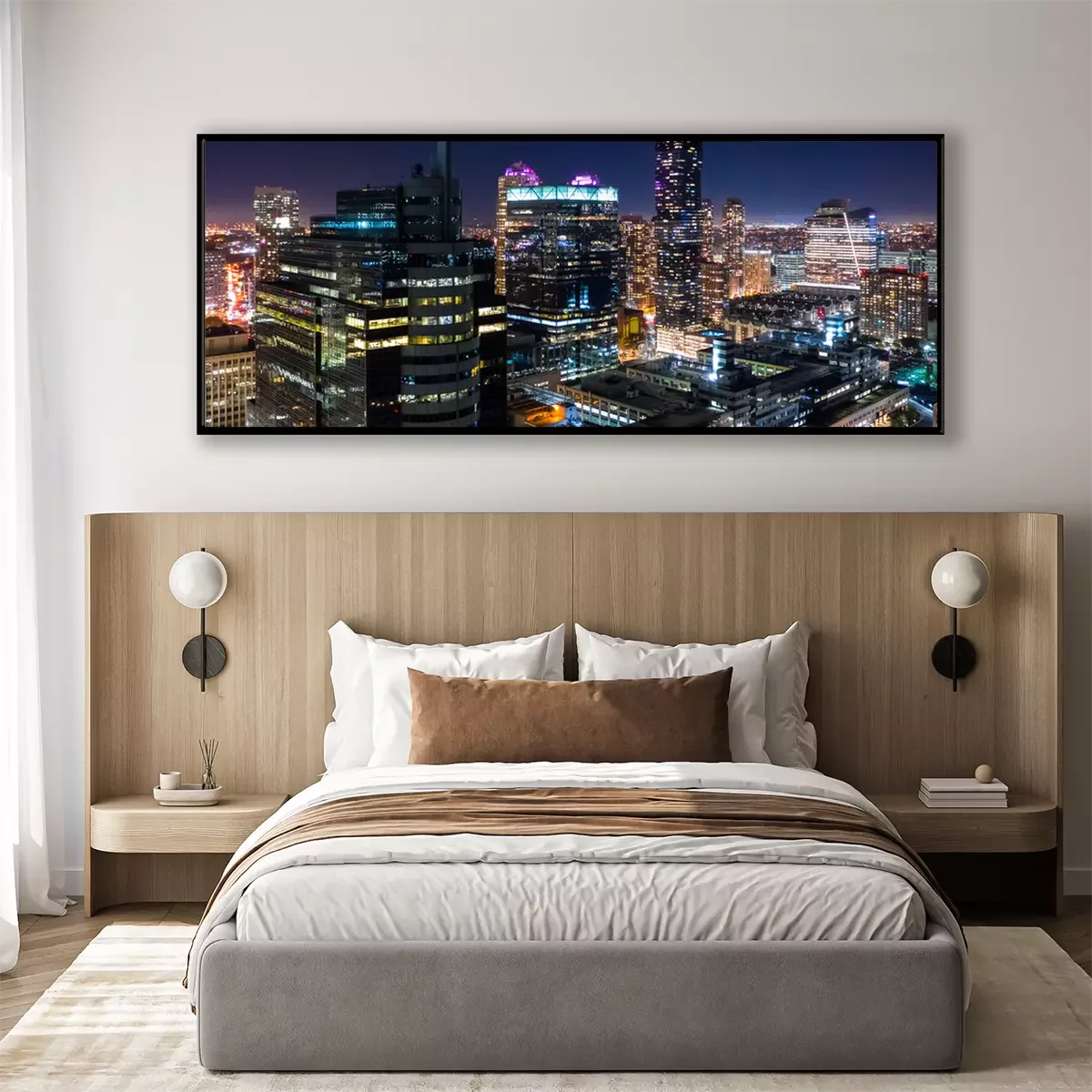 Aerial panorama of New York City skyscrapers at dusk as seen from above the 29th street, close to Hudson Yards and Chelsea neighborhood