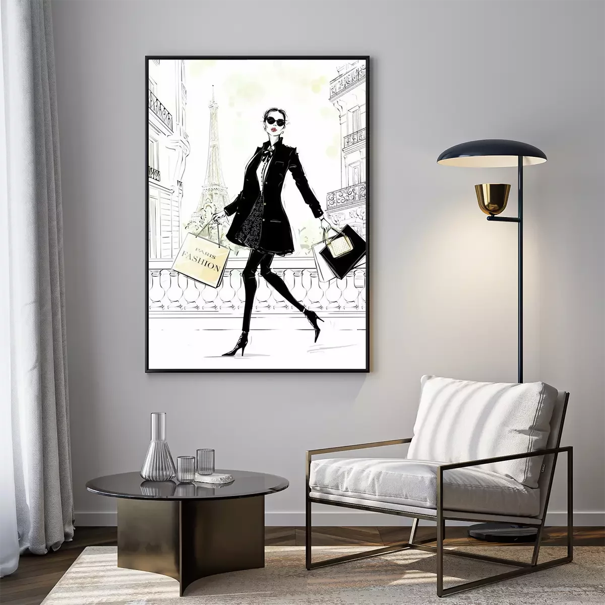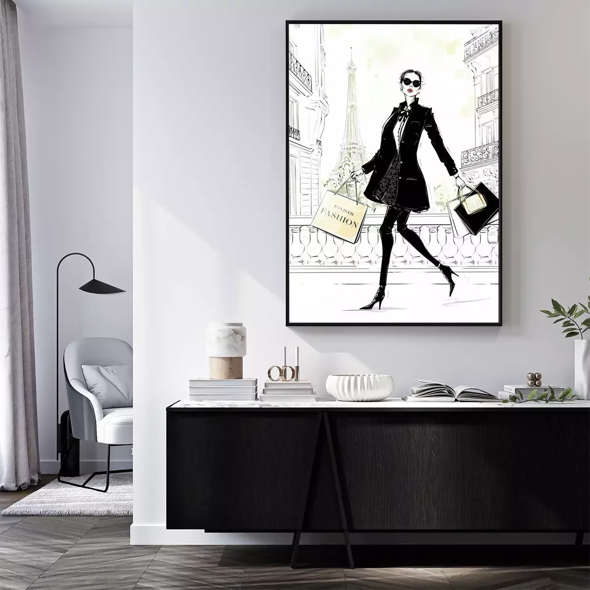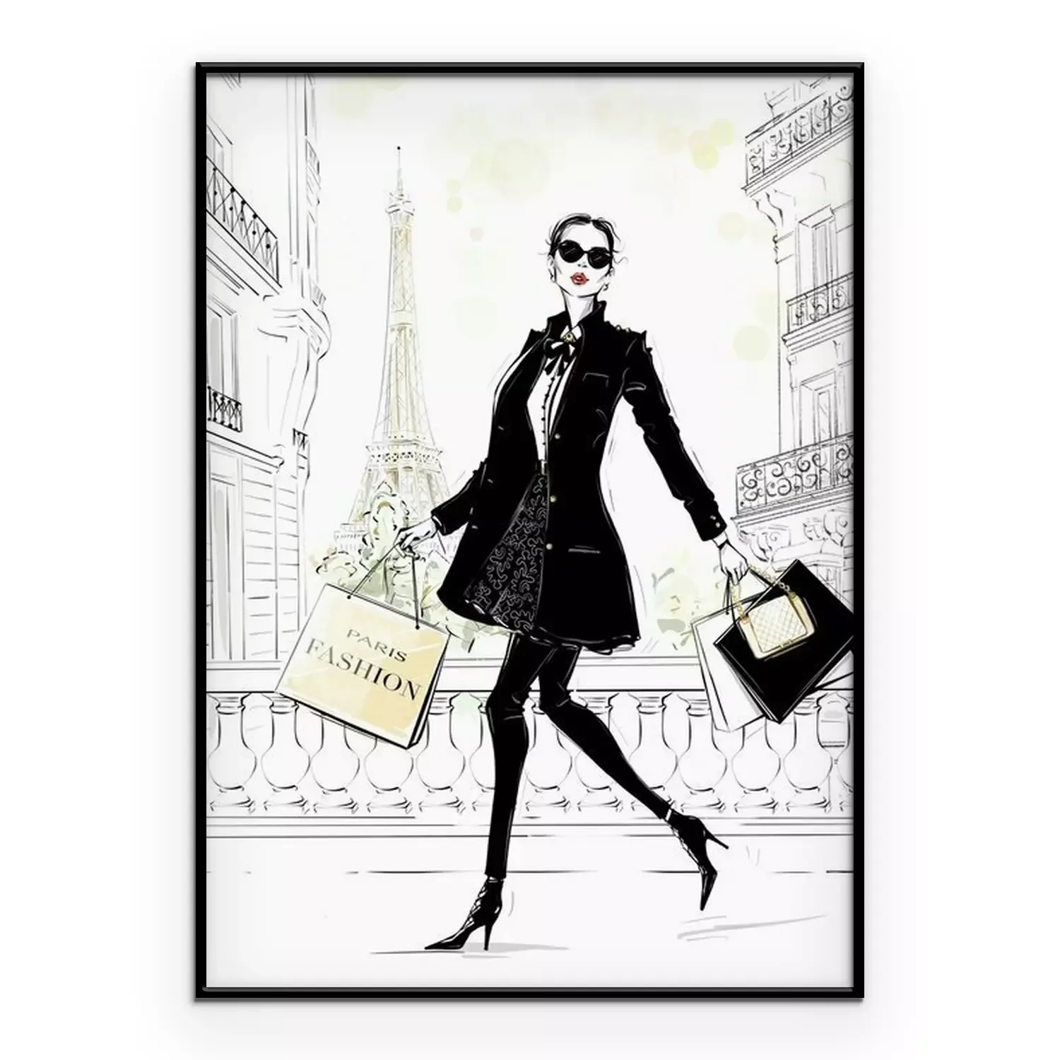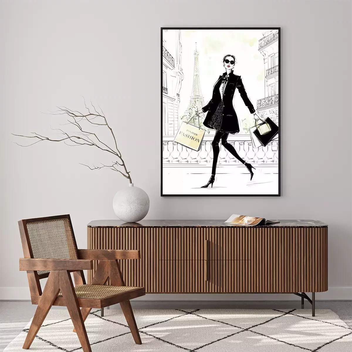 Hand drawn beautiful young woman in black dress. Fashion woman with bag. Girl in black shoes with Paris street background. Sketch. Fashion illustration.