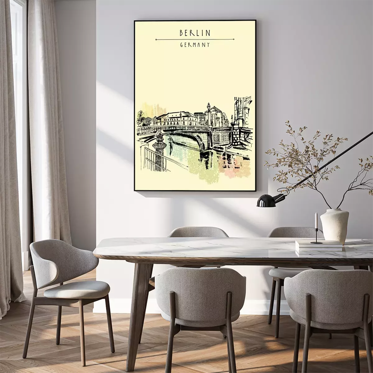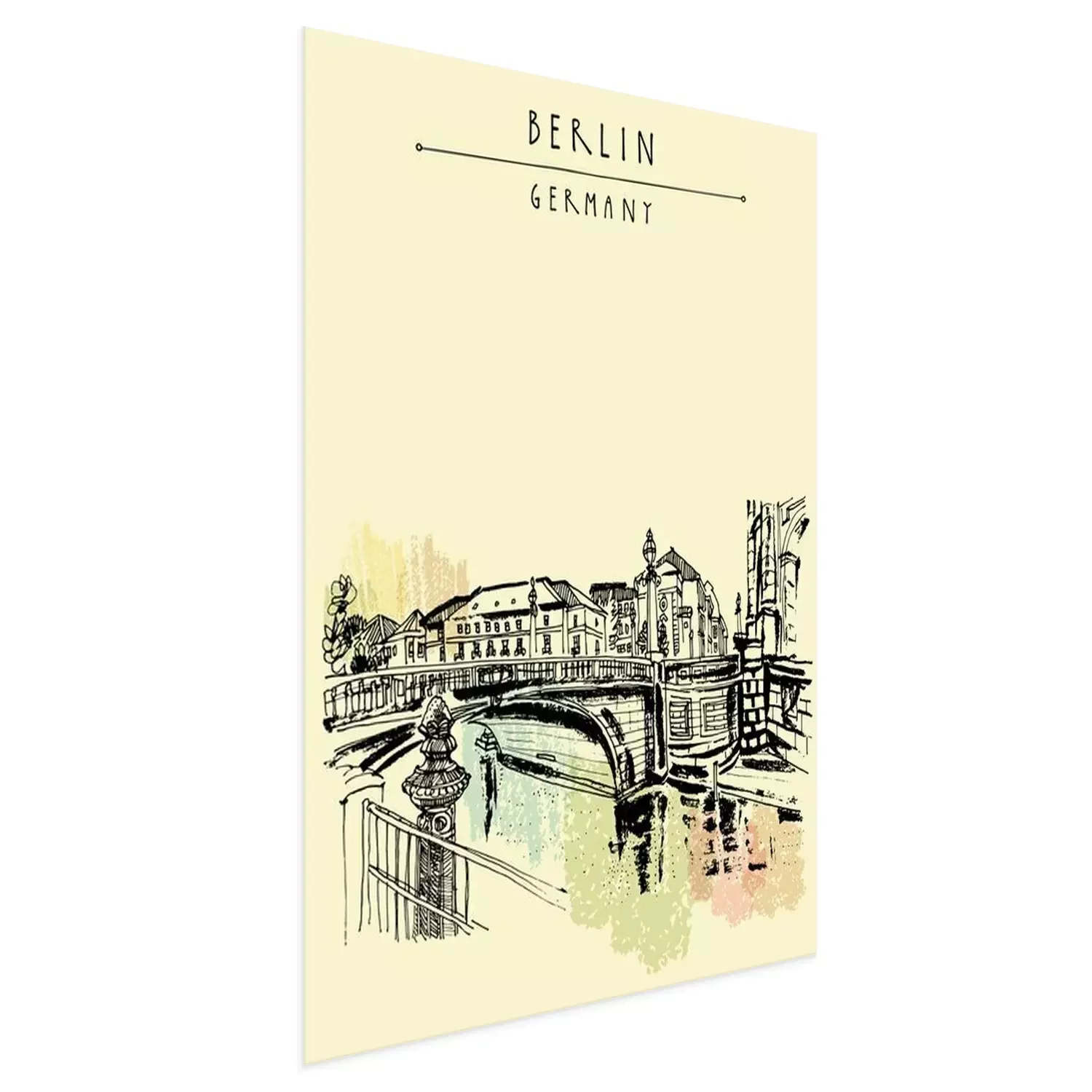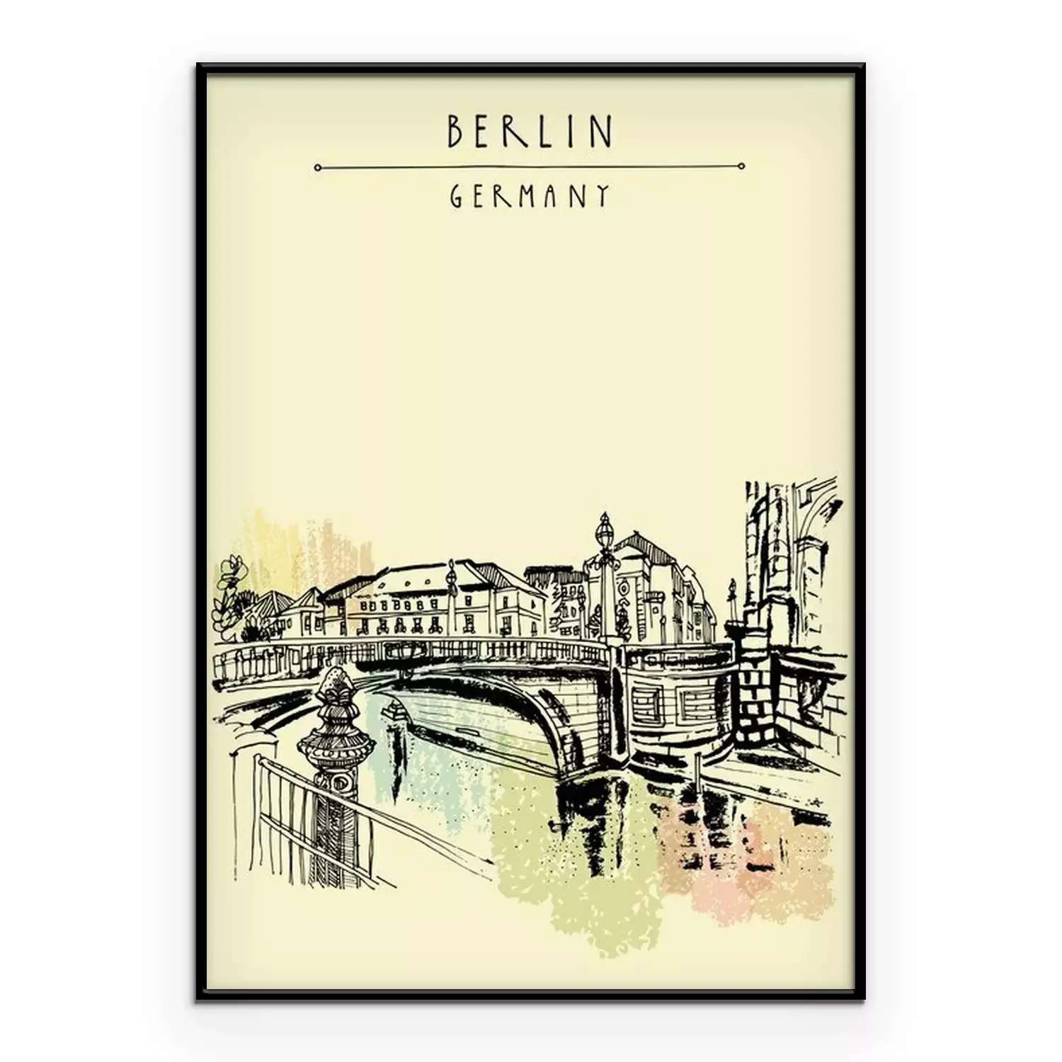 Poster: Monbijou-Brücke in Berlin, Deutschland, Europa. Fluss Spree, Flussufer. Handzeichnung. Reise-Skizze. Vintage touristische Postkarte, Plakat, Buchillustration