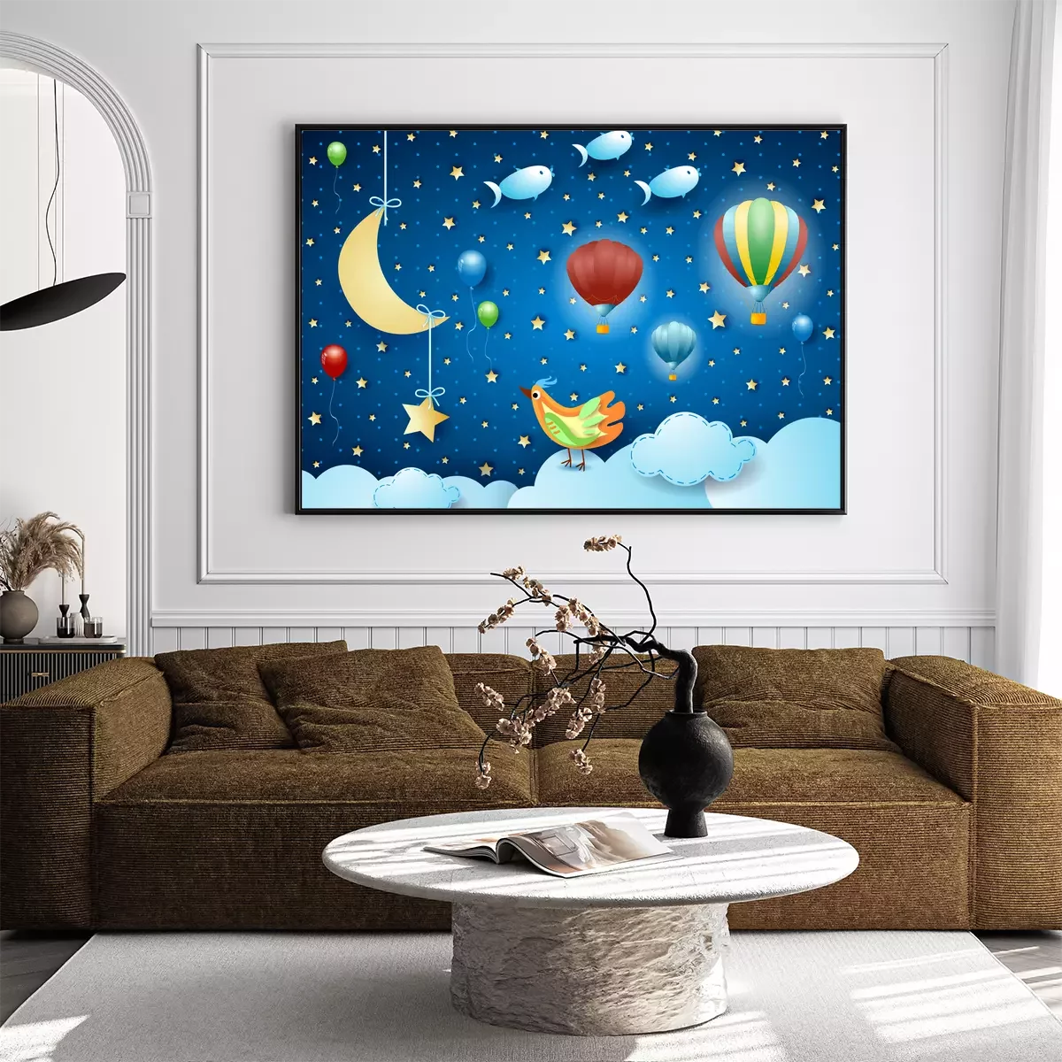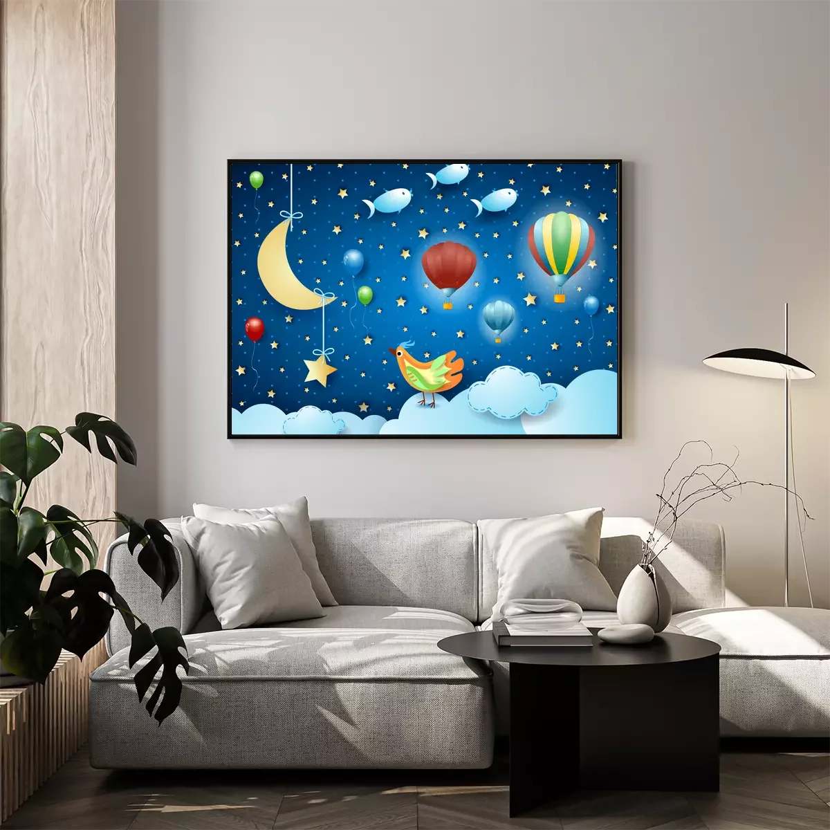 Poster Mond, Sterne und Luftballons zwischen den Wolken