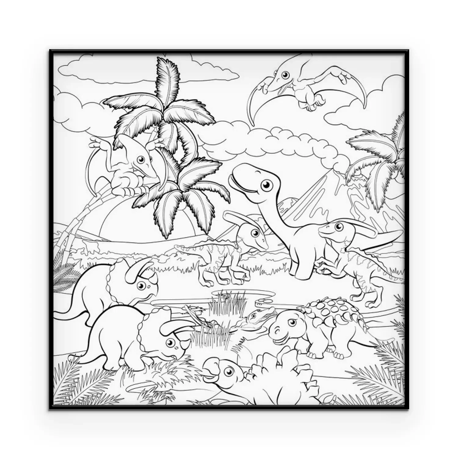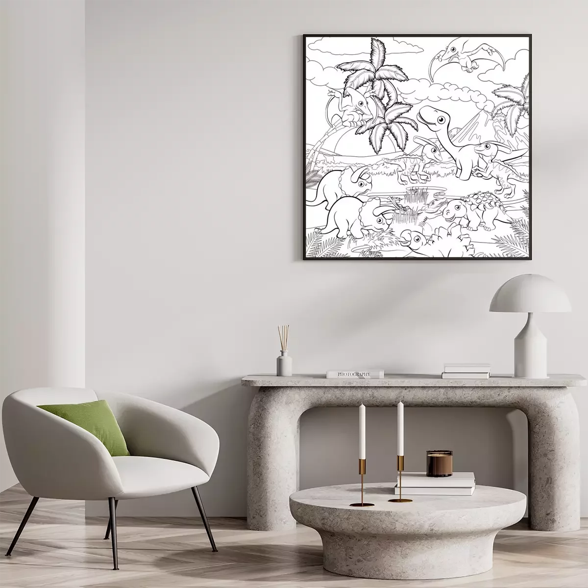 Poster: Monochrome Grafik einer prähistorischen Landschaft mit Dinosauriern